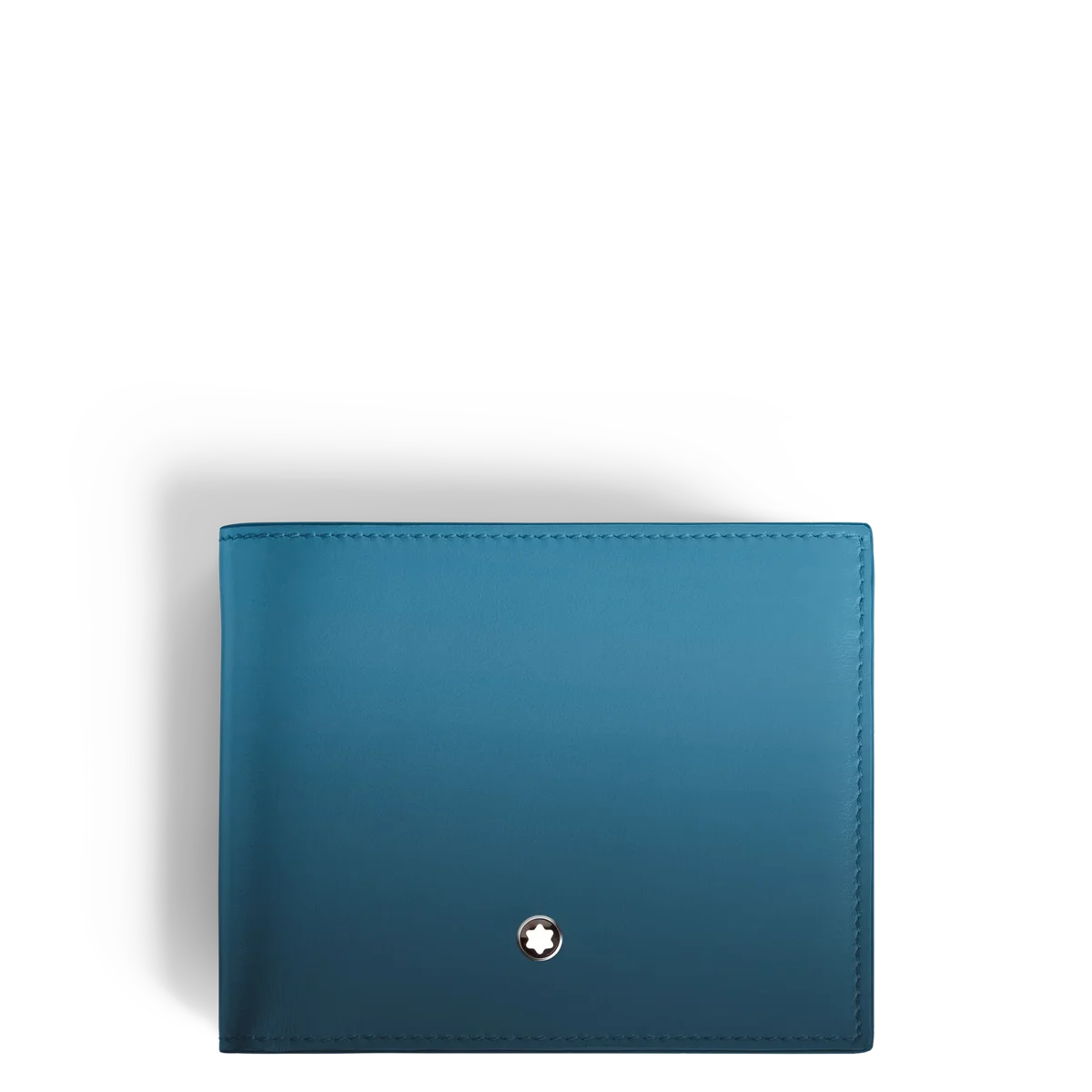 Meisterstück-tegnebogen er et luksuriøst tilbehør til hverdagen, fremstillet i dybt skinnende, røget blåt læder med en manuelt påført sfumato-effekt. Den er elegant og funktionel og har plads til op til seks kreditkort i de dertil indrettede rum. To rum til sedler og kvitteringer samt to ekstra lommer til sedler giver tegnebogen ekstra opbevaringsplads.