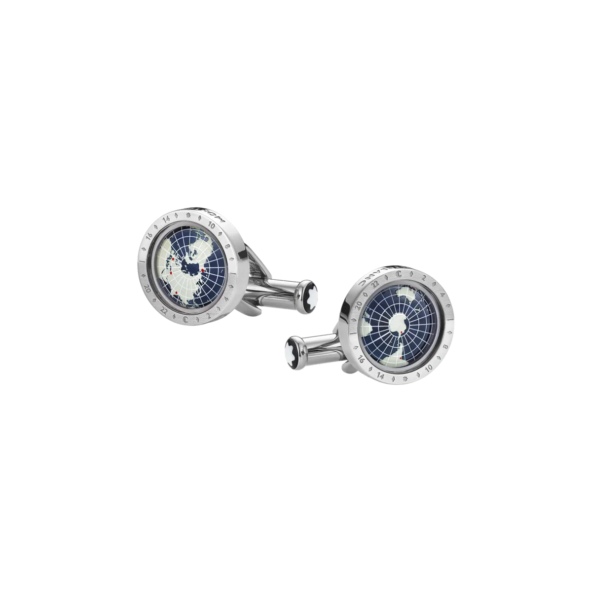 1858 Geosphere manchetknapperne afspejler deres tid. Halvkuglen med alle detaljerne skaber et smykke, der afslører en konstellation, og som trækker på etoset om at kigge op mod stjernerne for at finde sin vej mod en blå baggrund. 1858 Geosphere-kollektionen er en hyldest til designet i Montblanc 1858 Geosphere-urkollektionen.