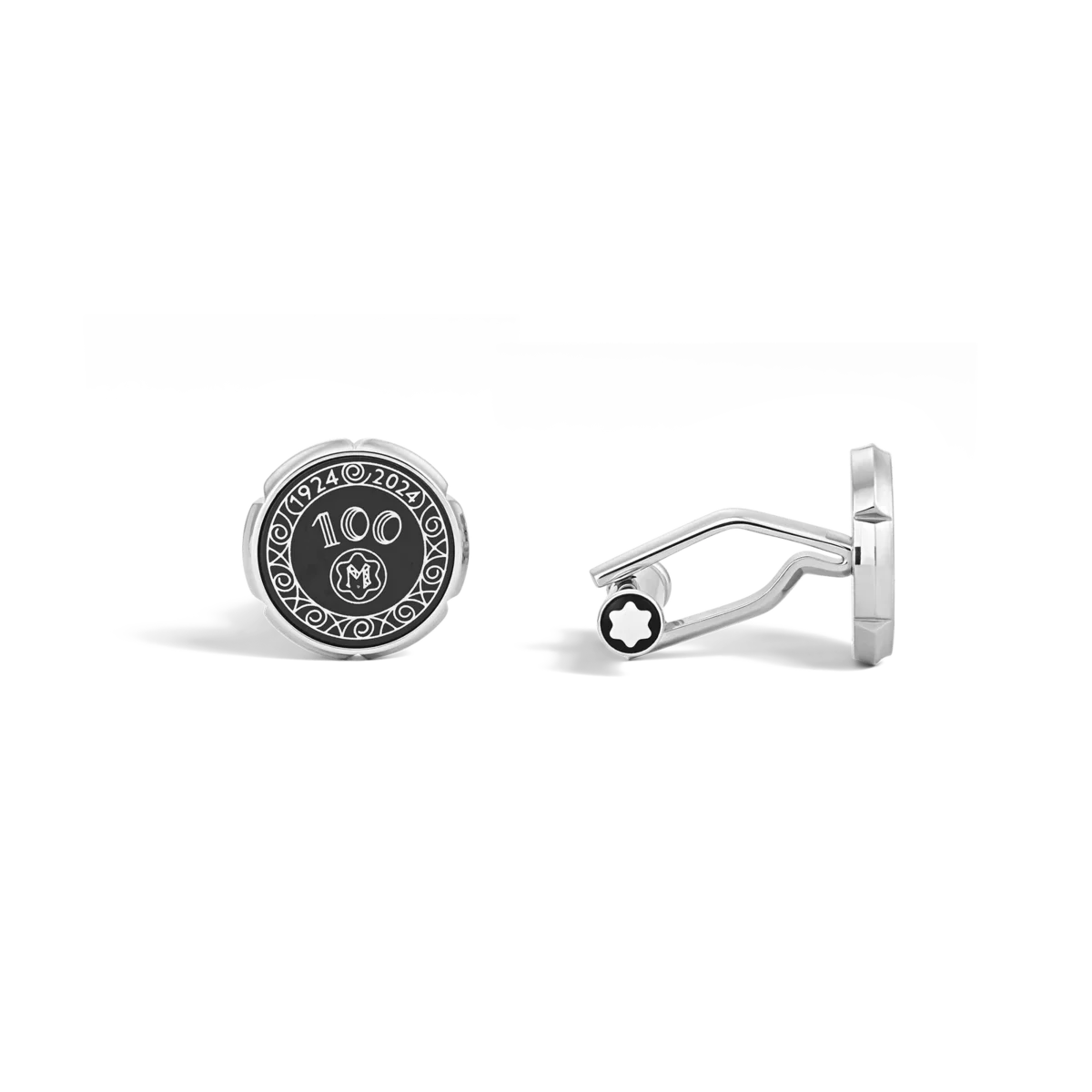 Manchetknapper i rustfrit stål med Meisterstück 100 års jubilæumsnib-dekor i sort lakindlæg