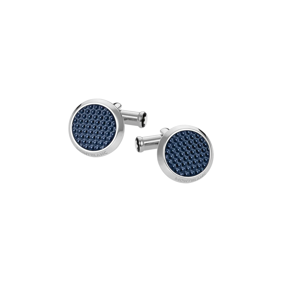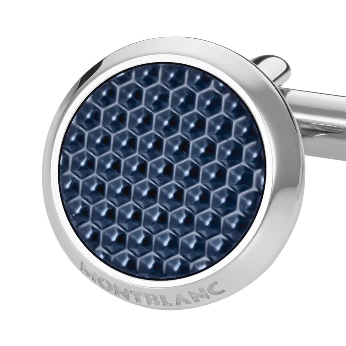 Meisterstück manchetknapper hylder diskret stil og elegance. Med inspiration fra Montblanc Meisterstück-skriveinstrumentet skaber den tidløse runde form i rustfrit stål med indlagt blå lak med sekskantet mønster et smykke med et kraftfuldt Montblanc-signatur.