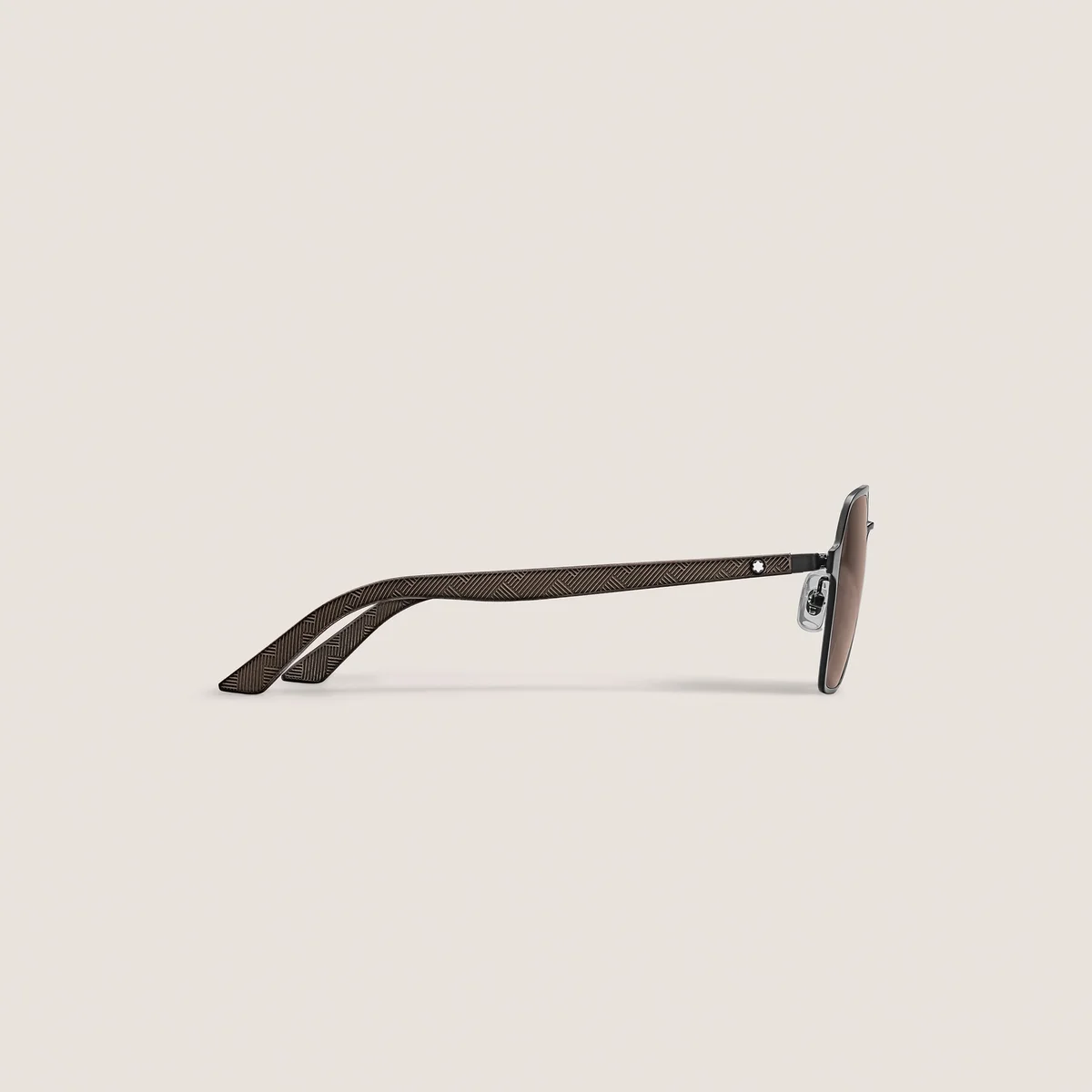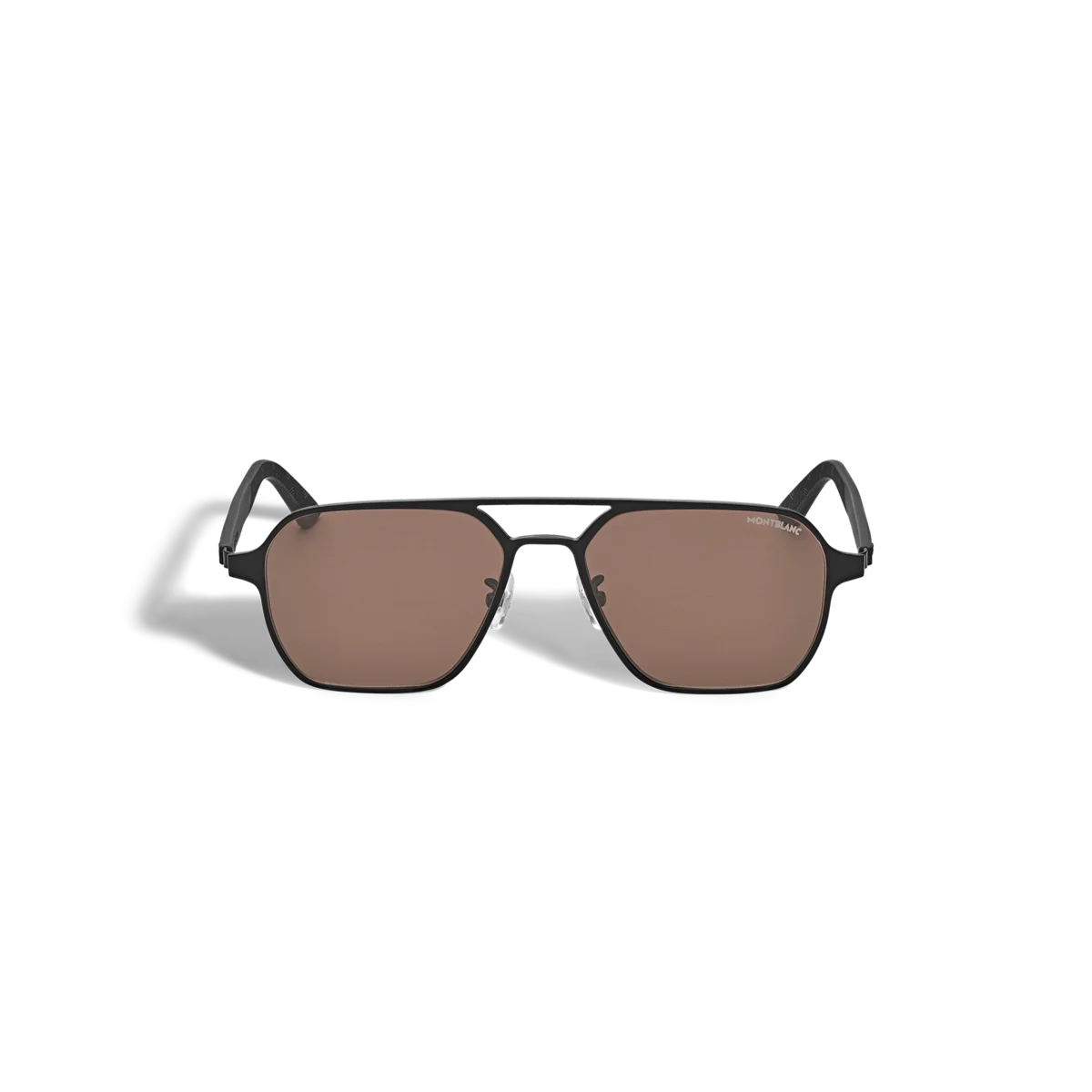 Disse solbriller i firkantet stil har en sort metalstel og brune glas. De har en dobbelt metalbro på forsiden. Montblanc-emblemet er indkapslet i brillestangens design, og brillestangens ender har gummiender med Montblanc Extreme 3.0-mønster for at give et sporty look. Montblanc-logoet er indgraveret på solbrillernes venstre glas.