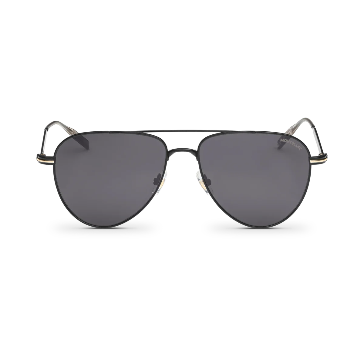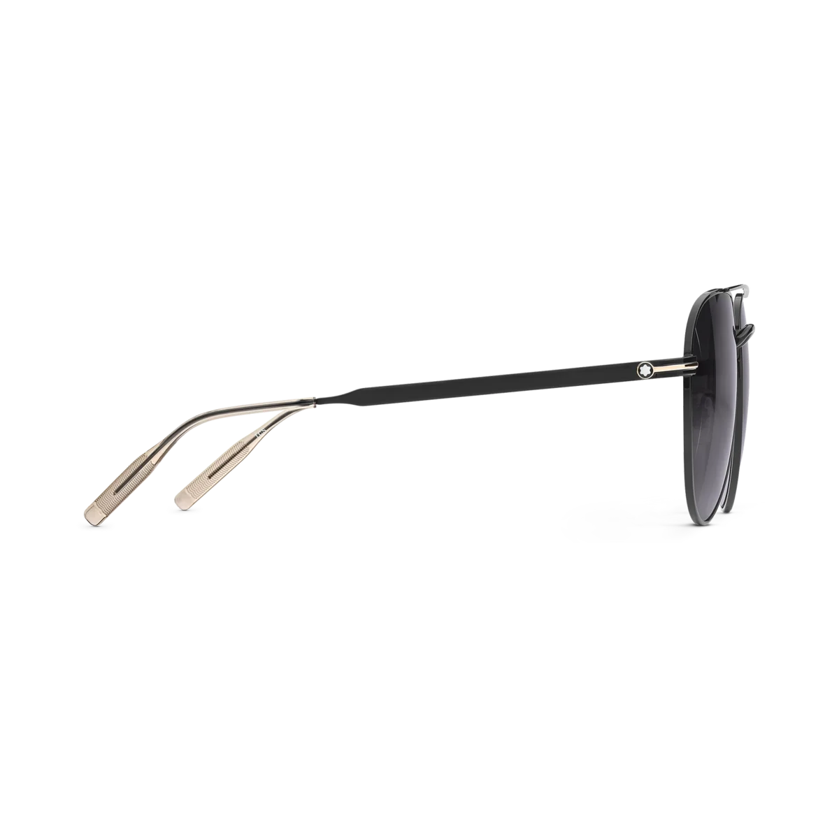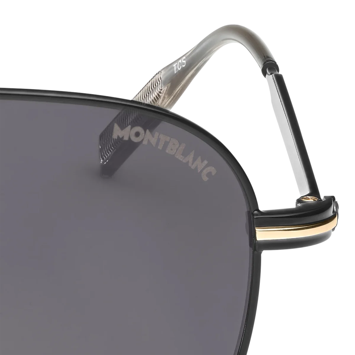 Disse solbriller i firkantet stil har en sort metalstel og grå glas. Solbrillerne har en detalje med tre ringe inspireret af Meisterstück-kollektionen, der forbinder hvert glas med det flydende Snowcap Montblanc-emblem indkapslet i brillestængernes design.