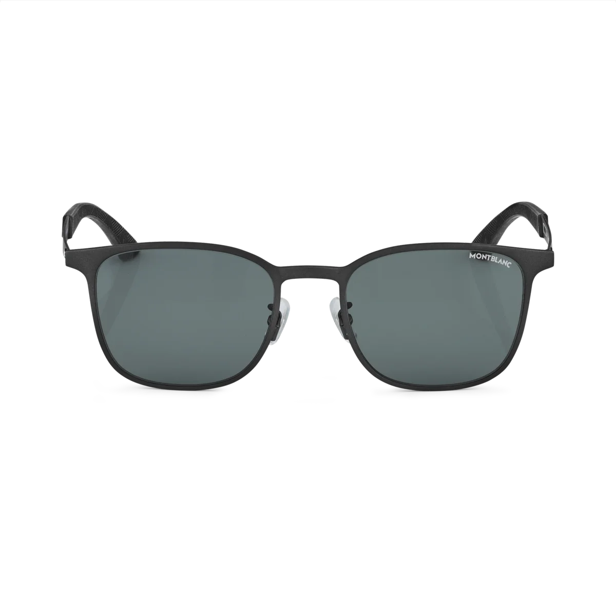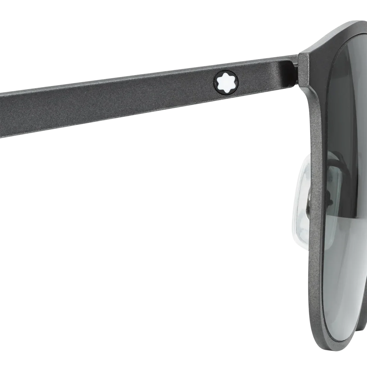Disse firkantede solbriller har en sort metalramme og grå glas. Montblanc-emblemet er indkapslet i brillestangens design med gummiender med Montblanc Extreme 3.0-mønster for at give et sporty look. Montblanc-logoet er indgraveret på solbrillernes venstre glas.