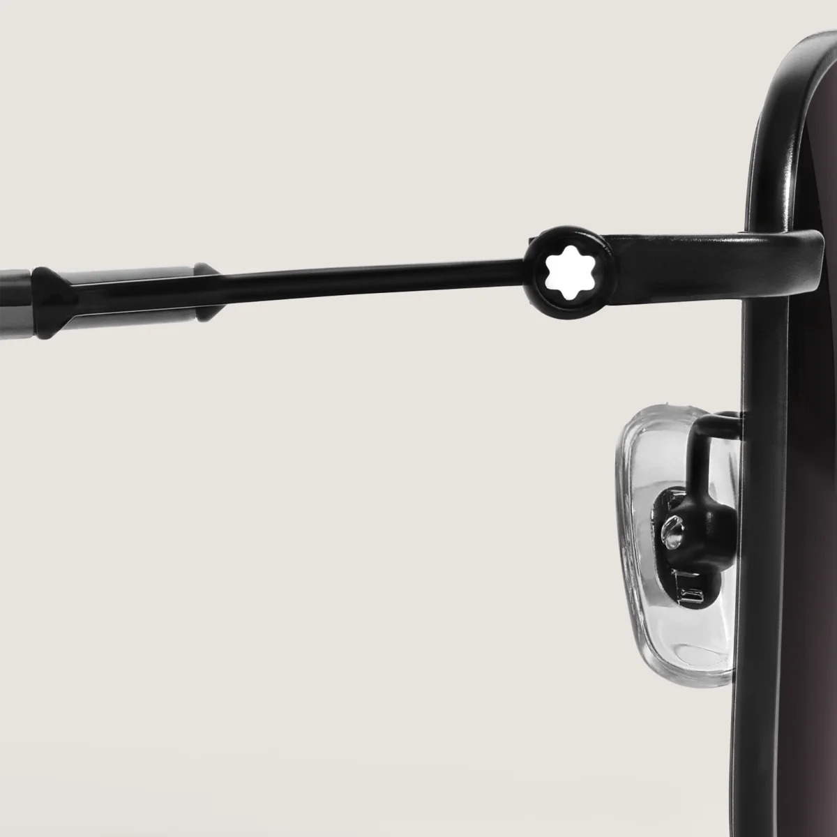 Disse solbriller i firkantet stil har en sort metalramme og grå glas. Montblanc-emblemet er indkapslet i brillestængernes design. Montblanc-logoet er indgraveret på solbrillernes venstre glas, og det skridsikre mønster er indgraveret på indersiden af brillestængernes ender for at øge komforten.