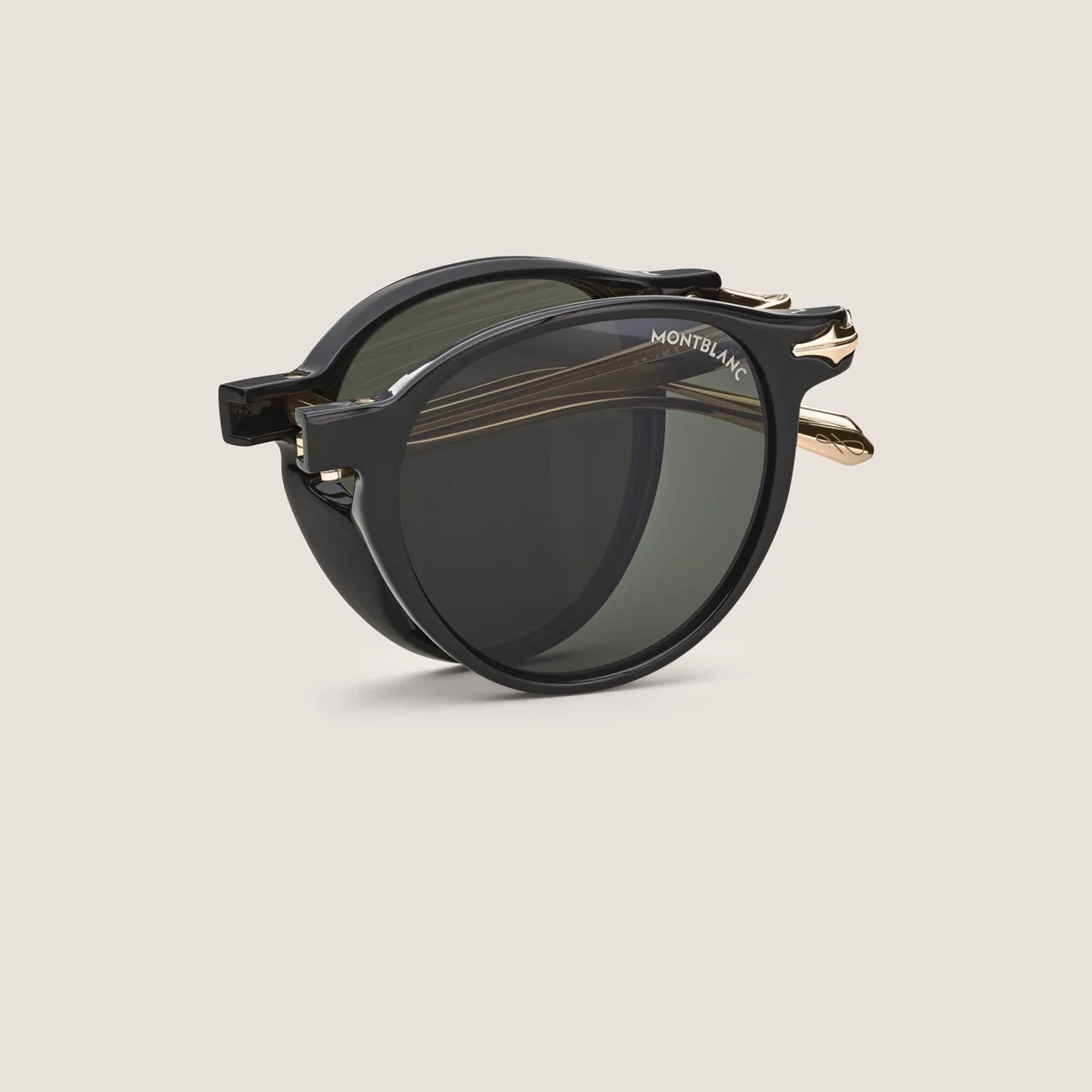 Disse solbriller i oval stil har en sortfarvet indsprøjtet ramme og grå glas. Inspireret af pennenes design er der en dekorativ pen-detalje på metalstelets design. Denne model er fuldt sammenklappelig. Montblancs one line-logo er indgraveret på højre side af brillestangen, og logoet er desuden lasergraveret på venstre glas og en dekorativ detalje er indgraveret på enderne af brillestangen. Identifikationsnummer: MB135569