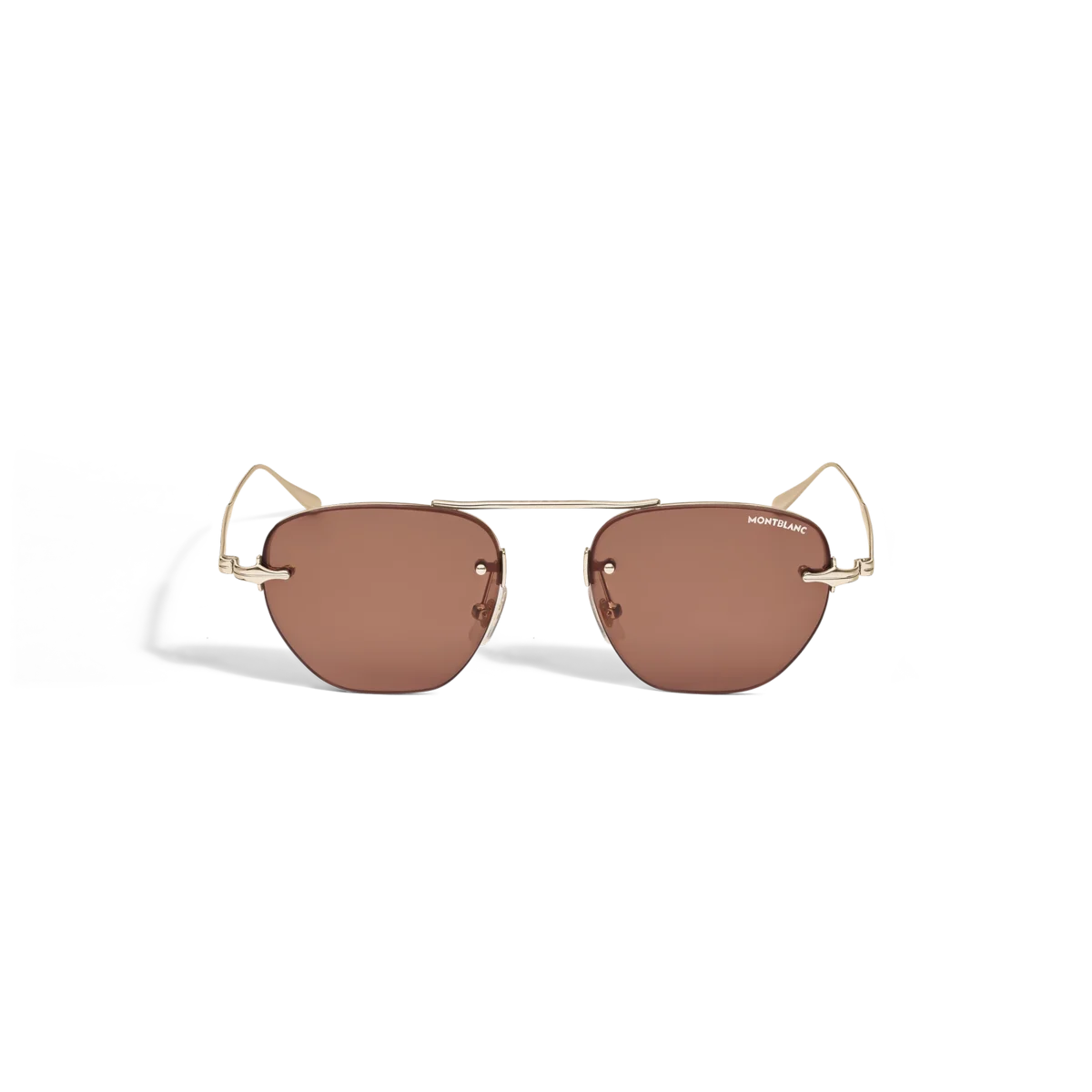 Disse solbriller i rund stil har en guldfarvet metalstel og brune glas. Inspireret af pennenes design er der en dekorativ pen-detalje på metalstelets design. Montblancs one line-logo er indgraveret på højre side af brillestangen, og logoet er desuden lasergraveret på venstre glas, mens der er indgraveret en dekorativ detalje på enderne af brillestangen. Identifikationsnummer: MB135570