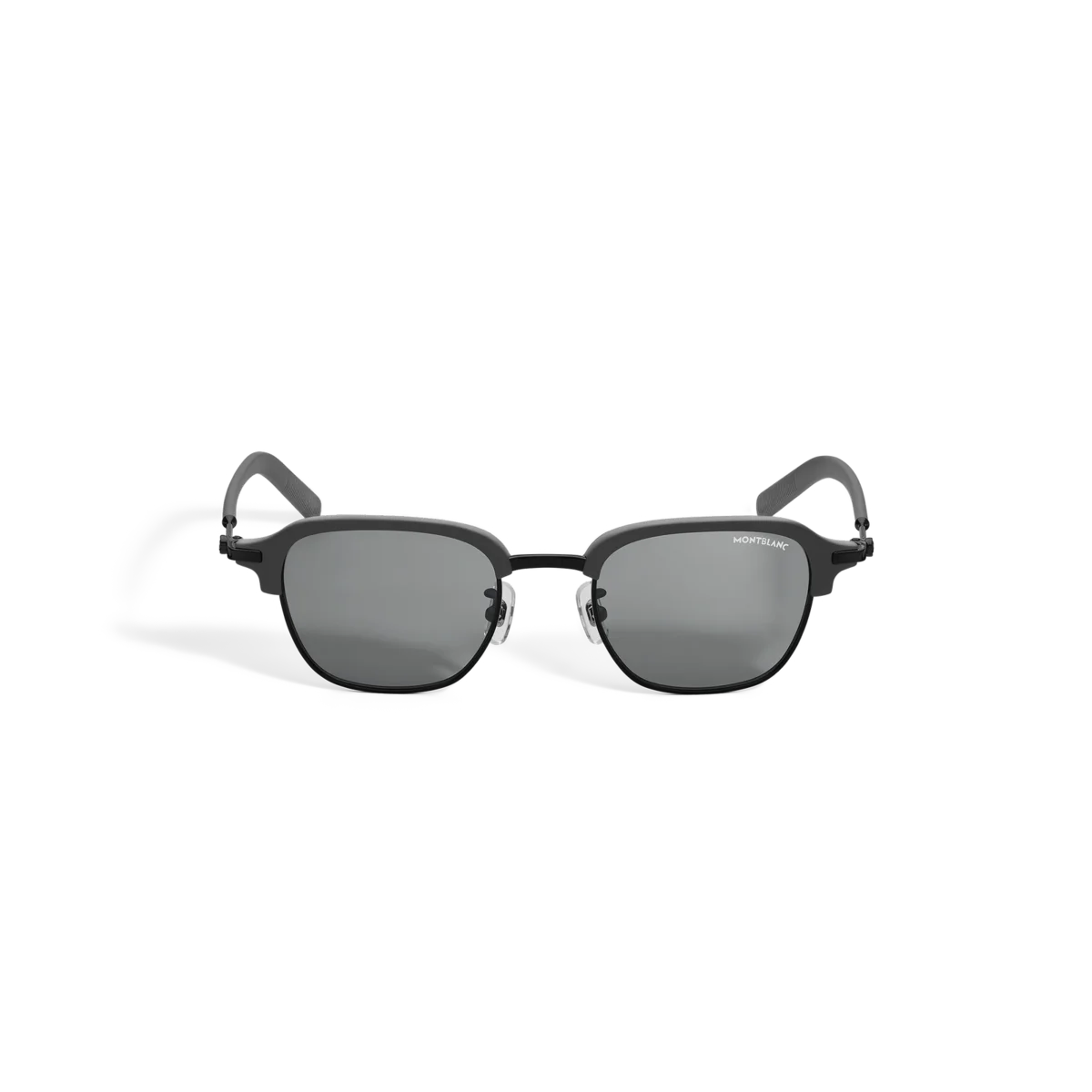 Disse solbriller i firkantet stil har en sort metalramme og grå glas. Montblanc-emblemet er indkapslet i brillestængernes design. Montblanc-logoet er indgraveret på venstre glas, og det skridsikre mønster er indgraveret på indersiden af brillestængernes ender for at øge komforten.