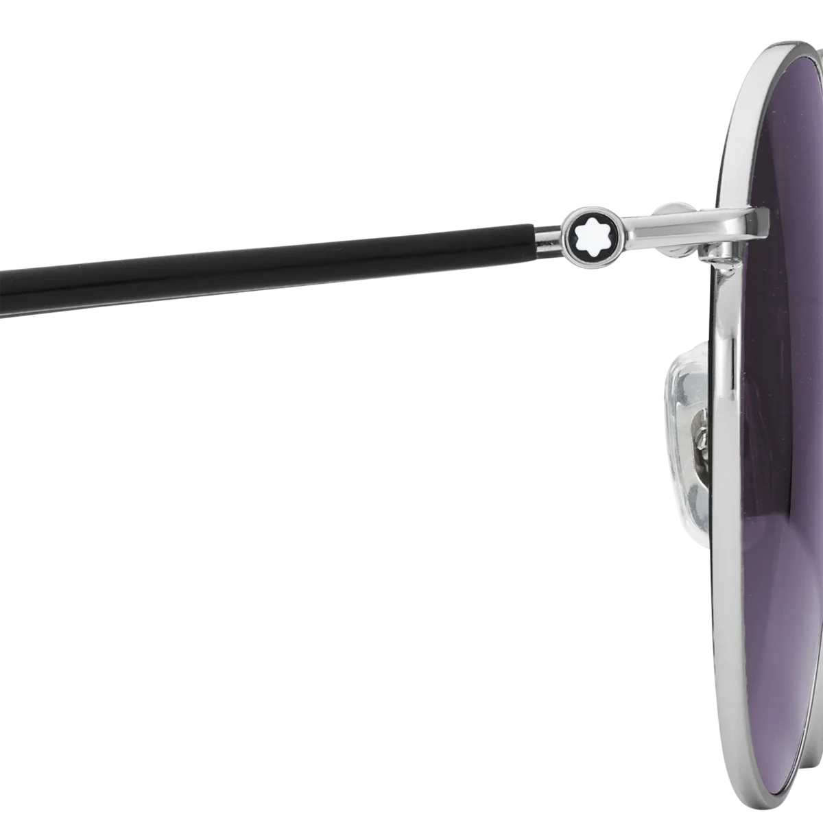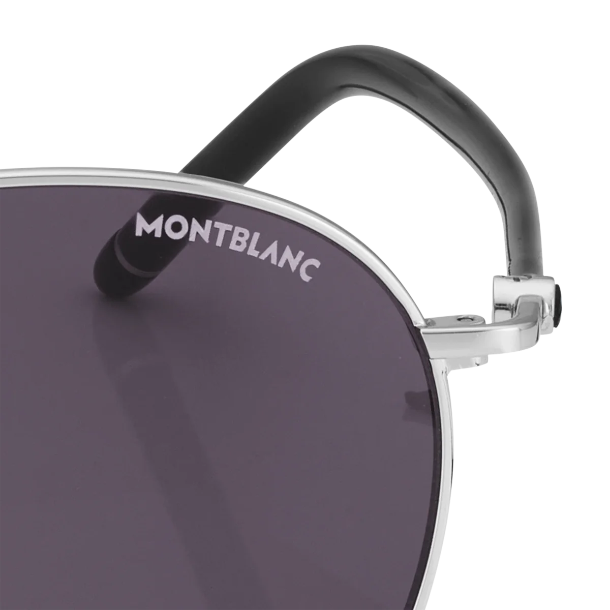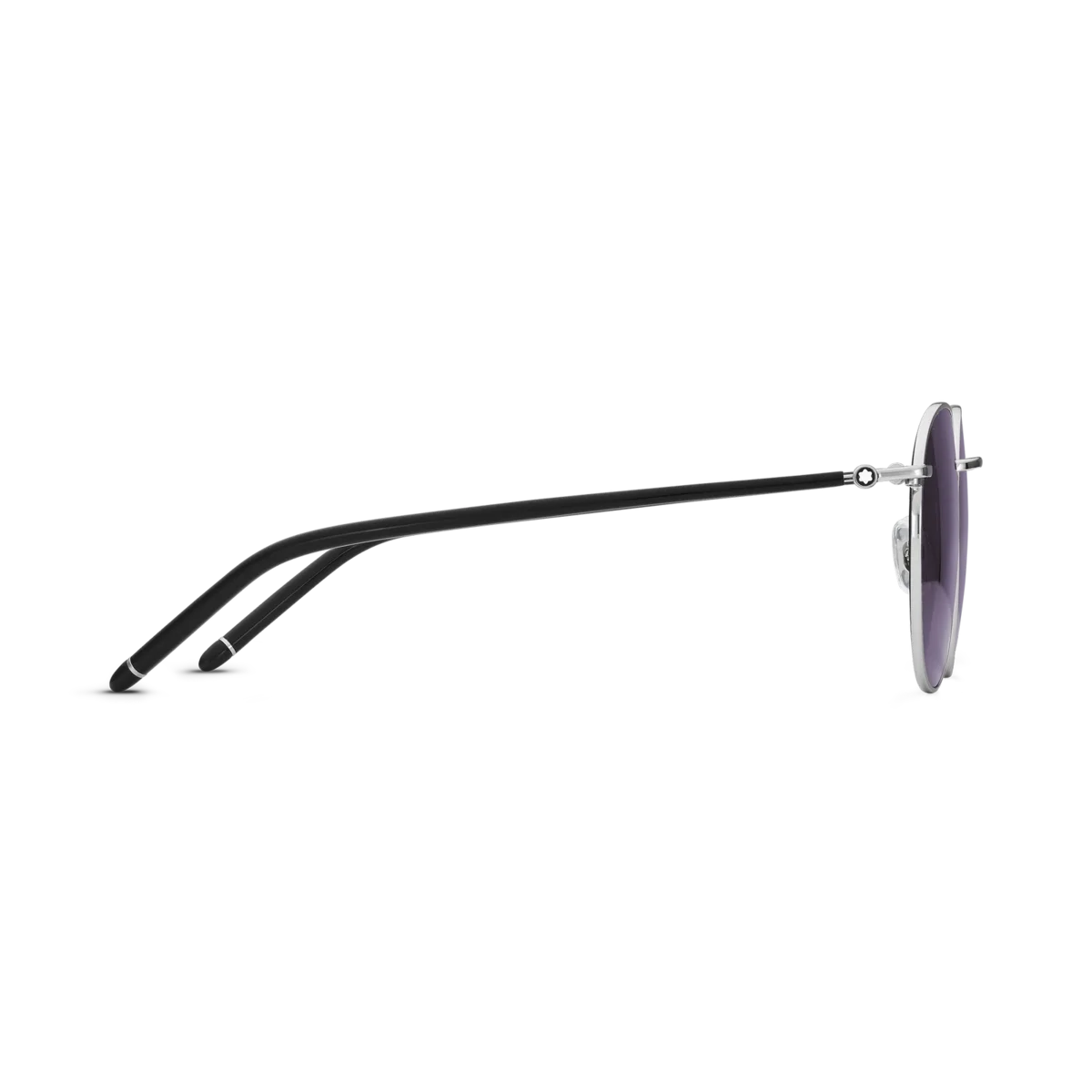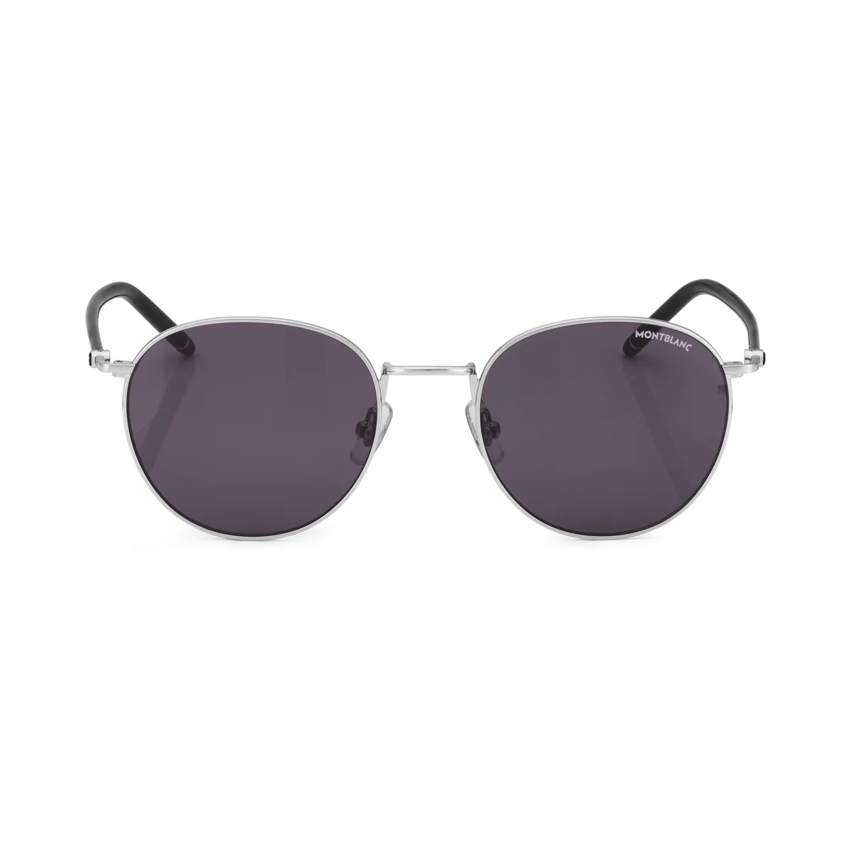 Disse runde solbriller har en sølvfarvet metalramme og grå glas. De rørformede brillestænger er inspireret af Meisterstück-skriveinstrumenterne og beriget med en sort emaljedetalje på brillestængernes ender. Montblanc-logoet er indgraveret på venstre glas, og snowcap-logoet er indkapslet i brillestængerne.