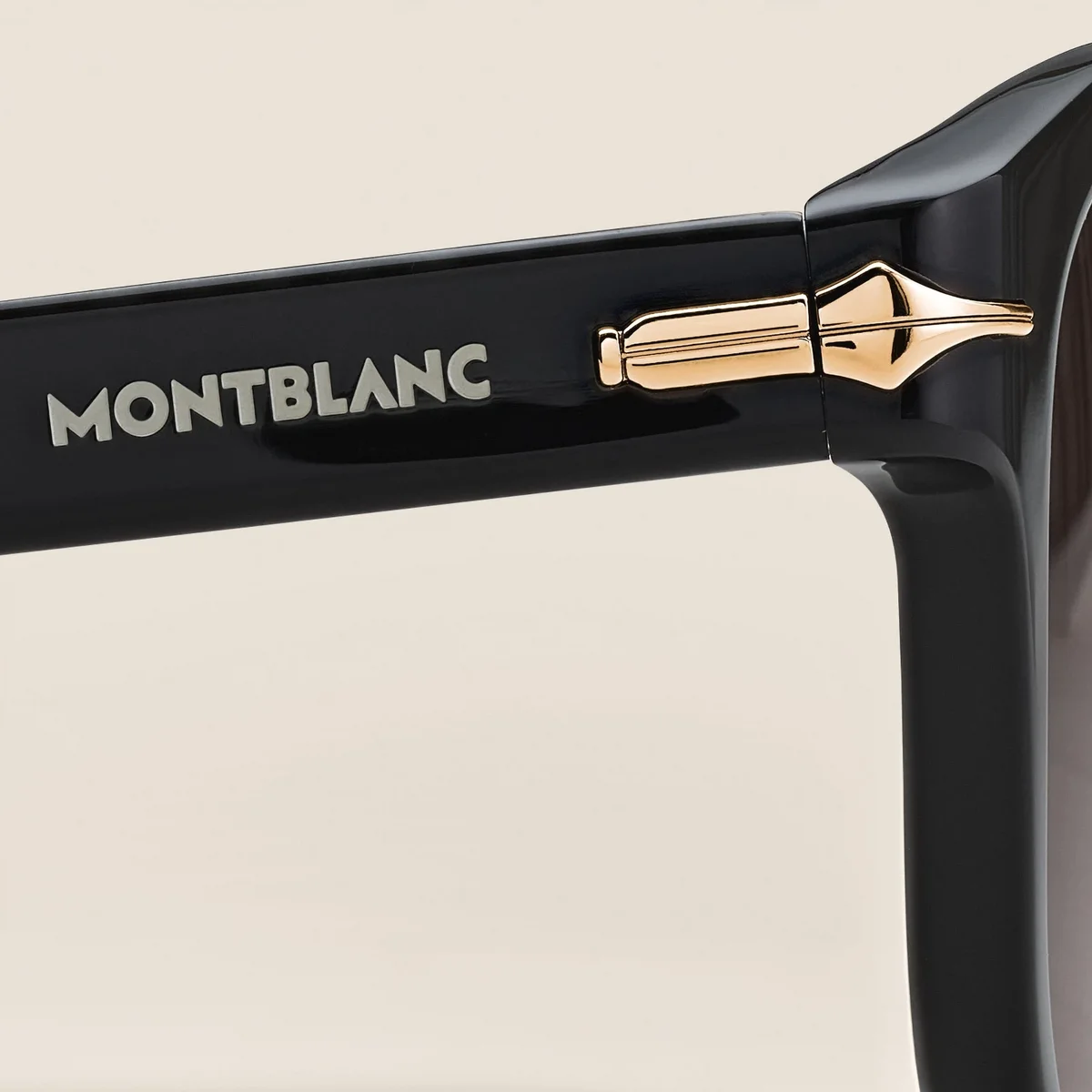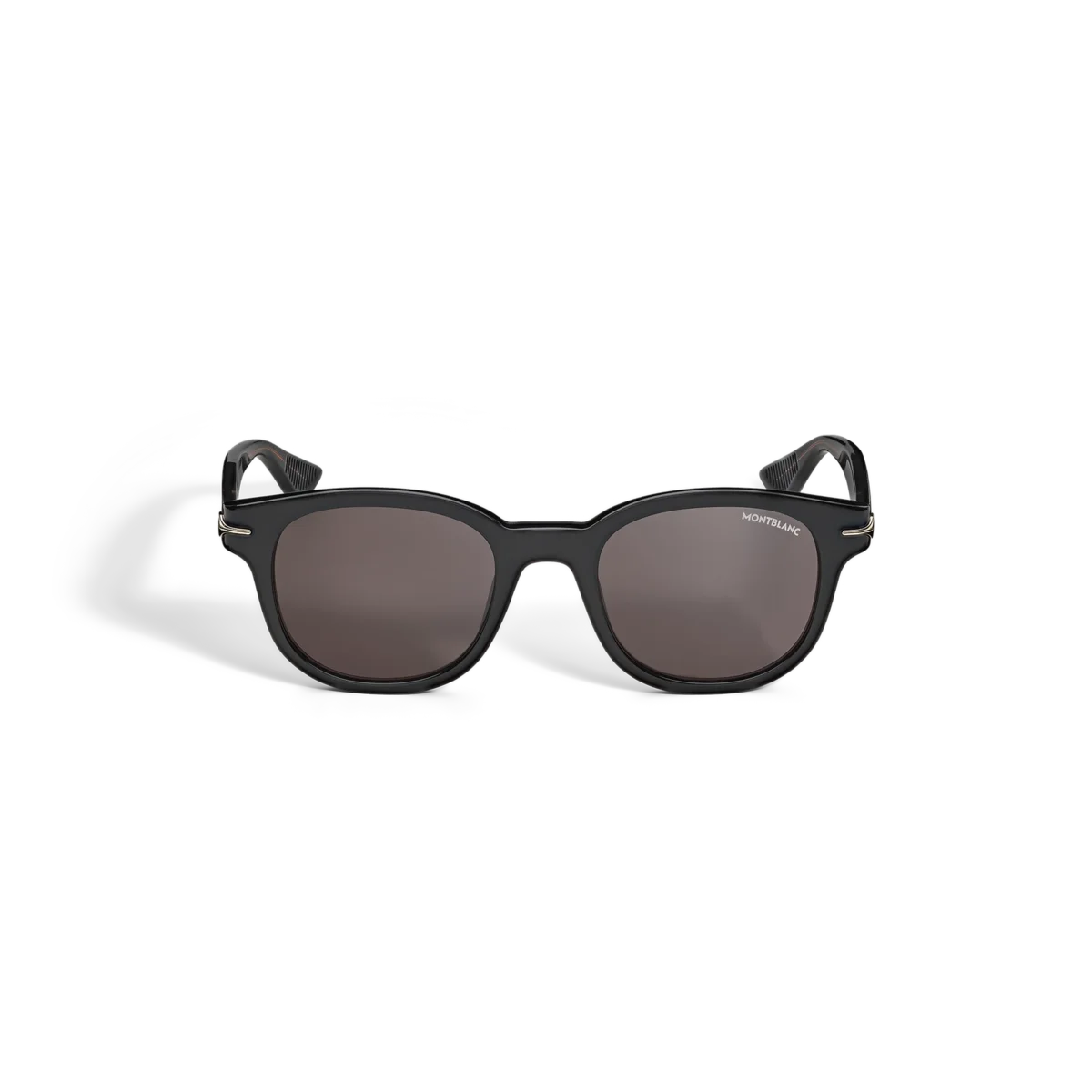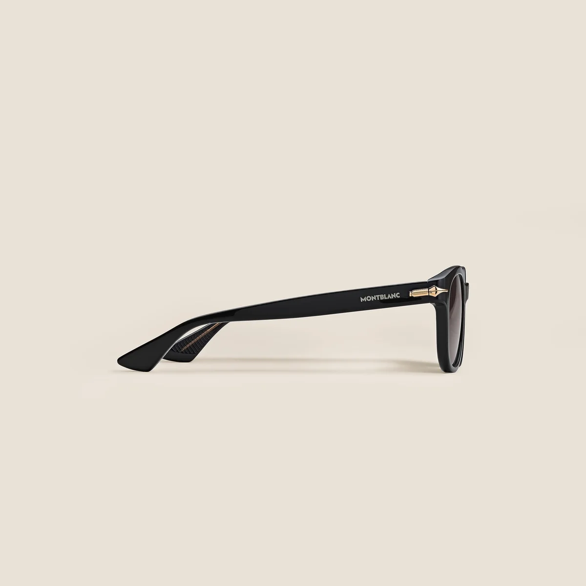 Disse solbriller i rund stil har en sort acetatramme og grå glas. Inspireret af pennepunktets design på skriveinstrumenterne er der en dekorativ pennepunktsdetalje på brillestangen. Montblancs one line-logo er indgraveret på højre side af brillestangen, og logoet er desuden lasergraveret på venstre glas.