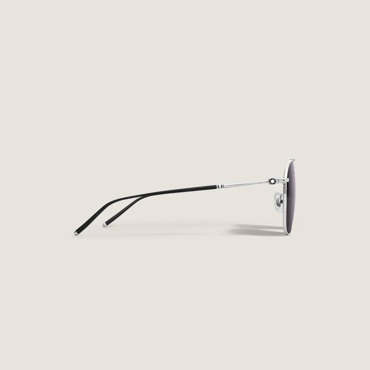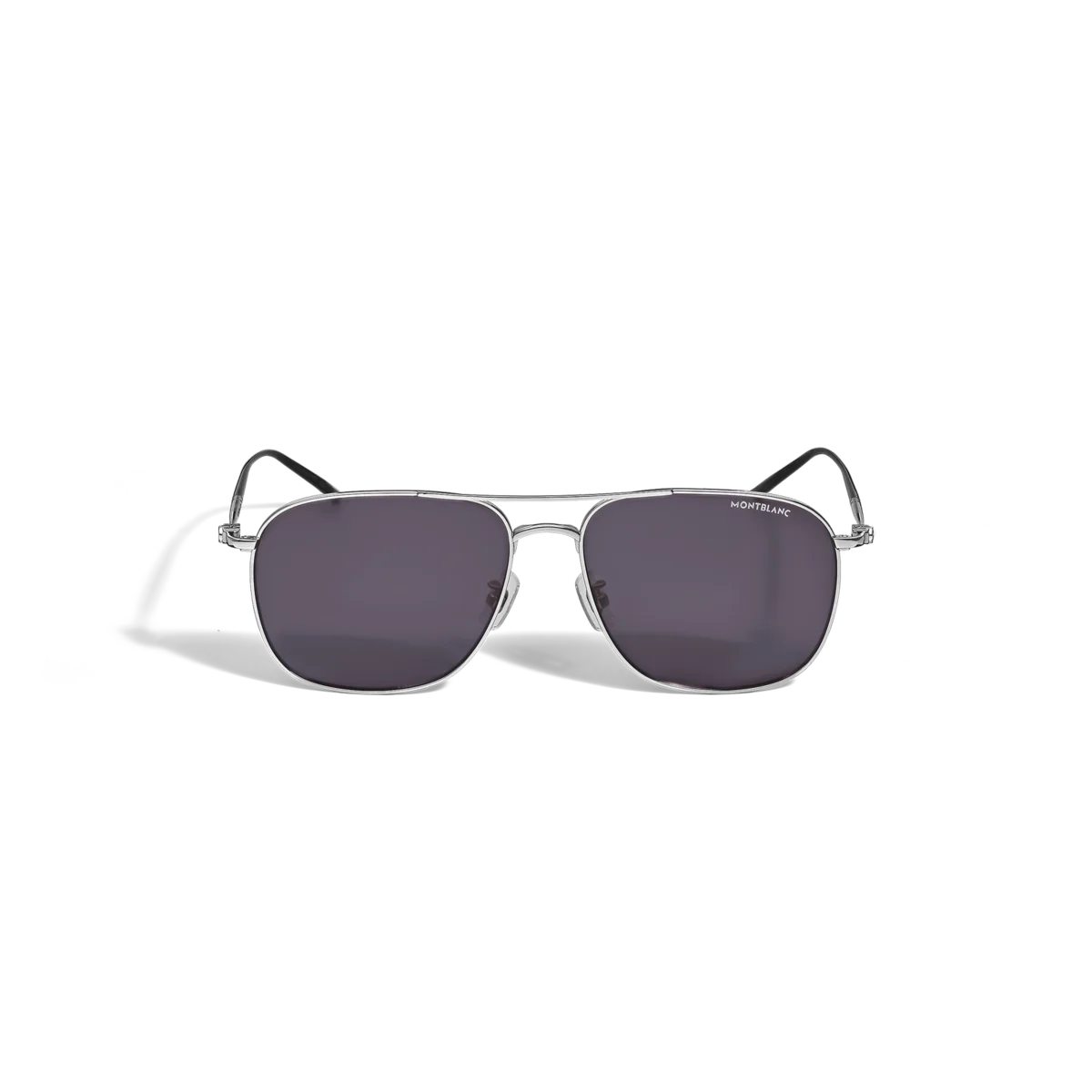 Disse solbriller i firkantet stil har en sølvfarvet metalstel og blå glas. De har en dobbelt metalbro på forsiden. De rørformede stænger, der er inspireret af Meisterstück-skriveinstrumenterne, er beriget med en detalje med 3 ringe. Montblanc-logoet er indgraveret på venstre glas, og en sort emaljedetalje er indkapslet på enderne. Identifikationsnummer MB135562
