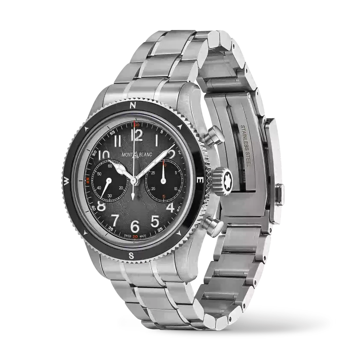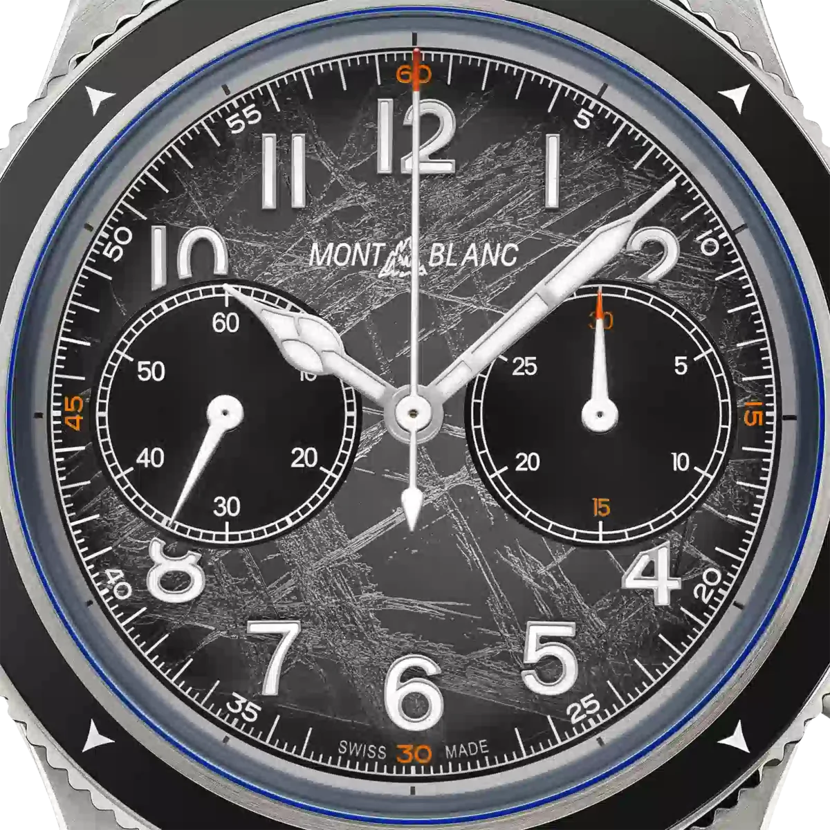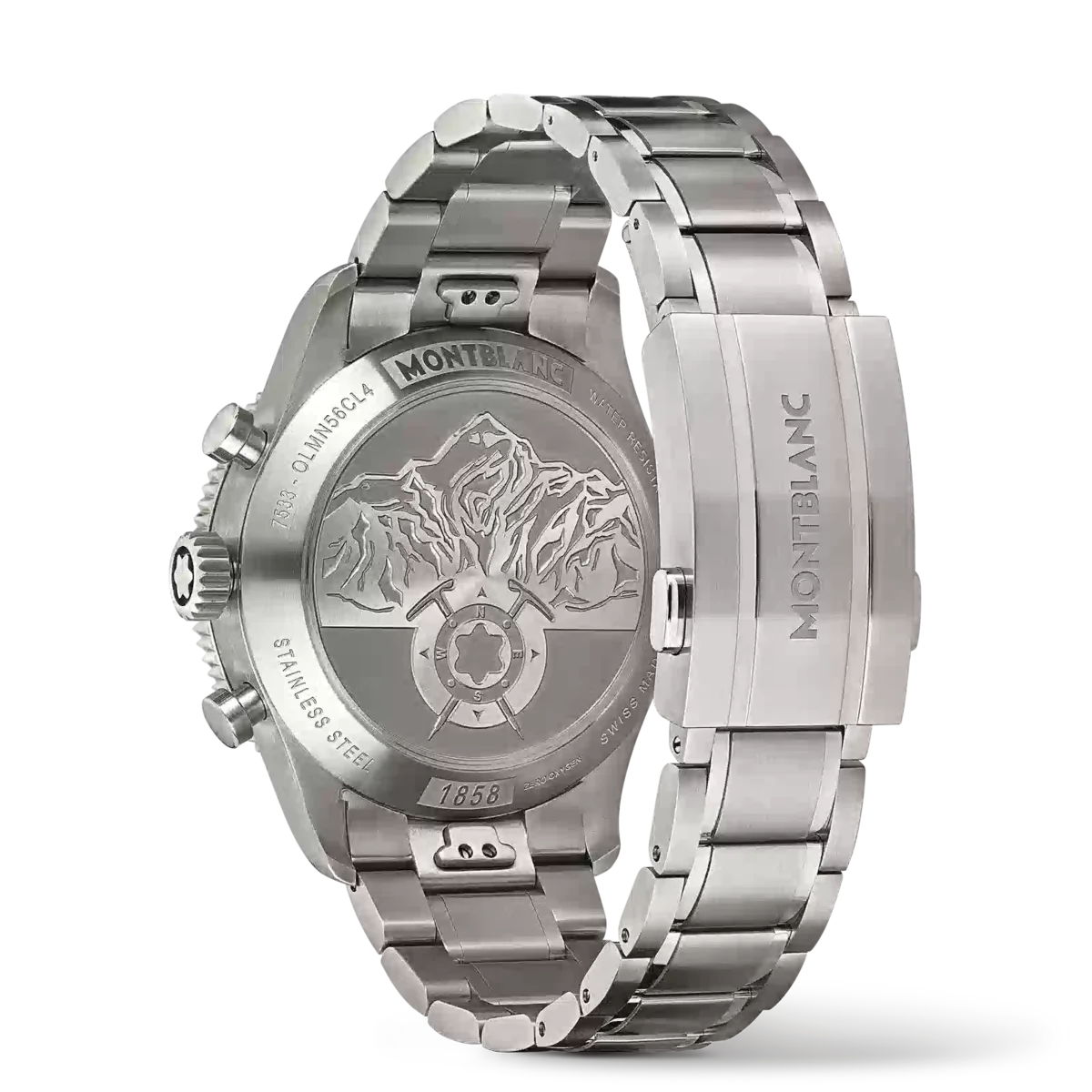 Montblanc 1858 Automatic Chronograph 0 Oxygen The 8000 er en hyldest til verdens højeste bjergtoppe og de alpinister, der vover at bestige dem under ekstreme forhold. Uret har et 42 mm rustfrit stålkabinet, der er fuldstændig fri for ilt. Dette har flere fordele for opdagelsesrejsende, da det eliminerer dug og forhindrer oxidation, hvilket gør, at uret holder meget længere og med større præcision. Uret drives af MB 25.13 automatisk chronograph og har en riflet, tovejs sort keramisk bezel med selvlysende kardinalpunkter, en mørkegrå sfumato-skive med gletschermønster, orange accenter og blå selvlysende elementer. Bagkassen er indgraveret med mønsteret “Spirit of Exploration”, og uret er udstyret med et udskifteligt, konisk armbånd i rustfrit stål med et fint justeringssystem. Identifikationsnummer: MB130983