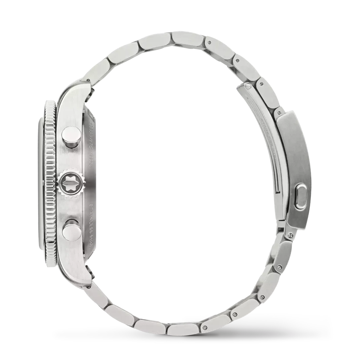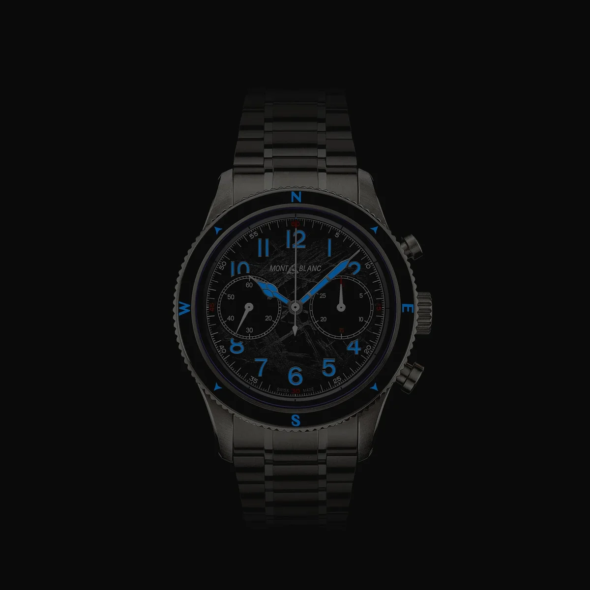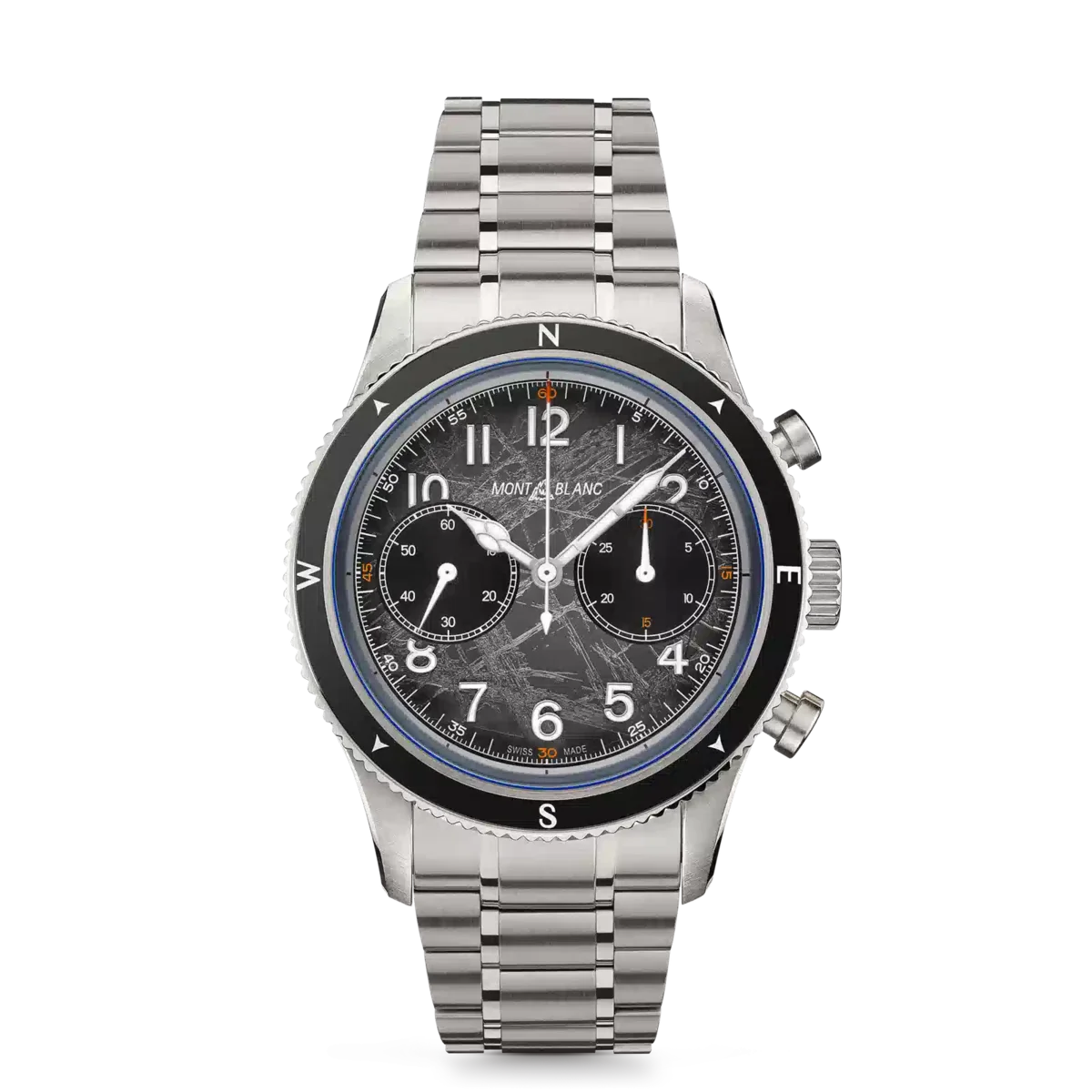 Montblanc 1858 Automatic Chronograph 0 Oxygen The 8000 er en hyldest til verdens højeste bjergtoppe og de alpinister, der vover at bestige dem under ekstreme forhold. Uret har et 42 mm rustfrit stålkabinet, der er fuldstændig fri for ilt. Dette har flere fordele for opdagelsesrejsende, da det eliminerer dug og forhindrer oxidation, hvilket gør, at uret holder meget længere og med større præcision. Uret drives af MB 25.13 automatisk chronograph og har en riflet, tovejs sort keramisk bezel med selvlysende kardinalpunkter, en mørkegrå sfumato-skive med gletschermønster, orange accenter og blå selvlysende elementer. Bagkassen er indgraveret med mønsteret “Spirit of Exploration”, og uret er udstyret med et udskifteligt, konisk armbånd i rustfrit stål med et fint justeringssystem. Identifikationsnummer: MB130983