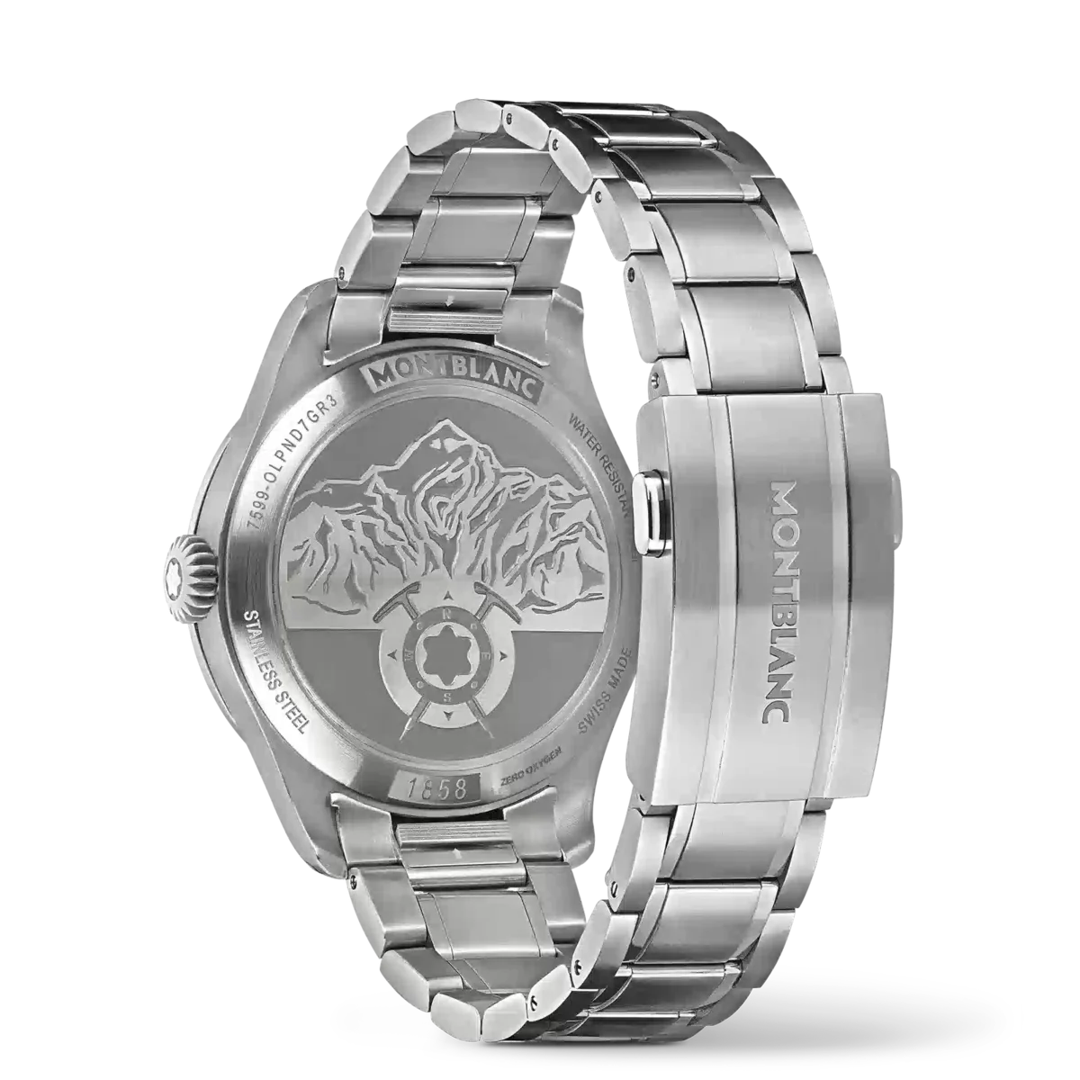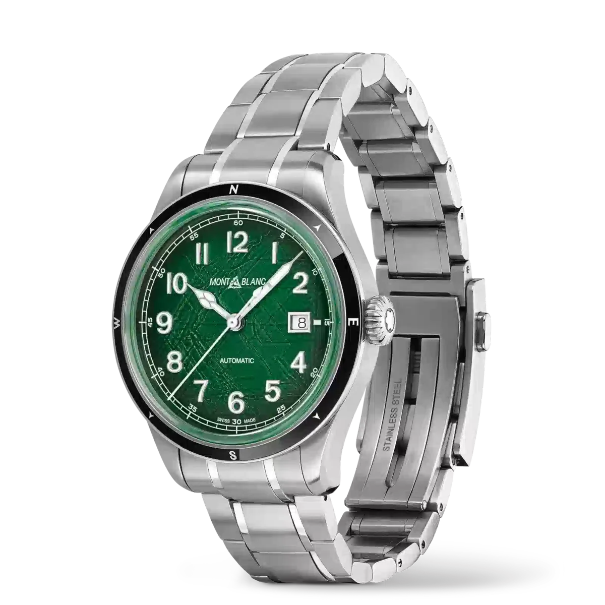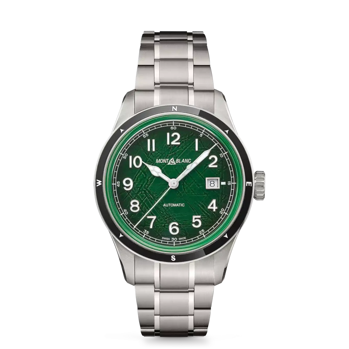 Denne Montblanc 1858 Automatic Date 0 Oxygen fanger ånden i bjergekspeditioner med sin sfumato-grønne urskive med gletschermønster, der er inspireret af den dybe grønne farve på smaragdgrønne isbjerge eller “jadebergs”. Uret er indkapslet i en 41 mm rustfri stålkasse, der er fuldstændig fri for ilt, med en fast sort keramisk bezel med selvlysende kardinalpunkter. Det er udstyret med et udskifteligt rustfrit stålarmbånd med konisk form og finjusteringssystem samt en indgraveret bagkasse med den specielle indgravering “Spirit of Exploration”.