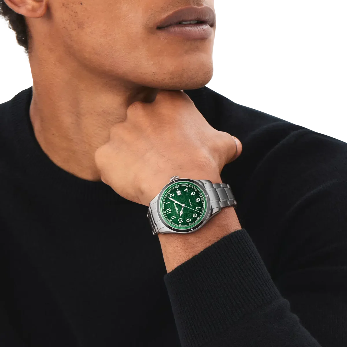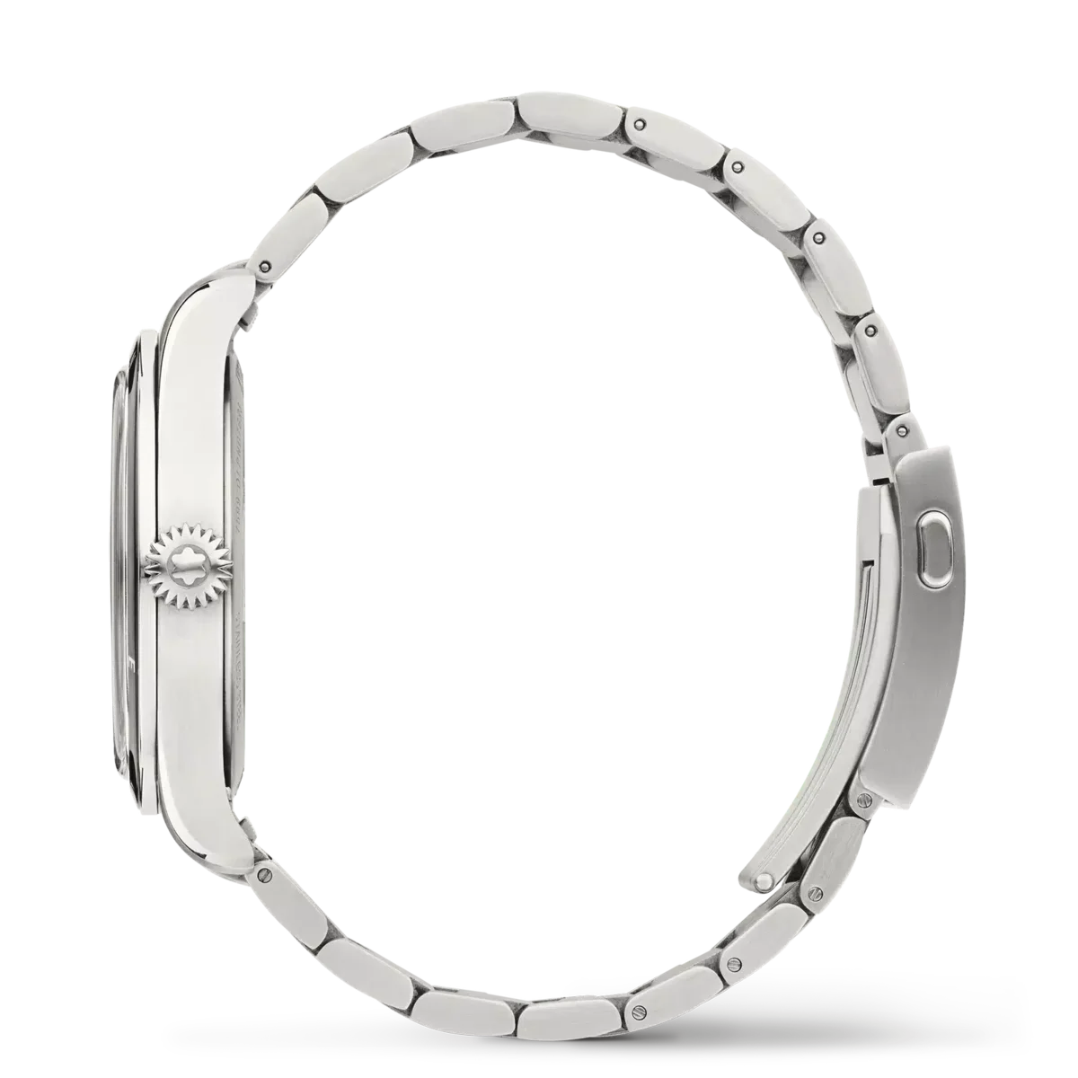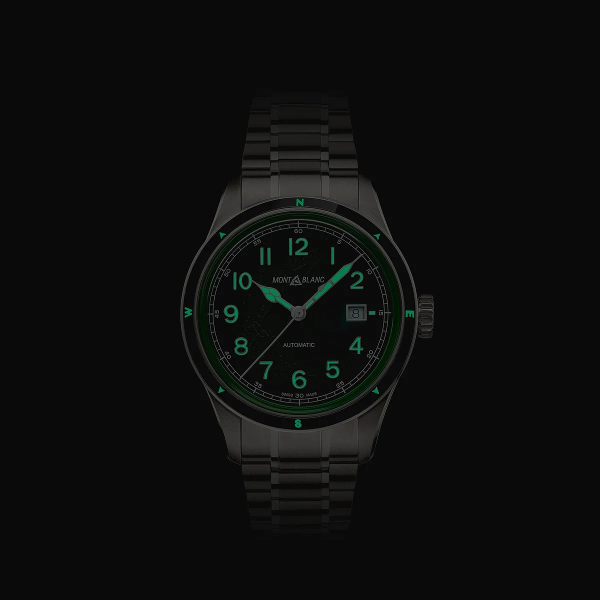 Denne Montblanc 1858 Automatic Date 0 Oxygen fanger ånden i bjergekspeditioner med sin sfumato-grønne urskive med gletschermønster, der er inspireret af den dybe grønne farve på smaragdgrønne isbjerge eller “jadebergs”. Uret er indkapslet i en 41 mm rustfri stålkasse, der er fuldstændig fri for ilt, med en fast sort keramisk bezel med selvlysende kardinalpunkter. Det er udstyret med et udskifteligt rustfrit stålarmbånd med konisk form og finjusteringssystem samt en indgraveret bagkasse med den specielle indgravering “Spirit of Exploration”.