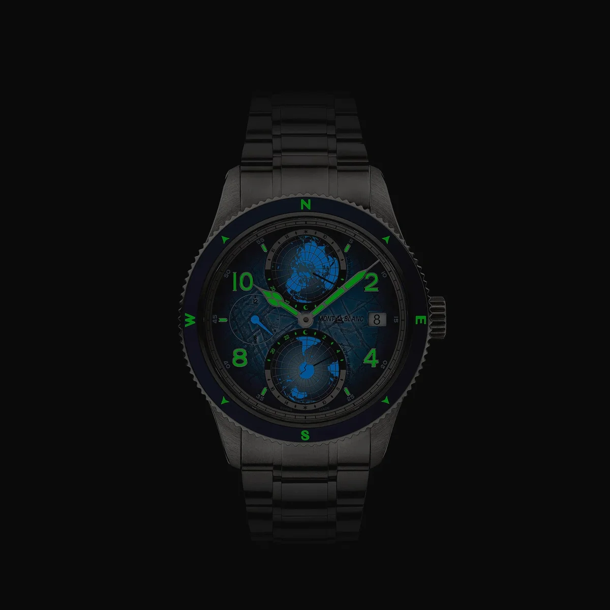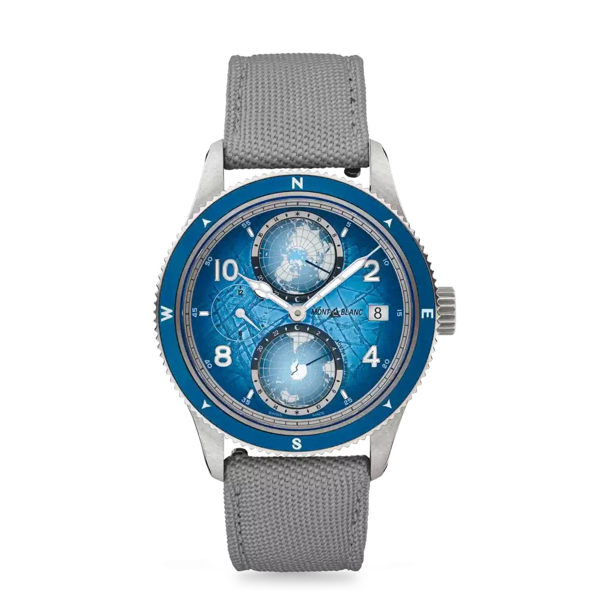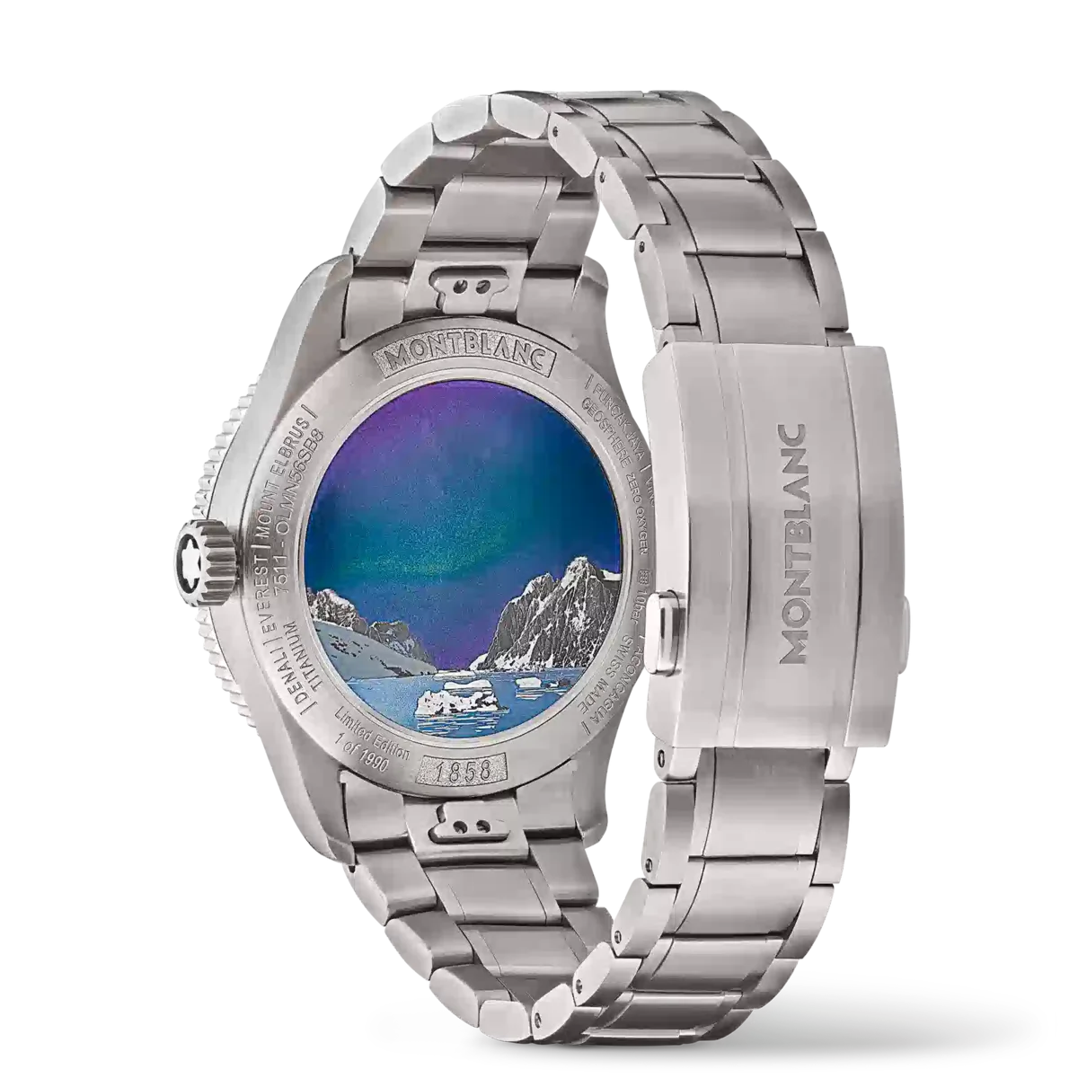Denne Montblanc 1858 Geosphere limited edition i 1990 eksemplarer er inspireret af udforskningen af Sydpolen på det antarktiske kontinent. Uret drives af Montblancs automatiske urværk med Manufacture Worldtime-komplikation – Caliber MB 29.25 – der viser tiden rundt om i verden ved hjælp af karakteristiske selvlysende drejelige kloder; det viser også dag og nat, dobbelt tid og dato. Denne nye tekniske innovation er indkapslet i et ultralet 42 mm titaniumhus, der er fuldstændig fri for ilt, og har flere fordele for opdagelsesrejsende, da det eliminerer dug og forhindrer oxidation, hvilket gør, at urværket holder meget længere og med større præcision. Uret er udstyret med en isblå sfumato-skive med gletschermønster og en matchende farvet, tovejs anodiseret aluminiumsramme og fås med et udskifteligt, tilspidset armbånd med et fint justeringssystem og en grå tekstilrem med rebmønster. På bagkassen er der en 3D-lasergravering af et frossent landskab med Aurora Australis. Identifikationsnummer MB130961 Lugbredde 22 mm