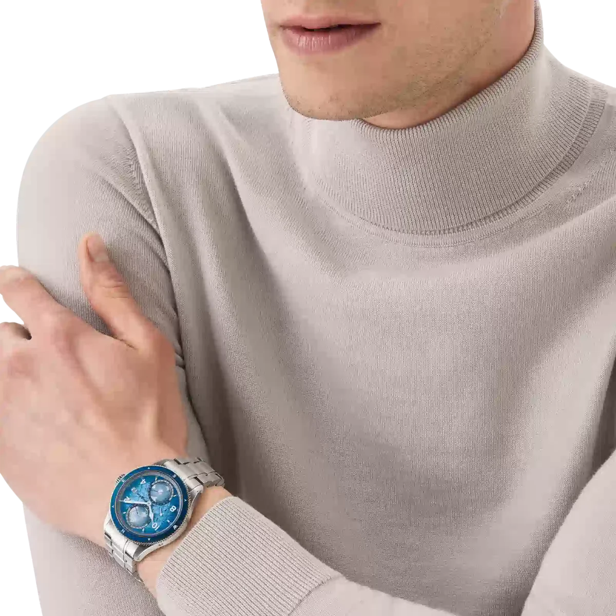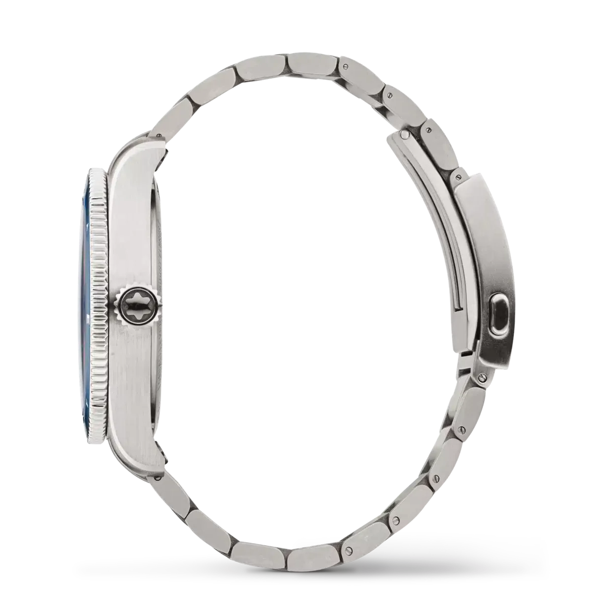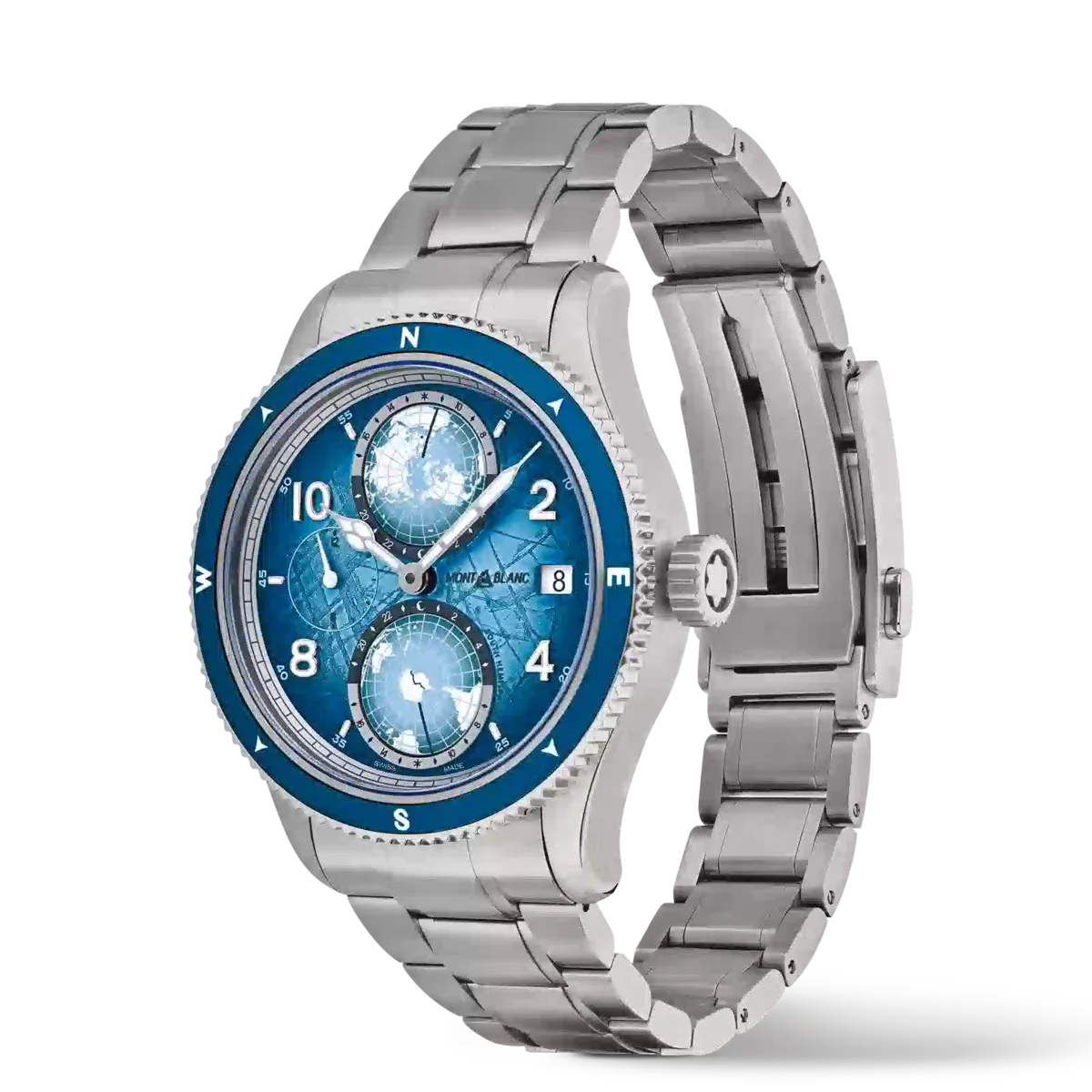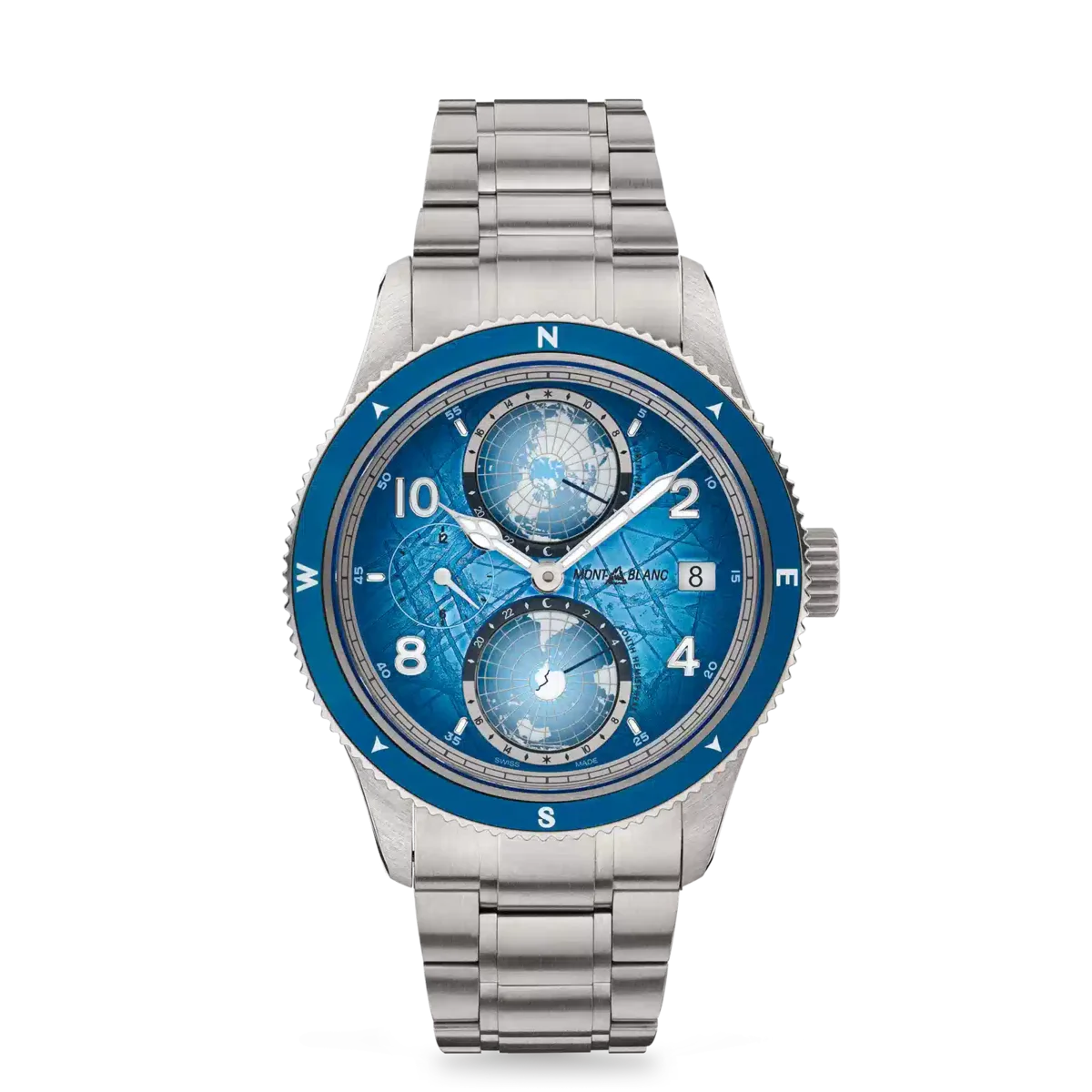 Denne Montblanc 1858 Geosphere limited edition i 1990 eksemplarer er inspireret af udforskningen af Sydpolen på det antarktiske kontinent. Uret drives af Montblancs automatiske urværk med Manufacture Worldtime-komplikation – Caliber MB 29.25 – der viser tiden rundt om i verden ved hjælp af karakteristiske selvlysende drejelige kloder; det viser også dag og nat, dobbelt tid og dato. Denne nye tekniske innovation er indkapslet i et ultralet 42 mm titaniumhus, der er fuldstændig fri for ilt, og har flere fordele for opdagelsesrejsende, da det eliminerer dug og forhindrer oxidation, hvilket gør, at urværket holder meget længere og med større præcision. Uret er udstyret med en isblå sfumato-skive med gletschermønster og en matchende farvet, tovejs anodiseret aluminiumsramme og fås med et udskifteligt, tilspidset armbånd med et fint justeringssystem og en grå tekstilrem med rebmønster. På bagkassen er der en 3D-lasergravering af et frossent landskab med Aurora Australis. Identifikationsnummer MB130961 Lugbredde 22 mm