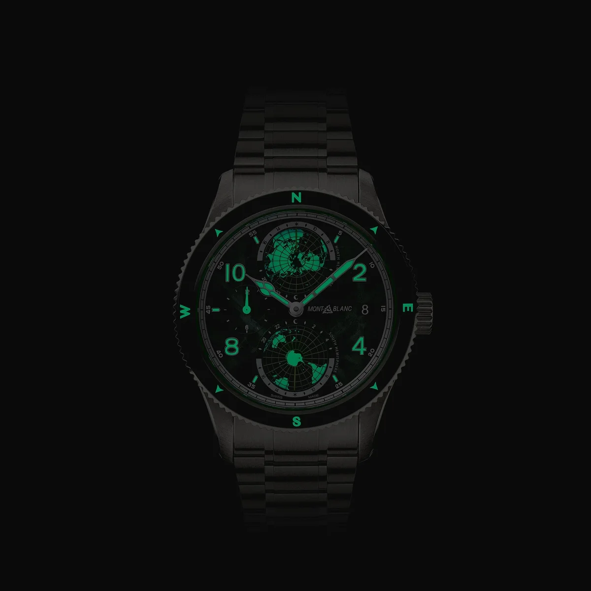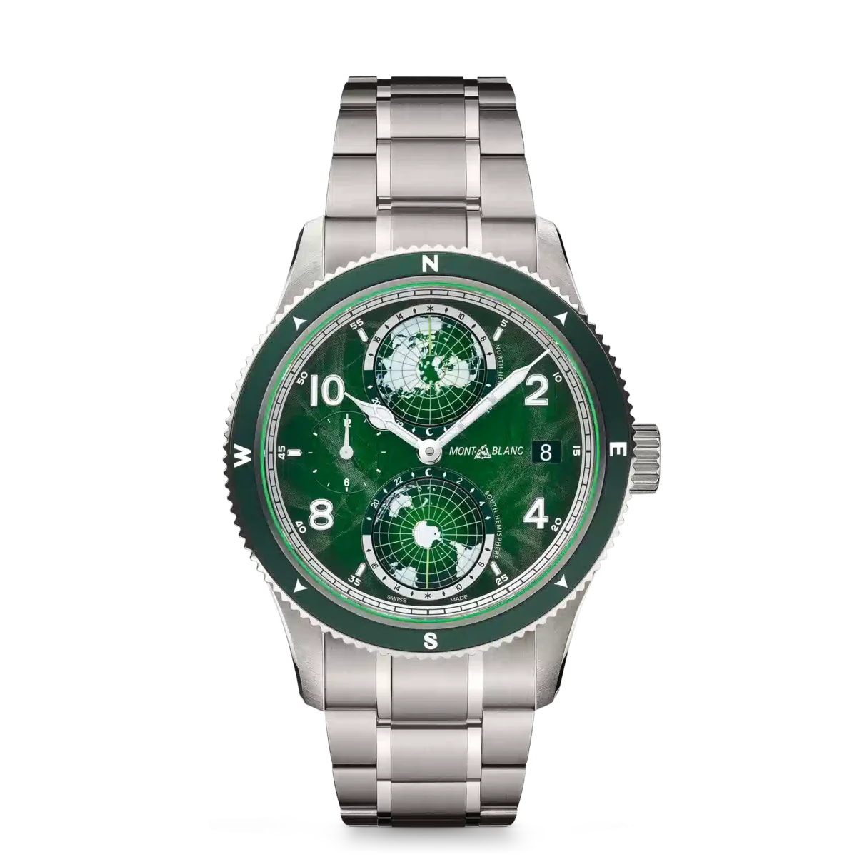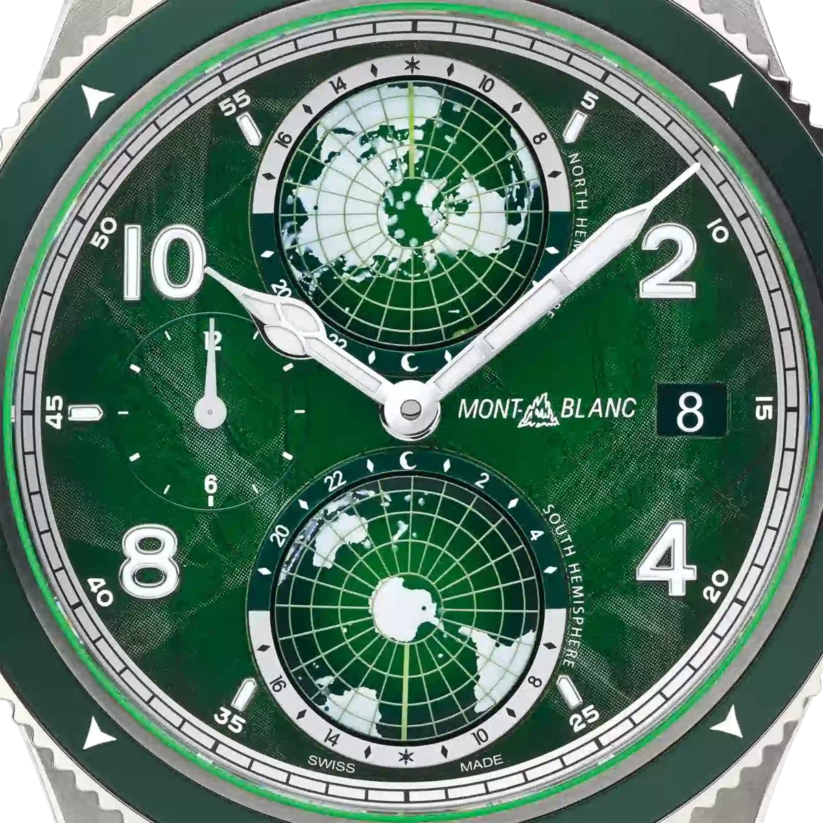 Denne Montblanc 1858 Geosphere 0 Oxygen fanger ånden i bjergekspeditioner med sin sfumato-grønne urskive med gletschermønster, der er inspireret af den dybe grønne farve på smaragdgrønne isbjerge eller “jadebergs”. Uret er indkapslet i et 42 mm rustfrit stålhus, der er fuldstændig fri for ilt, med en riflet, tovejs grøn anodiseret aluminiumsring med selvlysende kardinalpunkter. Drevet af MB 29.25-kaliber med Montblancs Manufacture-komplikation til verdens tid, omfatter dette automatiske urværk roterende kloder for den nordlige og sydlige halvkugle, en 24-timers skala, dag- og natindikationer, dobbelt tidsvisning og dato. En 3D-farvet lasergravering af Mont Blanc-bjerget på bagkassen samt et udskifteligt stålarmbånd med et konisk og fint justeringssystem fuldender uret. Identifikationsnummer MB133303