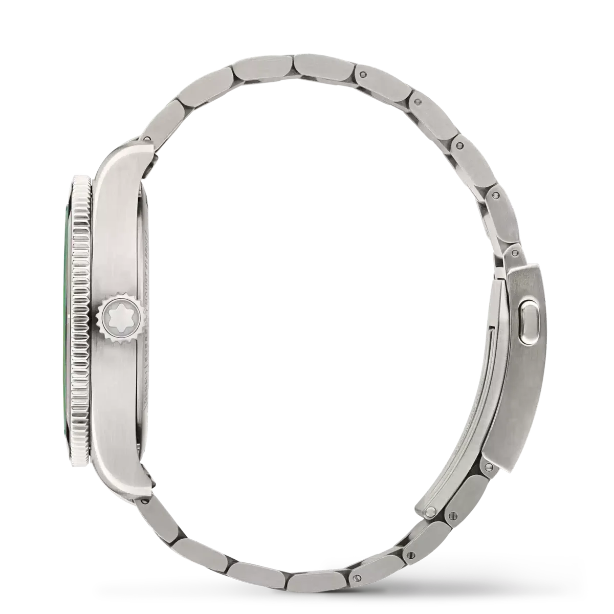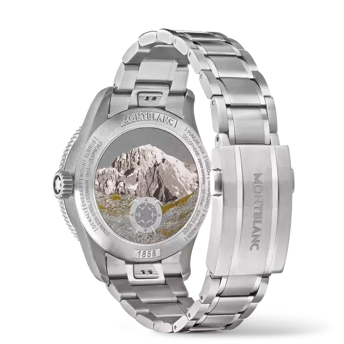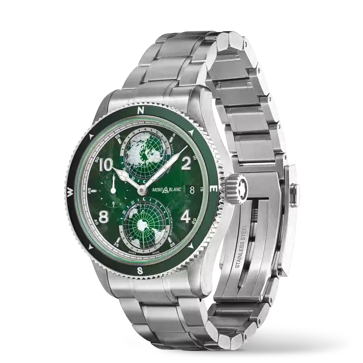 Denne Montblanc 1858 Geosphere 0 Oxygen fanger ånden i bjergekspeditioner med sin sfumato-grønne urskive med gletschermønster, der er inspireret af den dybe grønne farve på smaragdgrønne isbjerge eller “jadebergs”. Uret er indkapslet i et 42 mm rustfrit stålhus, der er fuldstændig fri for ilt, med en riflet, tovejs grøn anodiseret aluminiumsring med selvlysende kardinalpunkter. Drevet af MB 29.25-kaliber med Montblancs Manufacture-komplikation til verdens tid, omfatter dette automatiske urværk roterende kloder for den nordlige og sydlige halvkugle, en 24-timers skala, dag- og natindikationer, dobbelt tidsvisning og dato. En 3D-farvet lasergravering af Mont Blanc-bjerget på bagkassen samt et udskifteligt stålarmbånd med et konisk og fint justeringssystem fuldender uret. Identifikationsnummer MB133303