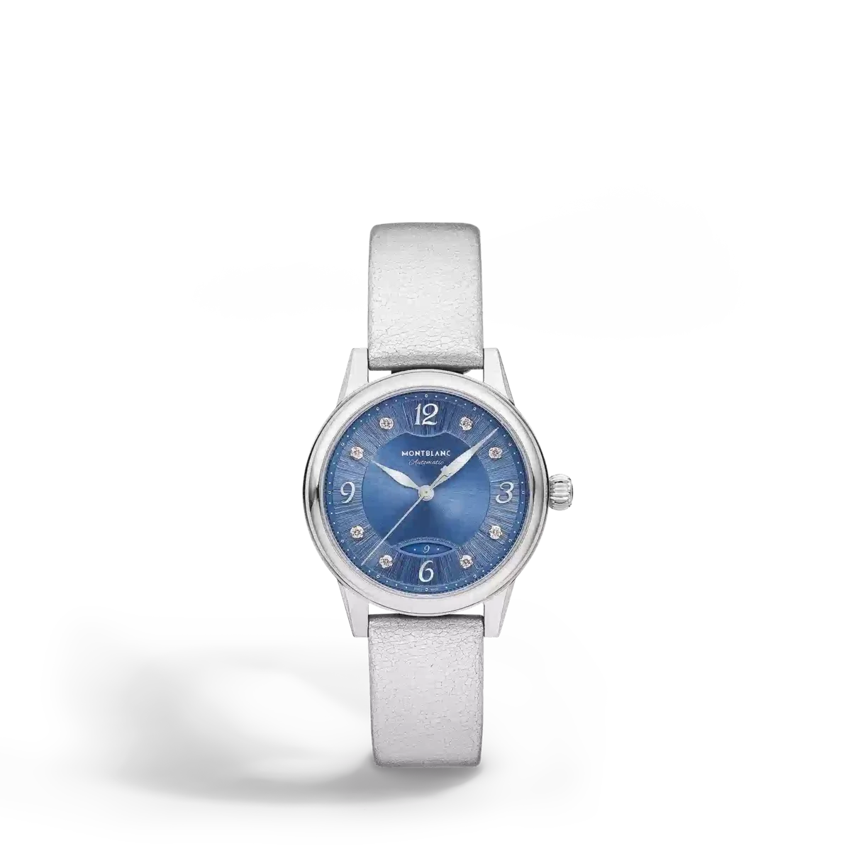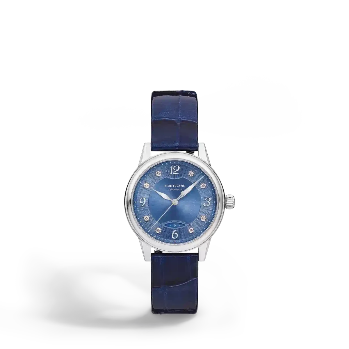 Montblanc Bohème Automatic Date fortolker de fine urmageriets koder på en elegant og feminin måde og er inspireret af håndskriftens verden. Uret har en 30 mm rustfri stålkasse. Det har en elegant solbørstet blå urskive prydet med diamantindekser, rhodiumbelagte blomsterformede arabertal og visere. Andre raffinerede detaljer omfatter et filet sauté-mønster og en stemplingsteknik kaldet filé d’étoiles. Denne model er udstyret med det automatiske kaliber MB 24.29 og viser timer, minutter og sekunder samt datoen, der vises i en mandelformet åbning med håndskrevne tal. Den romantiske skrifttype er også blevet anvendt på urskiven til angivelsen “Automatic”. Dette ur er udstyret med en udskiftelig blå kalveskindrem med alligatorprint og en ekstra rem. Identifikationsnummer MB133306 Lugbredde 14 mm