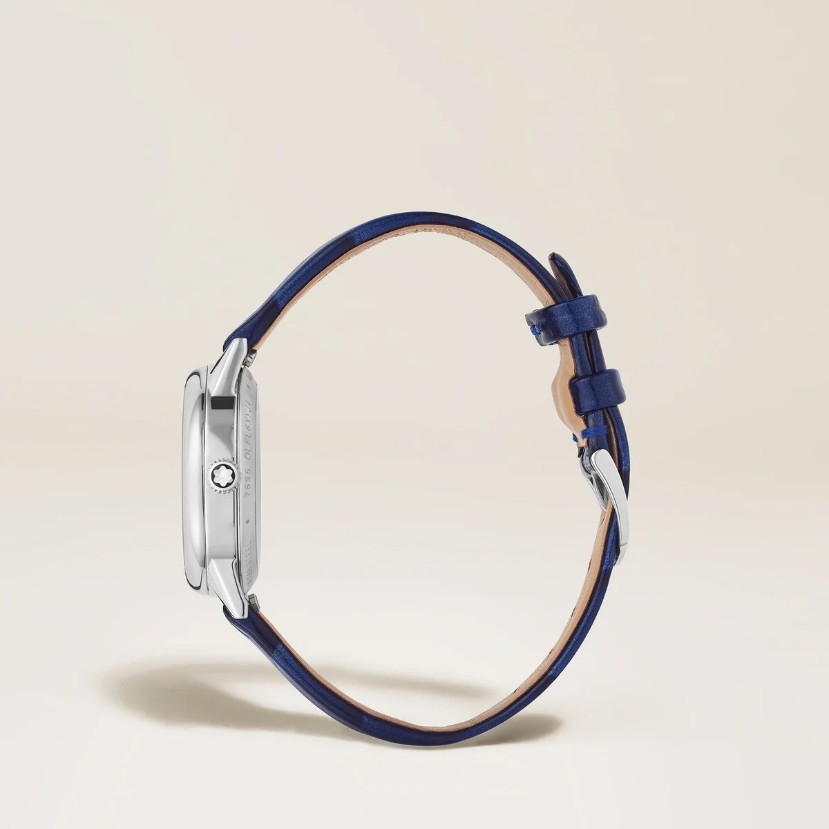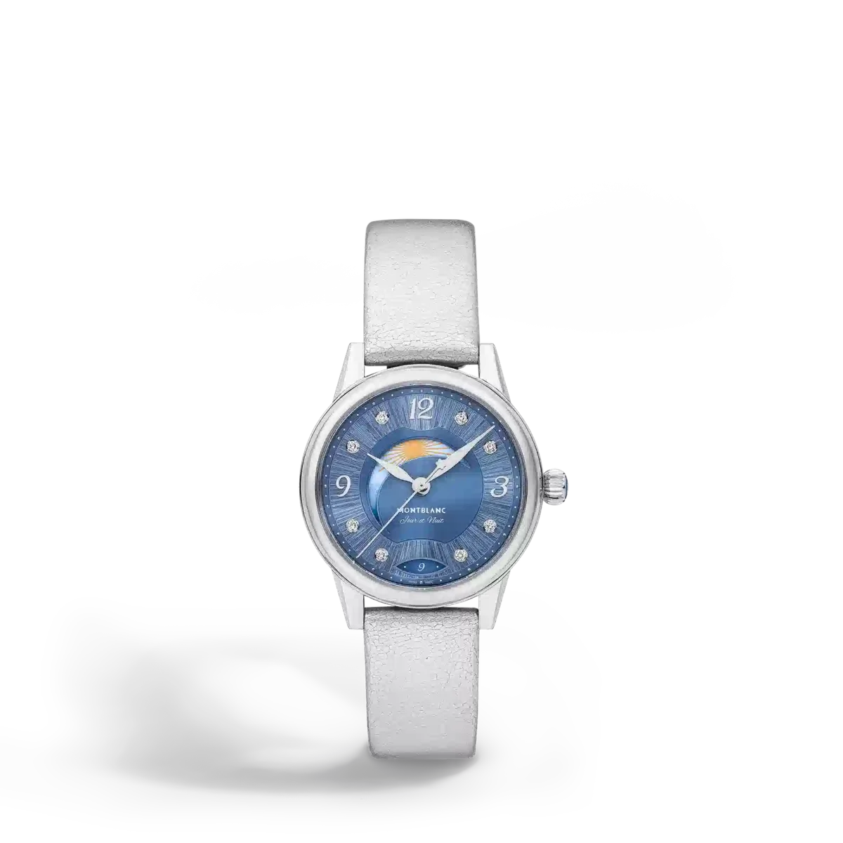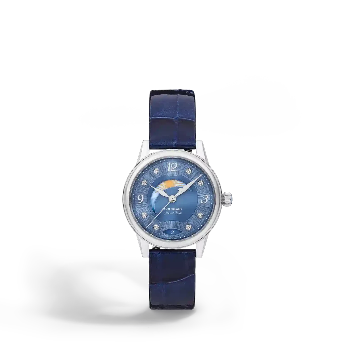 Montblanc Bohème Day & Night fortolker de fine urmageriets koder på en elegant og feminin måde og er inspireret af håndskrift og akvareller. Uret har en 30 mm rustfri stålkasse. Det har en elegant solbørstet blå urskive prydet med diamantindekser, rhodiumbelagte blomsterformede arabertal og visere. Andre raffinerede detaljer omfatter et filet sauté-mønster og en stemplingsteknik kaldet filé d’étoiles. Denne model er udstyret med det automatiske kaliber MB 24.20 og viser timer, minutter og sekunder samt datoen, der vises i en mandelformet åbning med håndskrevne tal. Den romantiske skrifttype er også blevet anvendt på urskiven til angivelsen af dag og nat, “Jour et Nuit”. Den himmelske dag- og natkomplikation viser den skiftende himmel over en periode på 24 timer og giver uret et romantisk og kunstnerisk præg, da det er skabt med akvareller. Uret er udstyret med en udskiftelig blå kalveskindrem med alligatorprint og en ekstra rem. Identifikationsnummer MB133334 Rembredde 14 mm