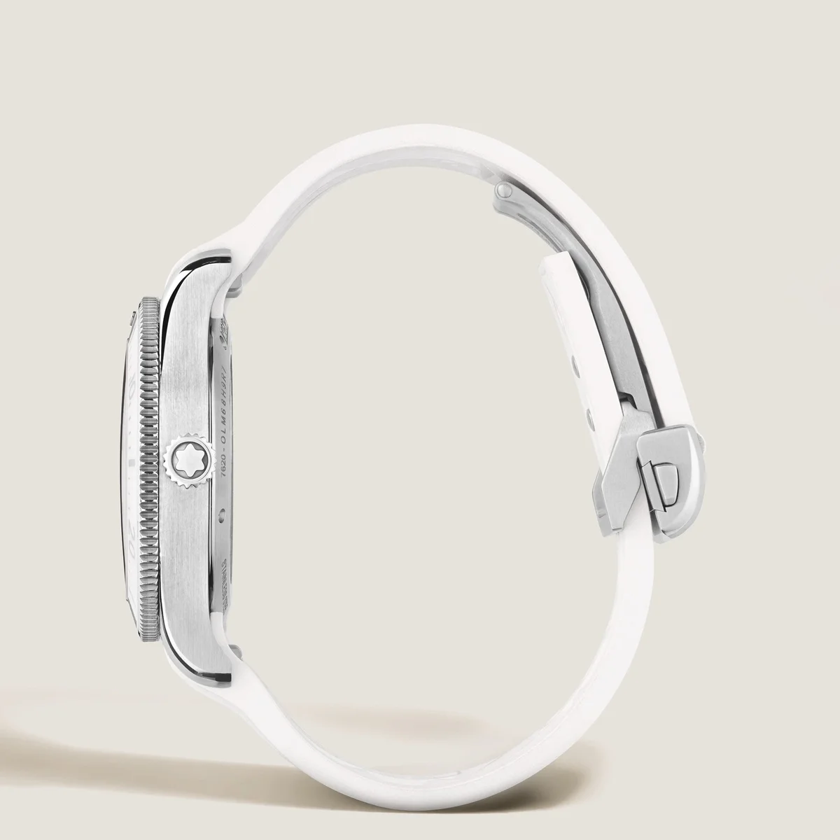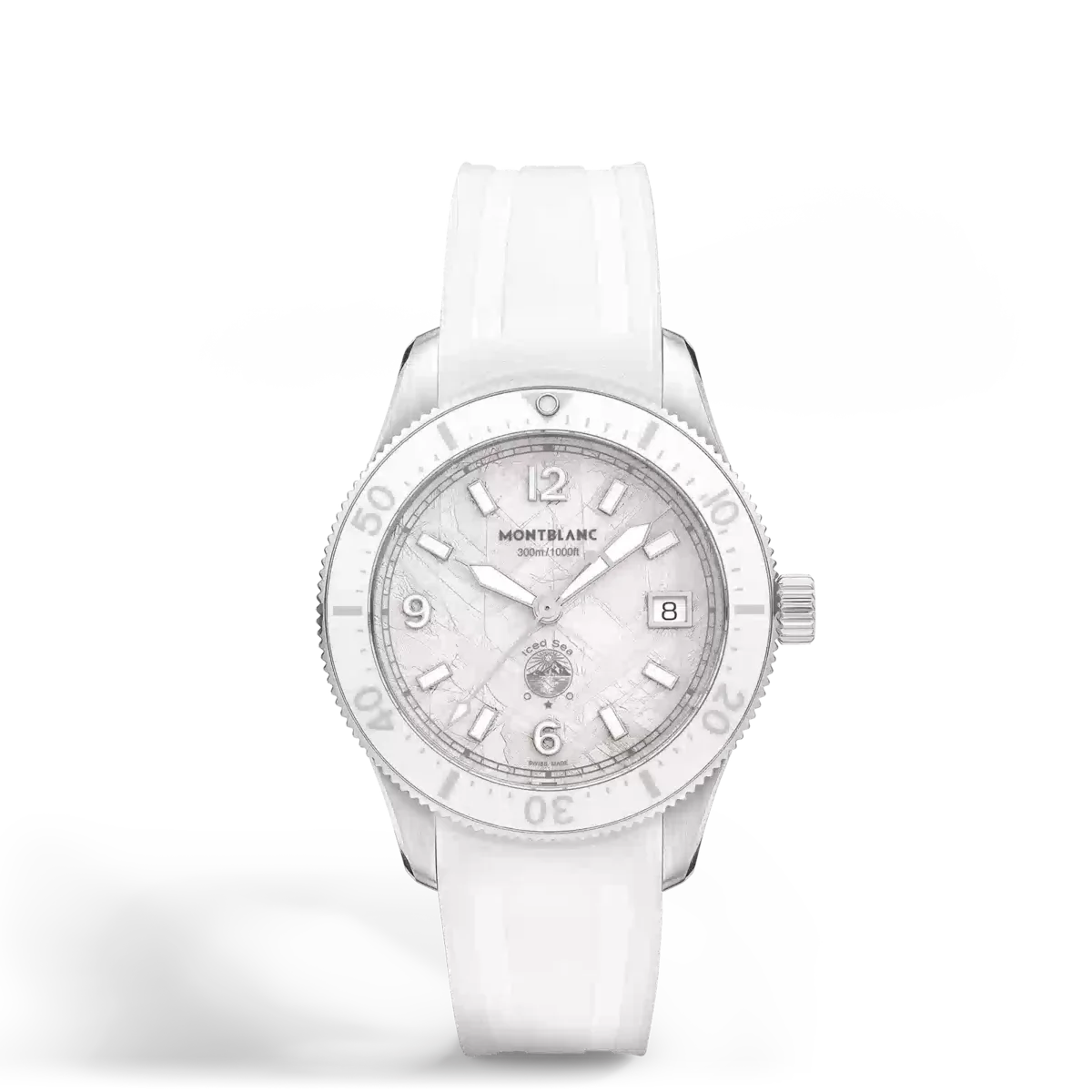 Montblanc Iced Sea Automatic Date 0 Oxygen med hvid urskive med gletschermønster giver indtryk af at kigge ned i dybet af en gletscher. Inspireret af Mer de Glace er denne gletschertekstur opnået ved hjælp af en næsten glemt, gammel teknik kaldet gratté-boisé. Uret er indkapslet i en 38 mm rustfri stålkasse, der er fuldstændig fri for ilt, og leveres med en ensrettet drejelig bezel med hvid keramisk indsats, en 3D-gravering på bagsiden af kassen og en udskiftelig hvid gummirem med finjusteringssystem. Uret overholder ISO 6425-normen for dykning og har en vandtæthed på 300 meter. Identifikationsnummer MB134025 Rembredde 19 mm