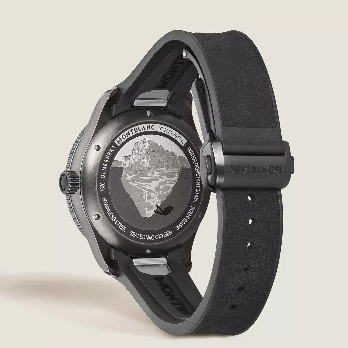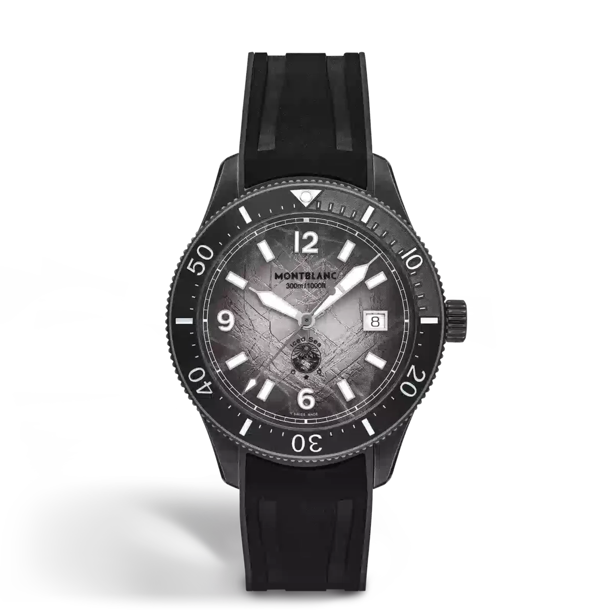 Montblanc Iced Sea Automatic Date 0 Oxygen med grå sfumato-urskive med gletschermønster giver indtryk af at kigge ned i gletscherens dyb. Inspireret af Mer de Glace er denne gletschertekstur opnået ved hjælp af en næsten glemt, gammel teknik kaldet gratté-boisé. Uret er indkapslet i et 41 mm rustikt stålhus, der er fuldstændig fri for ilt, og leveres med en ensrettet drejelig bezel med sort keramisk indsats, der er sænket med laser fra 0-15 minutter, en 3D-gravering på bagsiden af uret og en udskiftelig sort gummirem med finjusteringssystem. Uret overholder ISO 6425-normen for dykning og har en vandtæthed på 300 meter. Identifikationsnummer MB134017 Rembredde 20 mm