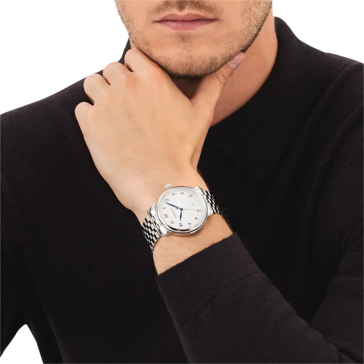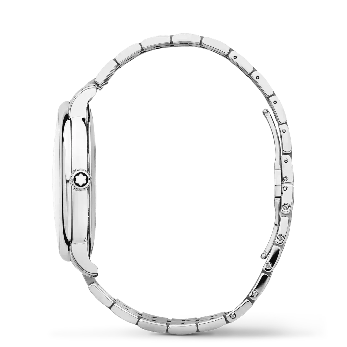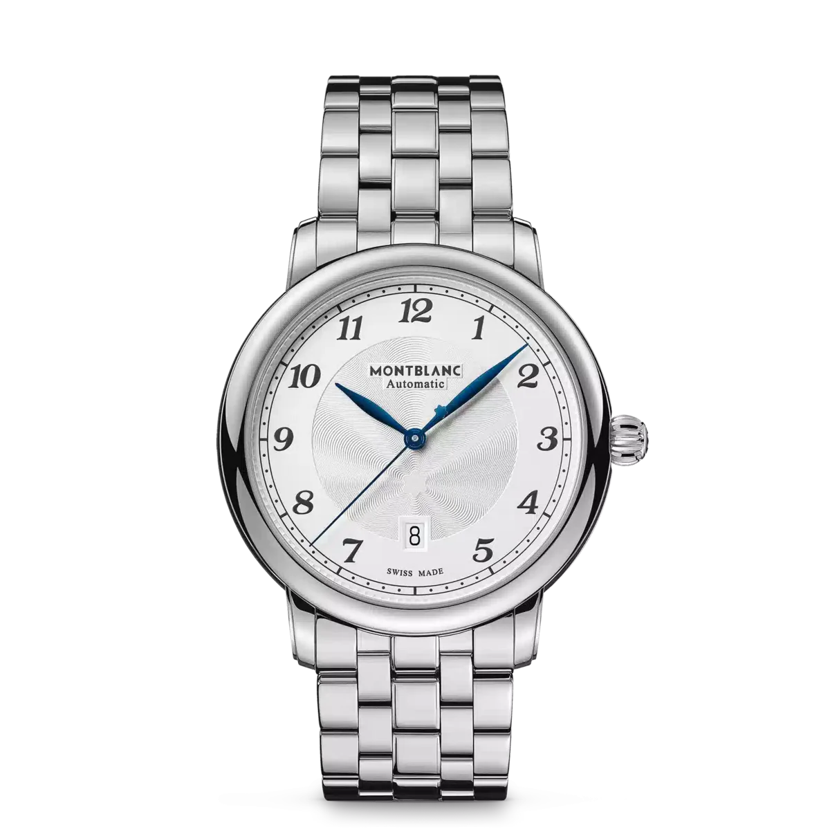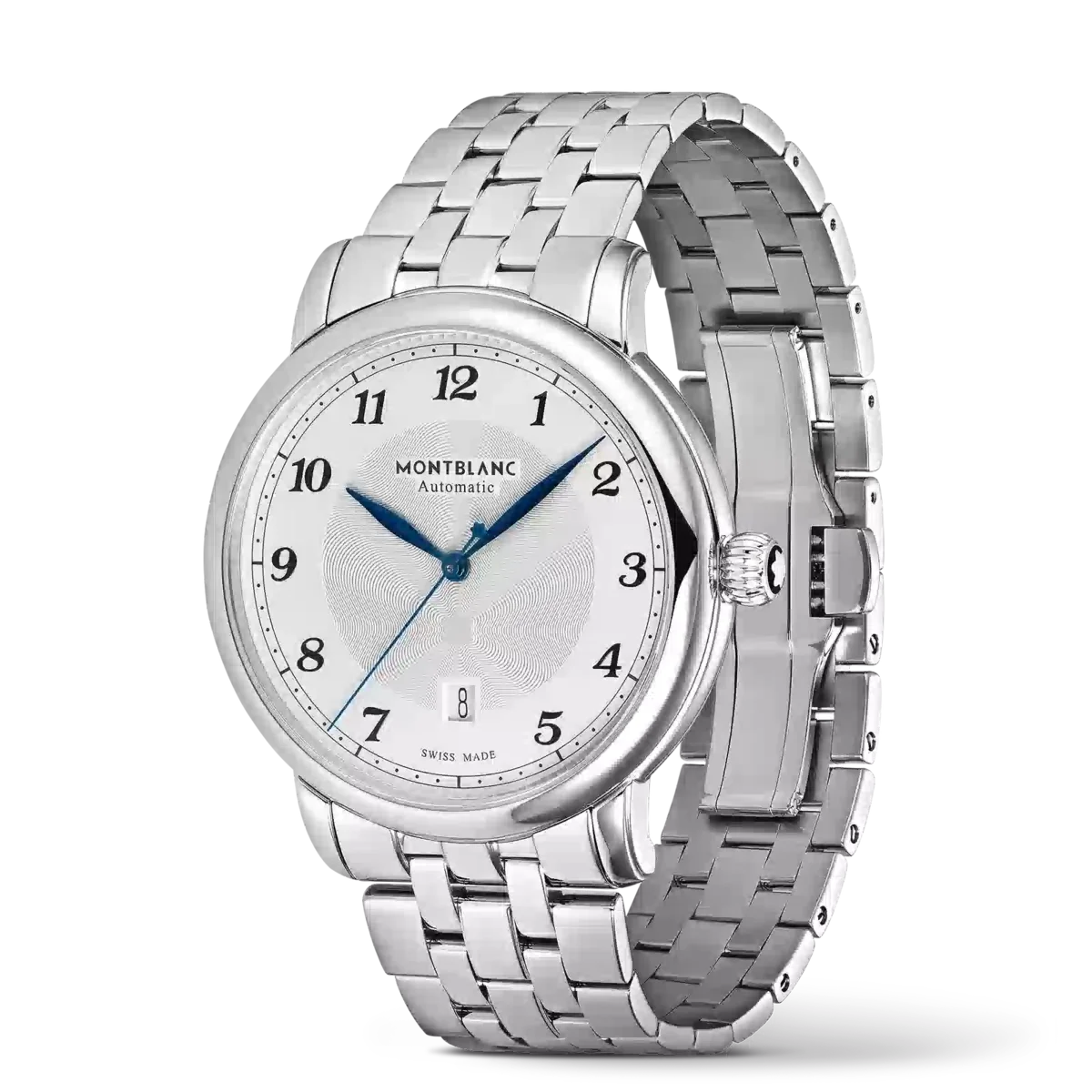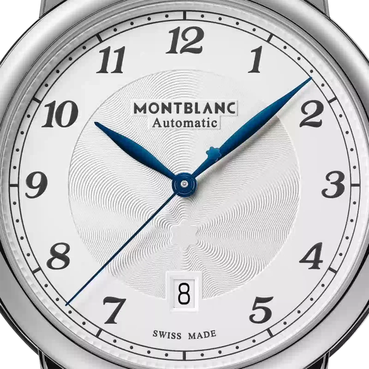 Montblanc Star Legacy-kollektionen er inspireret af Minervas arv og virksomhedens lommeure, der blev fremstillet i slutningen af 1800-tallet og begyndelsen af 1900-tallet. I tråd med produktlinjens designkoder har Montblanc Star Legacy Automatic Date en raffineret sølvhvid urskive med Montblancs eksploderende stjerne-guillochémønster, arabiske tal, bladformede visere, et “filet sauté”-guillochémotiv og en jernbanespor. Uret er udstyret med det automatiske kaliber MB 24.17 og har timer, minutter og sekunder i midten og en dato i en åbning ved klokken seks. Det kommer i en 42 mm rustfri stålkasse og er udstyret med et rustfrit stålarmbånd. Identifikationsnummer MB128682