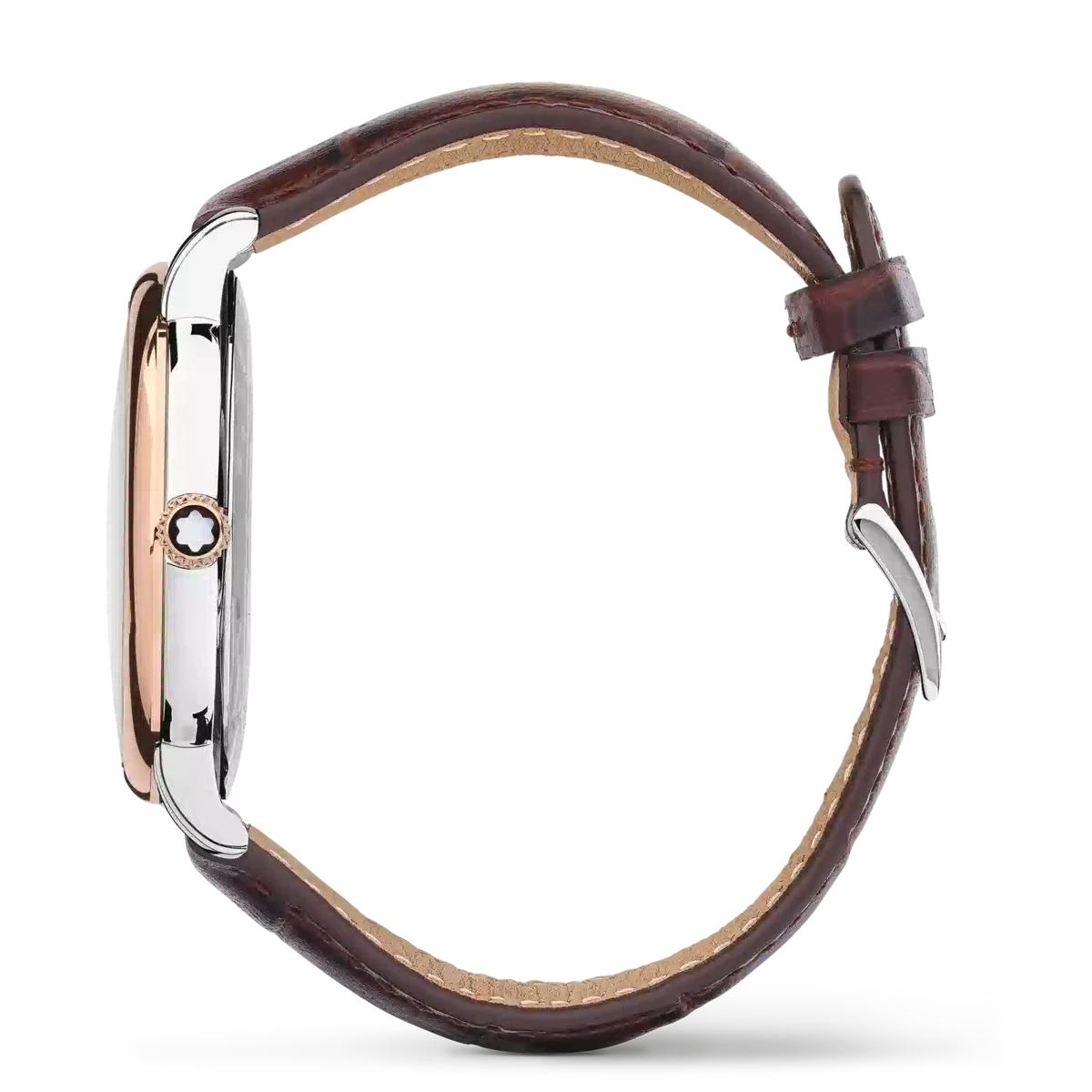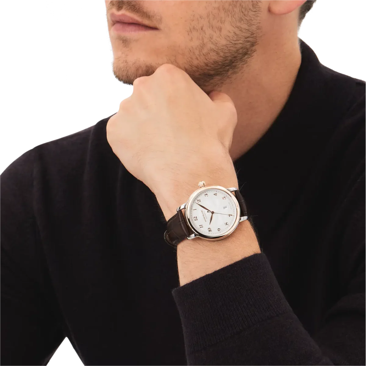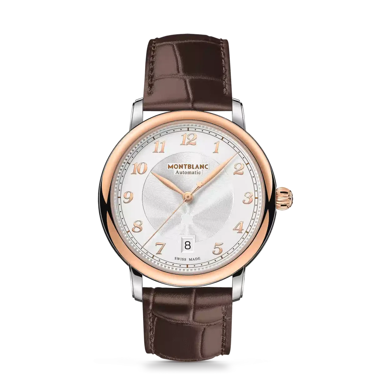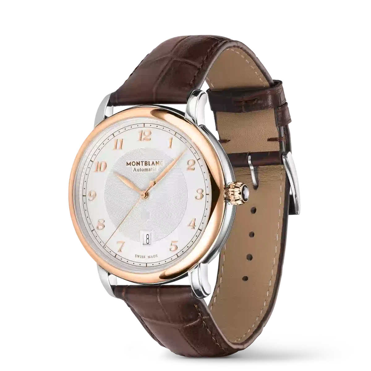 Montblanc Star Legacy-kollektionen er inspireret af Minervas arv og virksomhedens lommeure, der blev fremstillet i slutningen af 1800-tallet og begyndelsen af 1900-tallet. I tråd med produktlinjens designkoder har Montblanc Star Legacy Automatic Date en raffineret sølvhvid urskive med Montblancs eksploderende stjerne-guillochémønster, arabiske tal, bladformede visere, et “filet sauté”-guillochémotiv og en jernbanespor. Uret er udstyret med det automatiske kaliber MB 24.17 og har timer, minutter og sekunder i midten og en dato i en åbning ved klokken seks. Det kommer i en 42 mm rustfri stålkasse med rosaguld 750/1000 (18 karat) ramme og er udstyret med en brun kalveskindrem med alligatorprint.