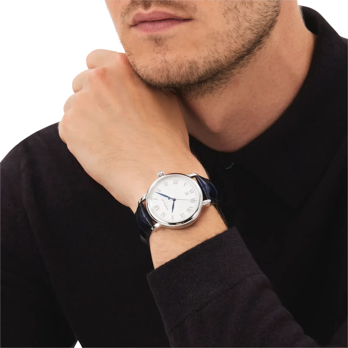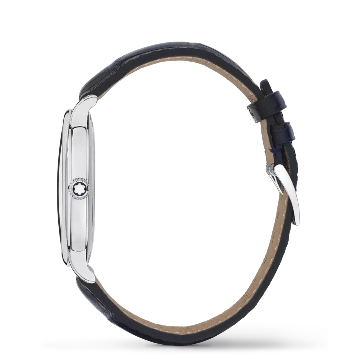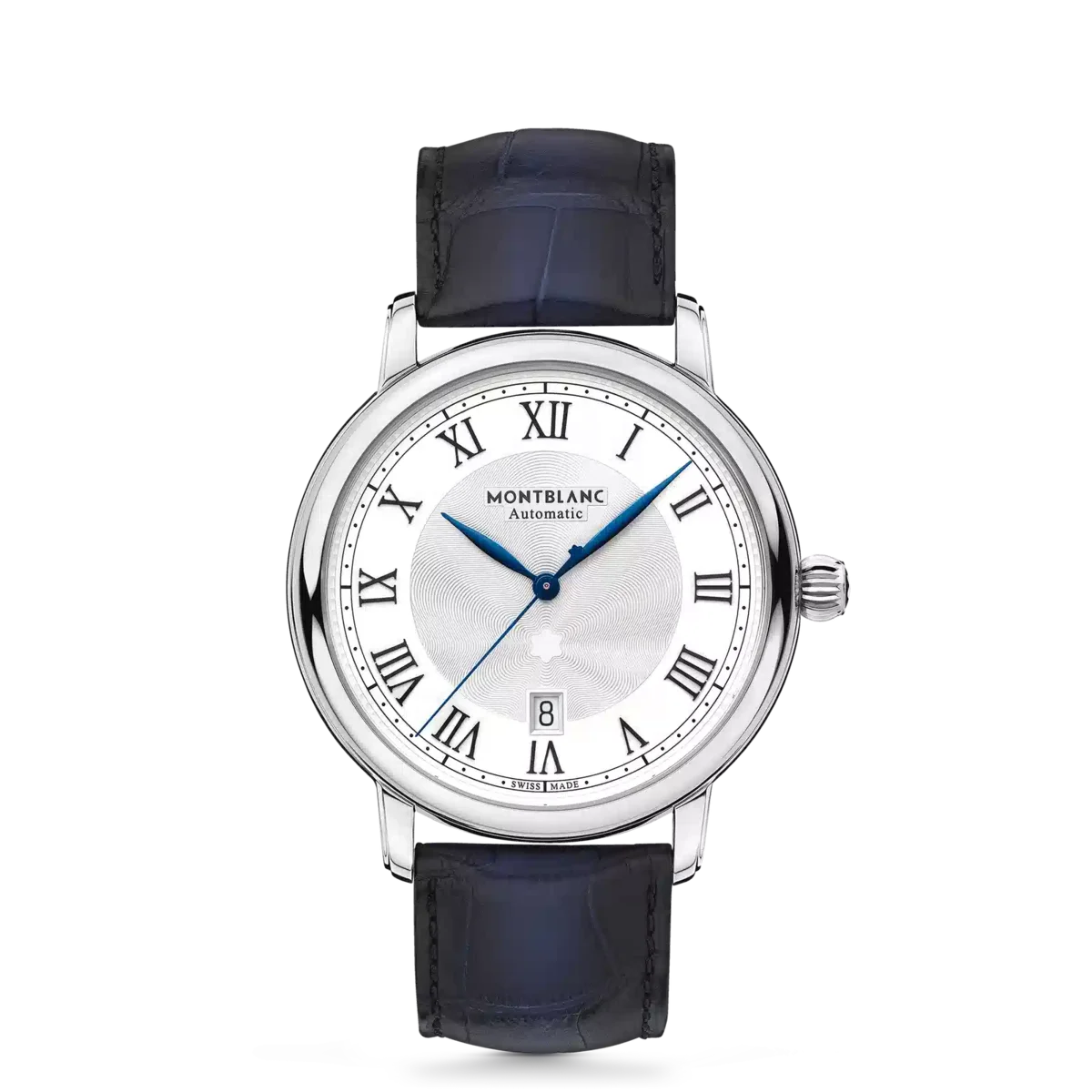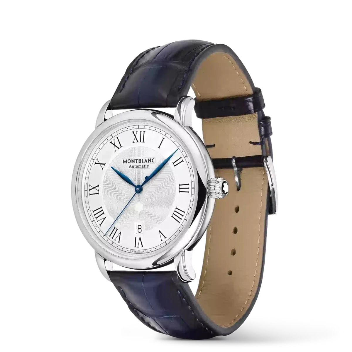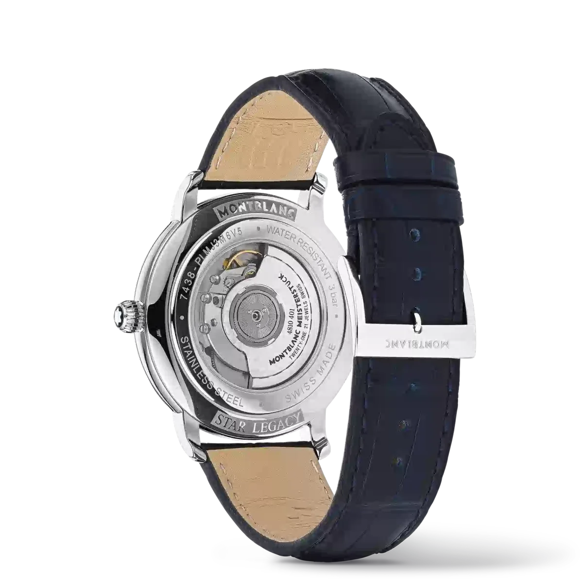 Montblanc Star Legacy-produktserien er inspireret af Minervas arv og virksomhedens lommeure, der blev fremstillet i slutningen af det 19. århundrede og begyndelsen af det 20. århundrede. I tråd med produktlinjens designkoder har Montblanc Star Legacy Automatic Date en raffineret sølvhvid urskive med Montblancs eksploderende stjerne-guillochémønster, romertal, bladformede visere, et “filet sauté”-guillochémotiv og en jernbanespor. Uret er udstyret med det automatiske kaliber MB 24.09 og har timer, minutter og sekunder i midten og en dato i en åbning ved klokken seks. Det kommer i en 42 mm rustfri stålkasse og er udstyret med en trendy blå sfumato alligator læderrem. Identifikationsnummer MB131209 Lug bredde 21 mm