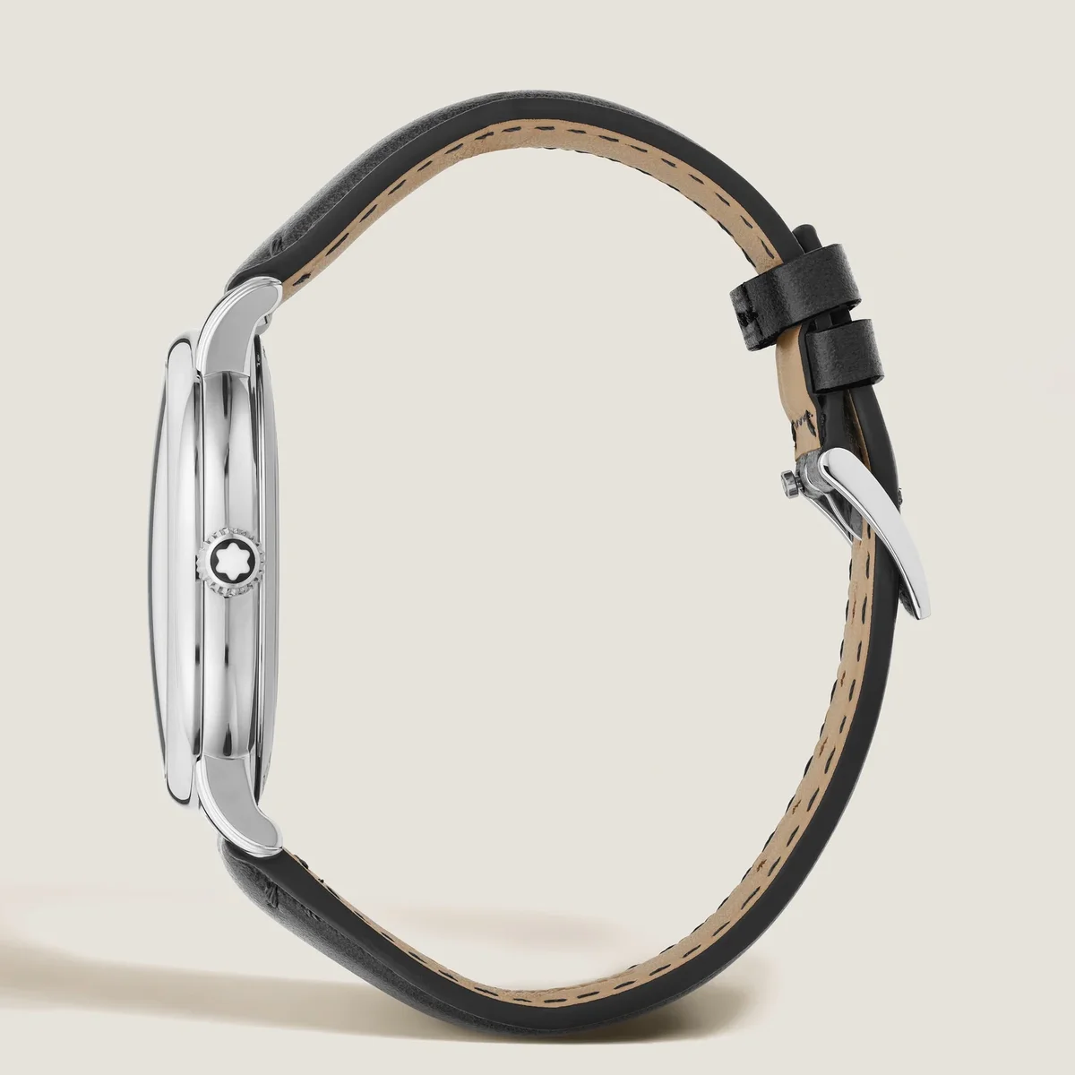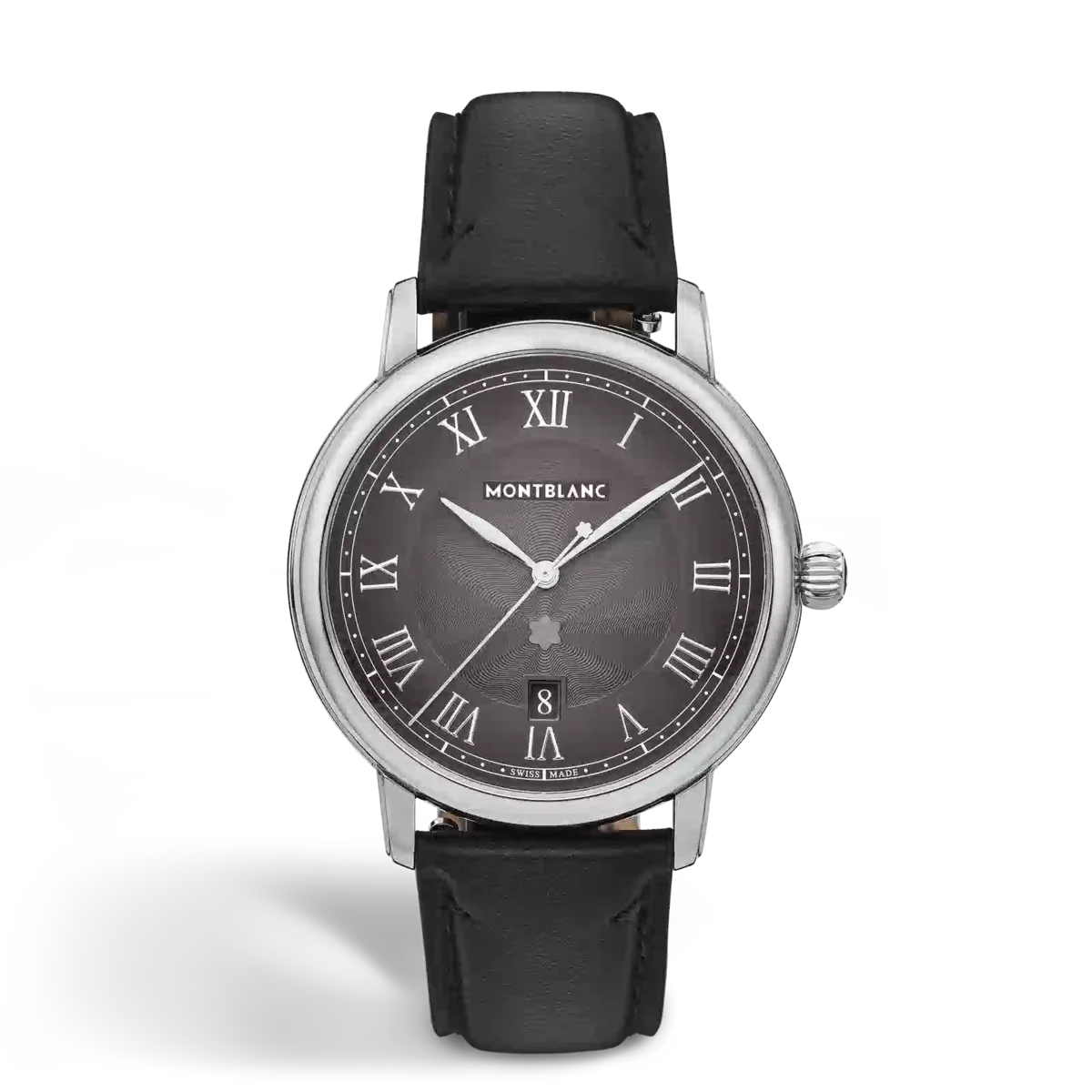 Montblanc Star Legacy Automatic Date tager Maison’s fineste designkoder til et nyt niveau af elegance. Uret har en sfumato antracit urskive med eksploderende stjerne guilloché-motiv, en filet sauté, rhodiumbelagte romertal, bladformede visere og viser timer, minutter, sekunder og dato på en enkel og elegant måde. Denne model drives af det automatiske urværk MB 24.17 og er anbragt i et 42 mm rustfrit stålhus i stenform med en åben bagside, der giver udsigt til den oscillerende vægt dekoreret med Montblanc-emblemet. Den antracitfarvede udskiftelige kalveskindrem er specielt designet af Montblancs kunstneriske direktør Marco Tomasetta, der fandt inspiration i Maison’s skriveinstrumenters spidser med deres spidse form, forstærket med en lodret sfumato-effekt. Identifikationsnummer MB134359 Lugbredde 21 mm