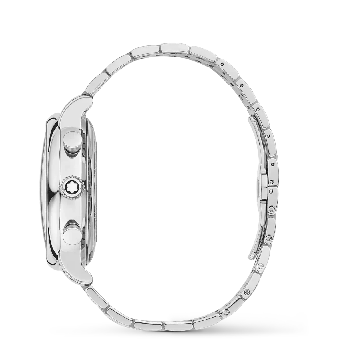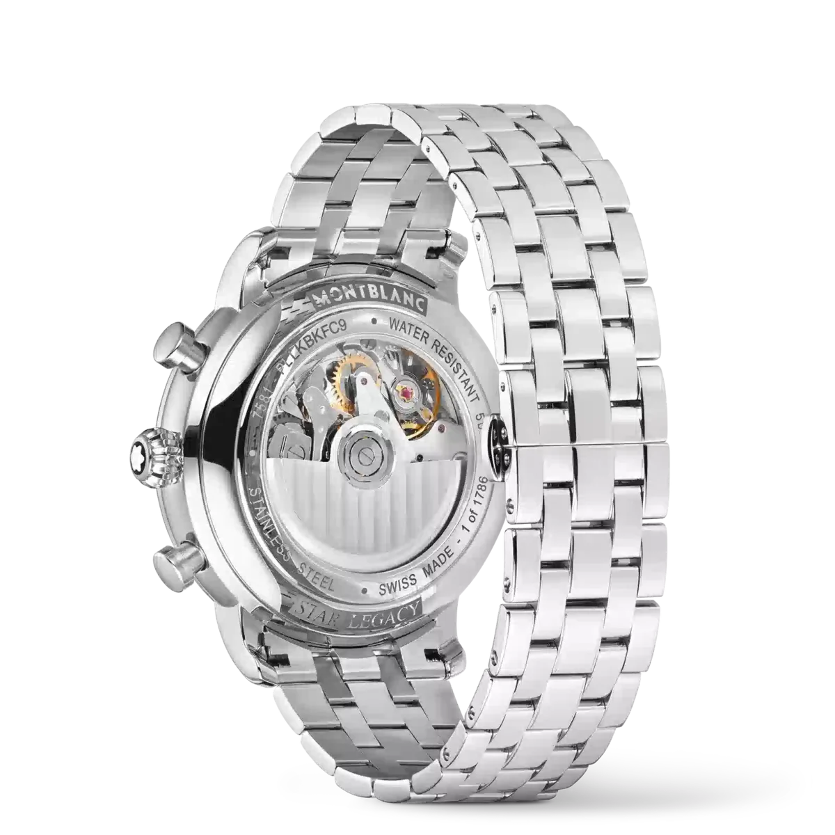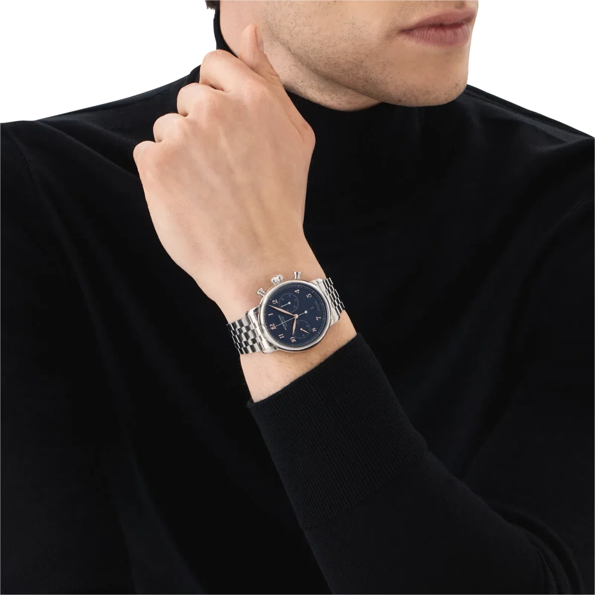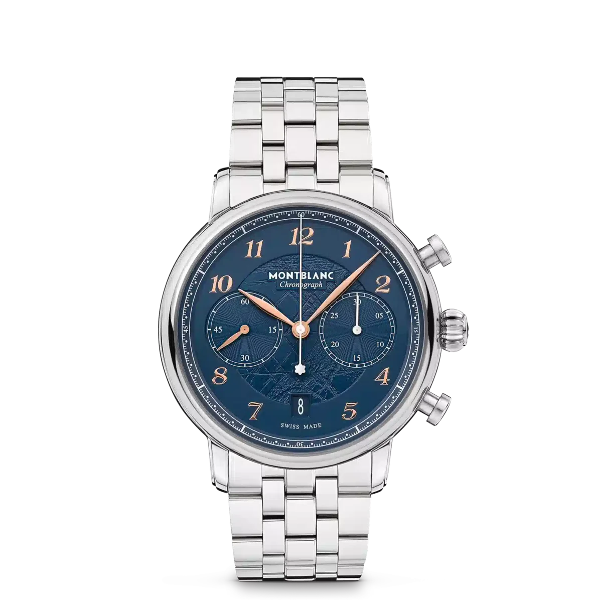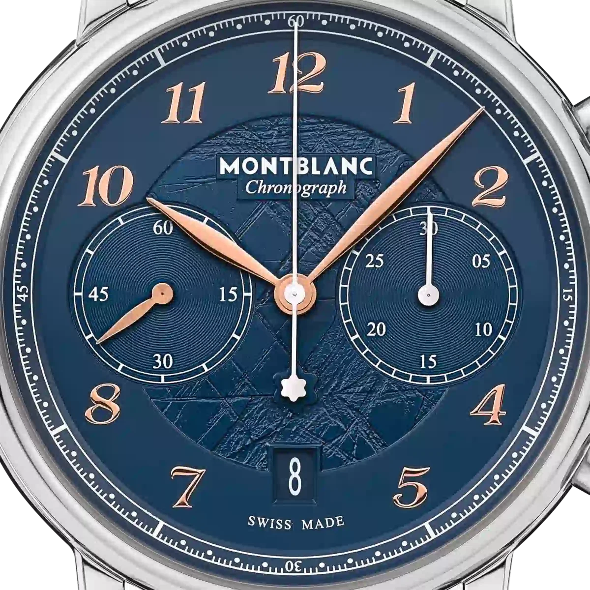 Montblanc Star Legacy Chronograph er begrænset til 1786 eksemplarer og kommer i en 42 mm stenformet rustfri stålkasse med rosaguldbelagte arabiske tal og en iøjnefaldende blå urskive med gletschermønster. Urskiven er dekoreret med et lagdelt isdesign, der er inspireret af Mer de Glace, den største gletscher på Mont Blanc-bjerget. Midten af urskiven er skabt ved hjælp af et specielt stempel, der gengiver denne gletschertekstur og hylder den “blå time” – “l’heure bleue” – hvor en intens blå nuance falder over gletscheren i skumringen, når månen står op, og stjernerne begynder at skinne. Det var på dette tidspunkt af dagen, at Jacques Balmat blev den første person, der nåede toppen af Mont Blanc – kl. 18.23 den 7. august 1786. Funktionerne omfatter timer, minutter, centrale sekunder med et Montblanc-emblem på modvægten, kronograf og dato, som drives af det automatiske urværk MB 25.13, der kan beundres gennem en bagkasse af safirglas. Tidsfunktionerne vises med rosaguldbelagte bladformede visere, mens kronografindikationerne bruger rhodiumbelagte “baton”-visere. Uret er parret med et rustfrit stålarmbånd. Identifikationsnummer: MB129627