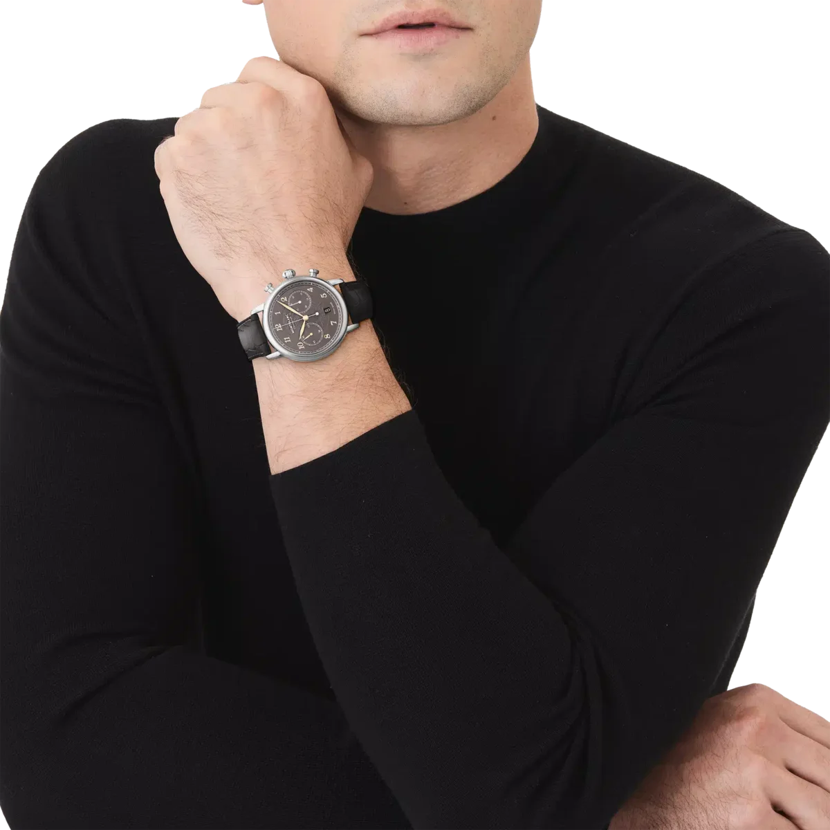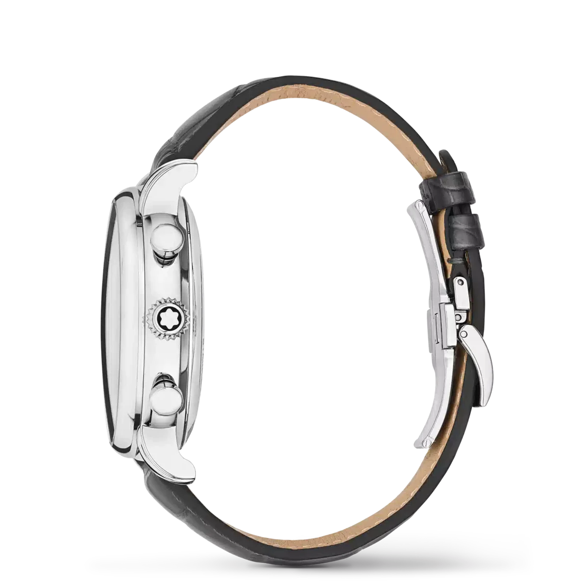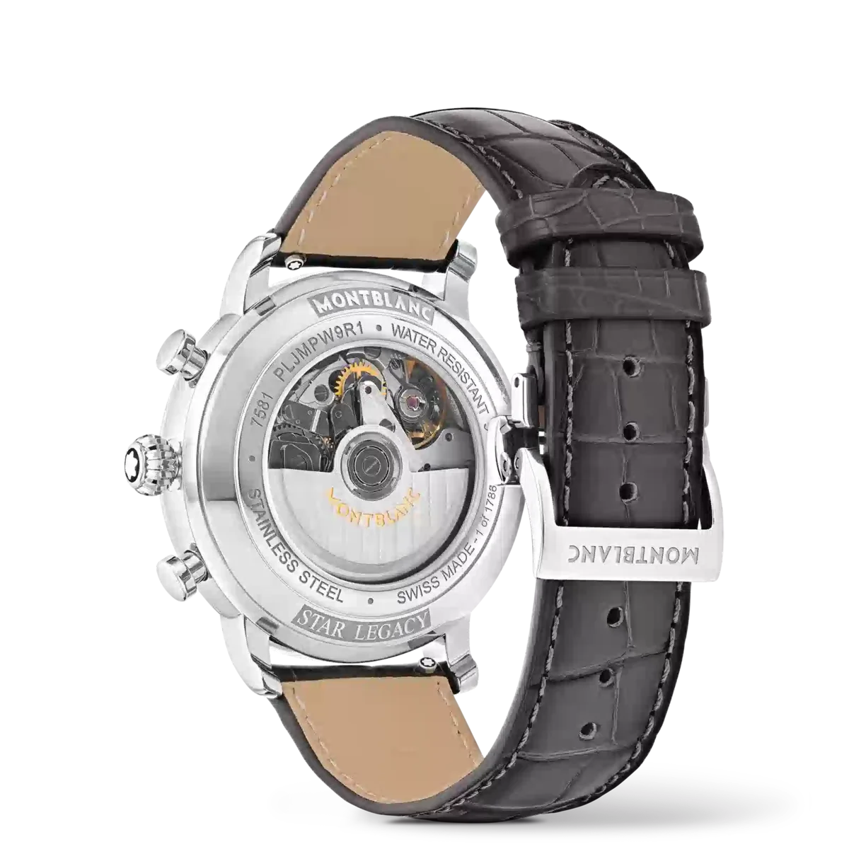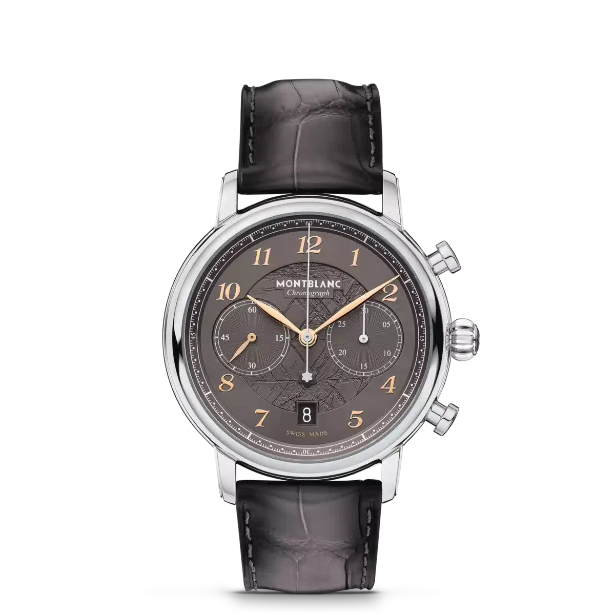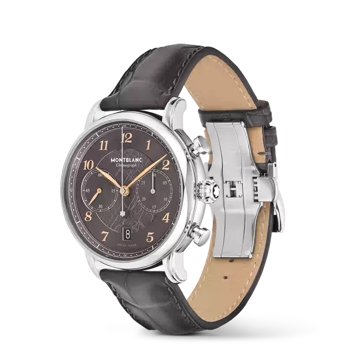 Montblanc Star Legacy Chronograph Limited Edition i 1786 eksemplarer kommer i en 42 mm rustfri stålkasse, der fremhæver en ny facet af Mont Blanc – dens sydvendte klippeside. Dette ur har to chronograf-tællere ved klokken tre og ni, der giver et elegant look og vigtig læsbarhed. Det grå gletschermønster kan ses i baggrunden, mens filet sauté er erstattet med en indvendig flange for at give urskiven mere volumen. Tidsfunktionerne vises med rosaguldbelagte, bladformede visere, mens chronografindikationerne bruger rhodiumbelagte “baton”-visere. Uret leveres med en udskiftelig grå kalveskindrem med alligatorprint. Identifikationsnummer MB130960 Lugbredde 21 mm