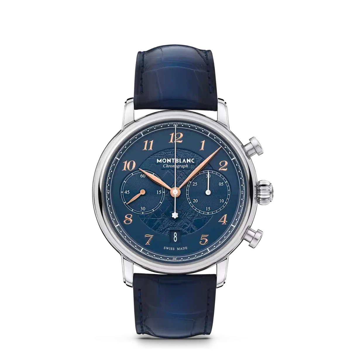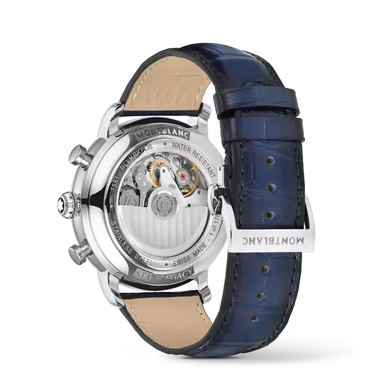 Montblanc Star Legacy Chronograph er begrænset til 1786 eksemplarer og kommer i en 42 mm stenformet rustfri stålkasse med rosaguldbelagte arabiske tal og en iøjnefaldende blå urskive med gletschermønster. Urskiven er dekoreret med et lagdelt isdesign, der er inspireret af Mer de Glace, den største gletscher på Mont Blanc. Midten af urskiven er skabt ved hjælp af et specielt stempel, der gengiver denne gletschertekstur og hylder den “blå time” – “l’heure bleue” – hvor en intens blå nuance falder over gletscheren i skumringen, når månen står op og stjernerne begynder at skinne. Det var på dette tidspunkt af dagen, at Jacques Balmat blev den første person, der nåede toppen af Mont Blanc – kl. 18.23 den 7. august 1786. Funktionerne omfatter timer, minutter, centrale sekunder med et Montblanc-emblem på modvægten, kronograf og dato, der drives af det automatiske urværk MB 25.13, som kan beundres gennem en bagkasse af safirglas. Tidsfunktionerne vises med rosaguldbelagte bladformede visere, mens chronografindikationerne bruger rhodiumbelagte “baton”-visere. Uret er parret med en blå sfumato alligatorrem. Identifikationsnummer MB129626 Lugbredde 21 mm