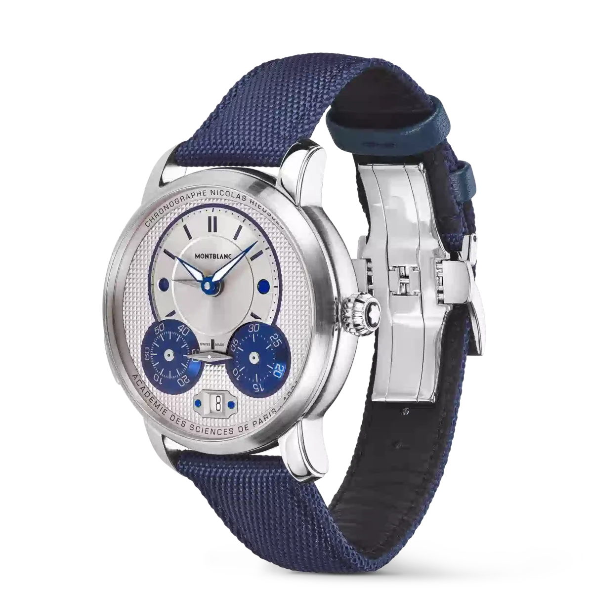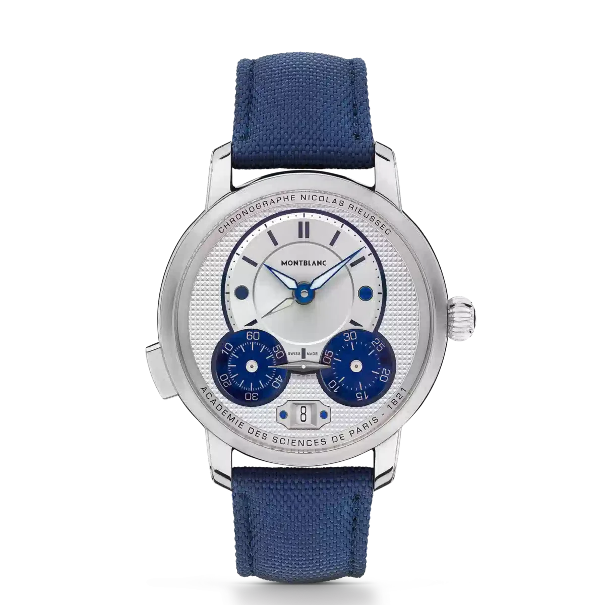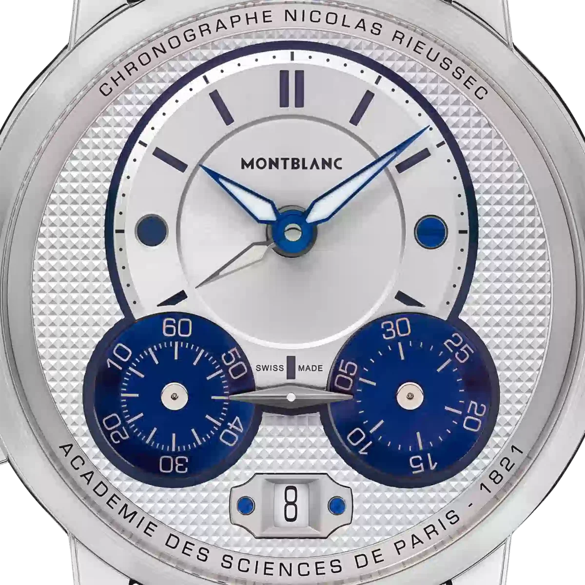 Montblanc Star Legacy Nicolas Rieussec Chronograph 43 mm er en hyldest til den blækbaserede kronograf, der først blev testet af Nicolas Rieussec i 1821 i Paris og godkendt af Académie des Sciences. Denne nye version kommer i et 43 mm rustfrit stålkabinet med en grå og blå urskive. Clou de Paris-motiver findes på urskiven, svingvægten og det blå tekstilrem, der minder om Paris’ brostensbelagte gader. Funktionerne omfatter en kronograf, dag- og natindikation, anden tidszone og dato. Uret drives af MB R200 Montblanc Manufacture monopusher-kronografværket. Identifikationsnummer MB129764 Lugbredde 21 mm