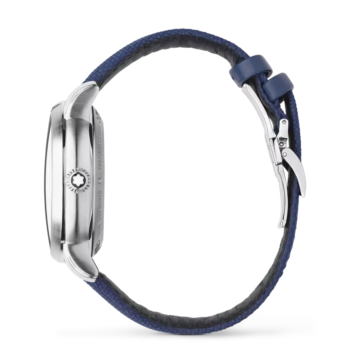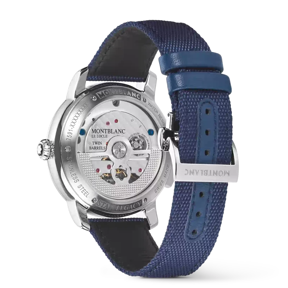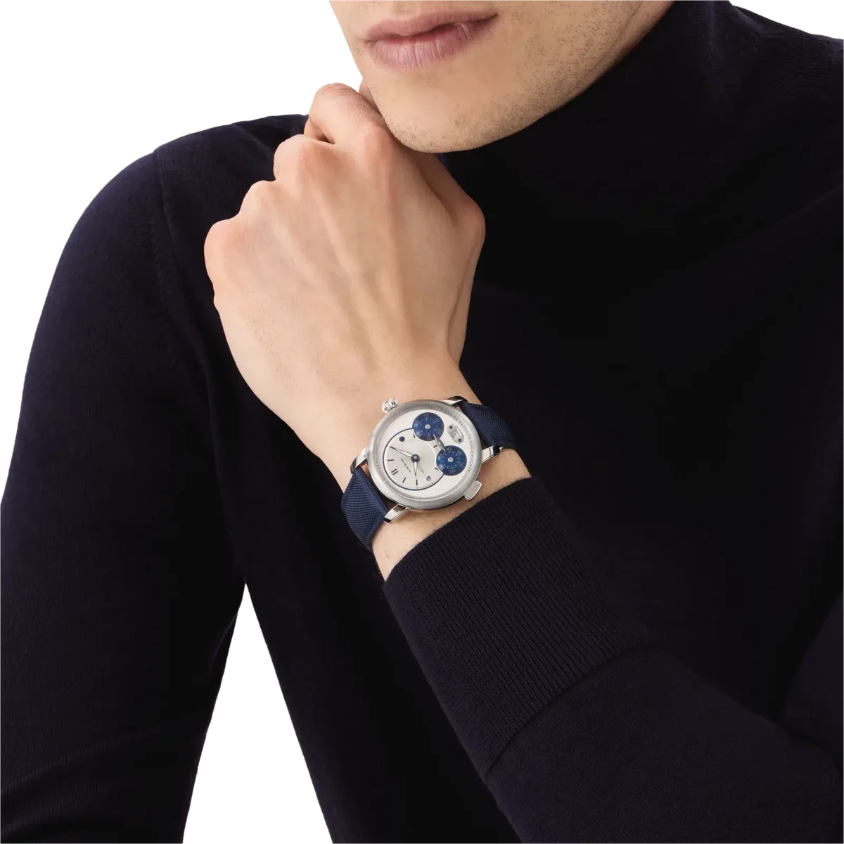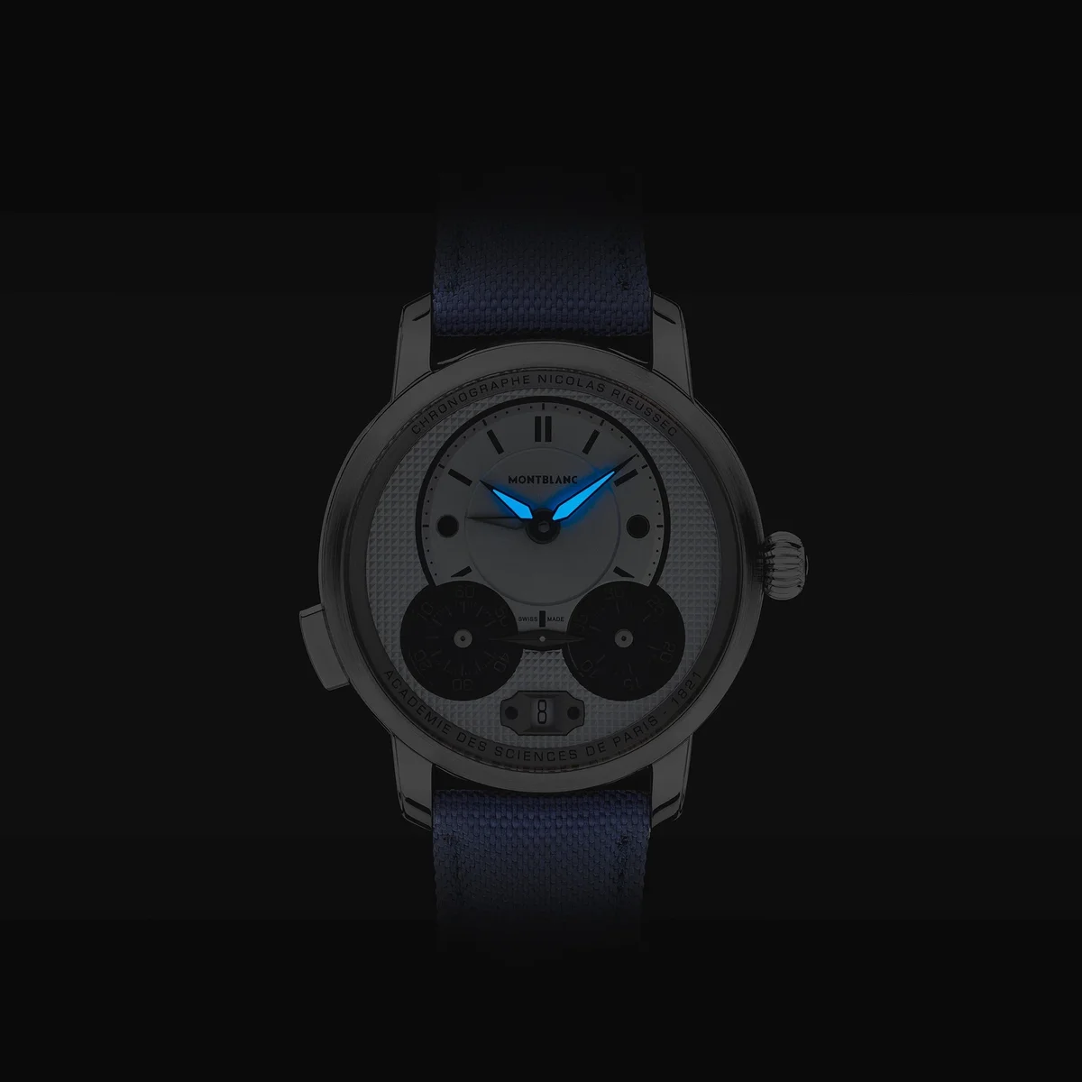 Montblanc Star Legacy Nicolas Rieussec Chronograph 43 mm er en hyldest til den blækbaserede kronograf, der først blev testet af Nicolas Rieussec i 1821 i Paris og godkendt af Académie des Sciences. Denne nye version kommer i et 43 mm rustfrit stålkabinet med en grå og blå urskive. Clou de Paris-motiver findes på urskiven, svingvægten og det blå tekstilrem, der minder om Paris’ brostensbelagte gader. Funktionerne omfatter en kronograf, dag- og natindikation, anden tidszone og dato. Uret drives af MB R200 Montblanc Manufacture monopusher-kronografværket. Identifikationsnummer MB129764 Lugbredde 21 mm