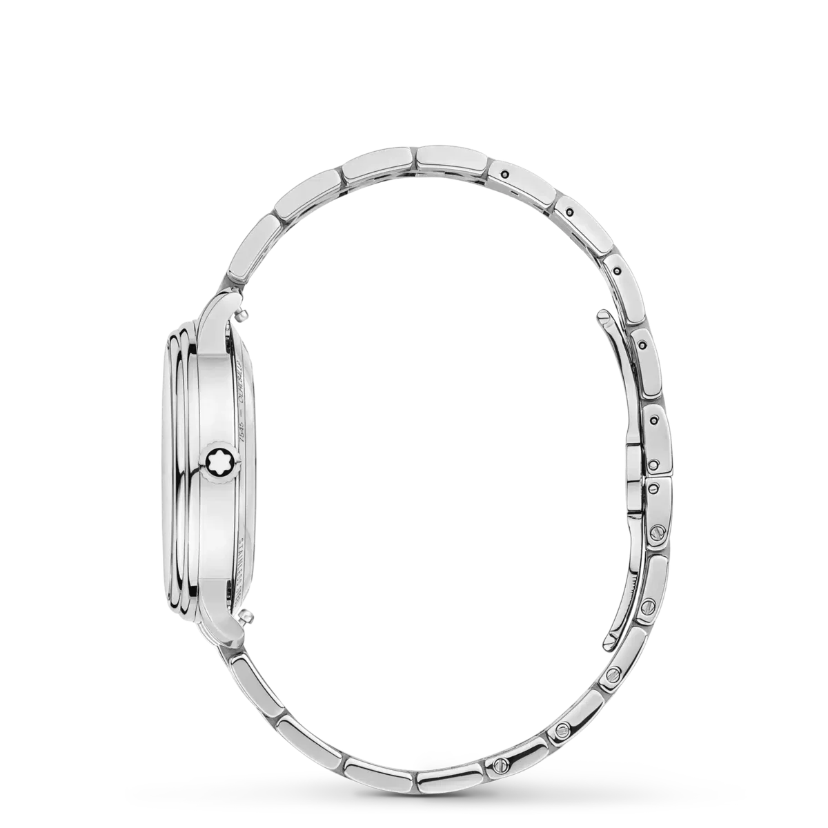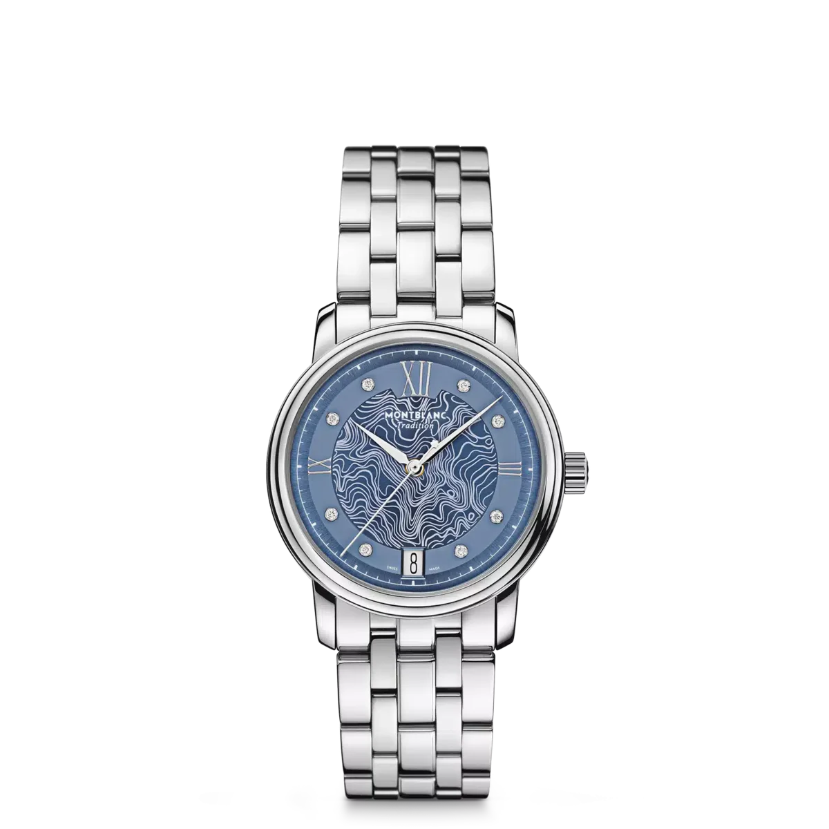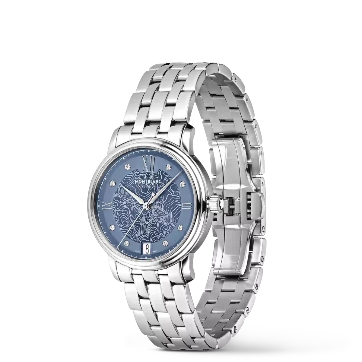 Montblanc Tradition Automatic Date fås i en 32 mm rustfri stålkasse med lige horn og en dobbeltformet bezel. Uret har en blå urskive, der viser topografien af Mont Blanc med diamantindekser, sølvfarvede romertal og et fremtrædende romertal “XII”. De sværdformede time- og minutvisere, sekundviseren og kronen med Montblanc-emblemet samt det udskiftelige rustfri stålarmbånd fuldender det moderne, elegante udseende.