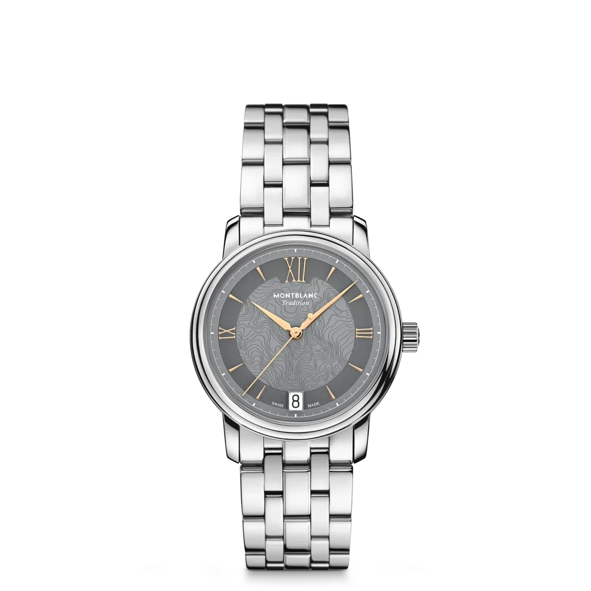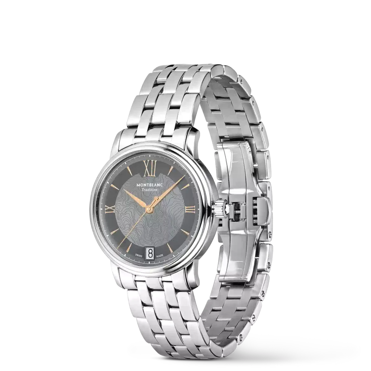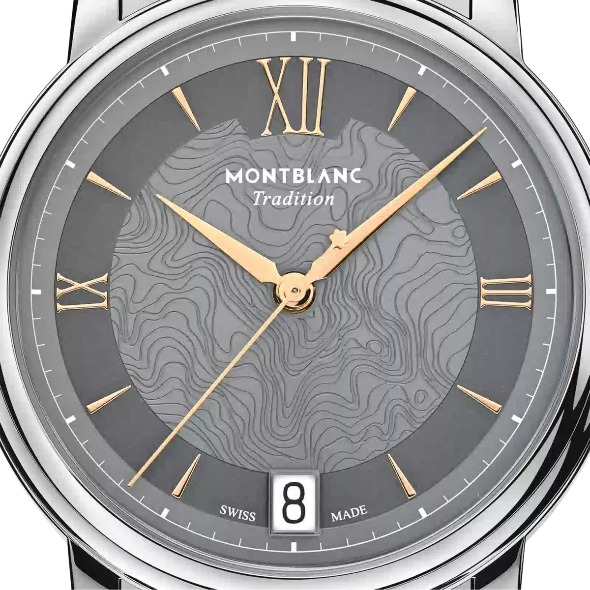 Montblanc Tradition Automatic Date kommer i en 32 mm rustfri stålkasse med lige horn og en dobbeltformet bezel. Uret har en grå urskive, der viser topografien af Mont Blanc med rosaguldfarvede romertal og et fremtrædende romertal “XII”. De sværdformede time- og minutvisere, sekundviseren og kronen med Montblanc-emblemet samt det udskiftelige rustfri stålarmbånd fuldender det moderne, elegante udseende.