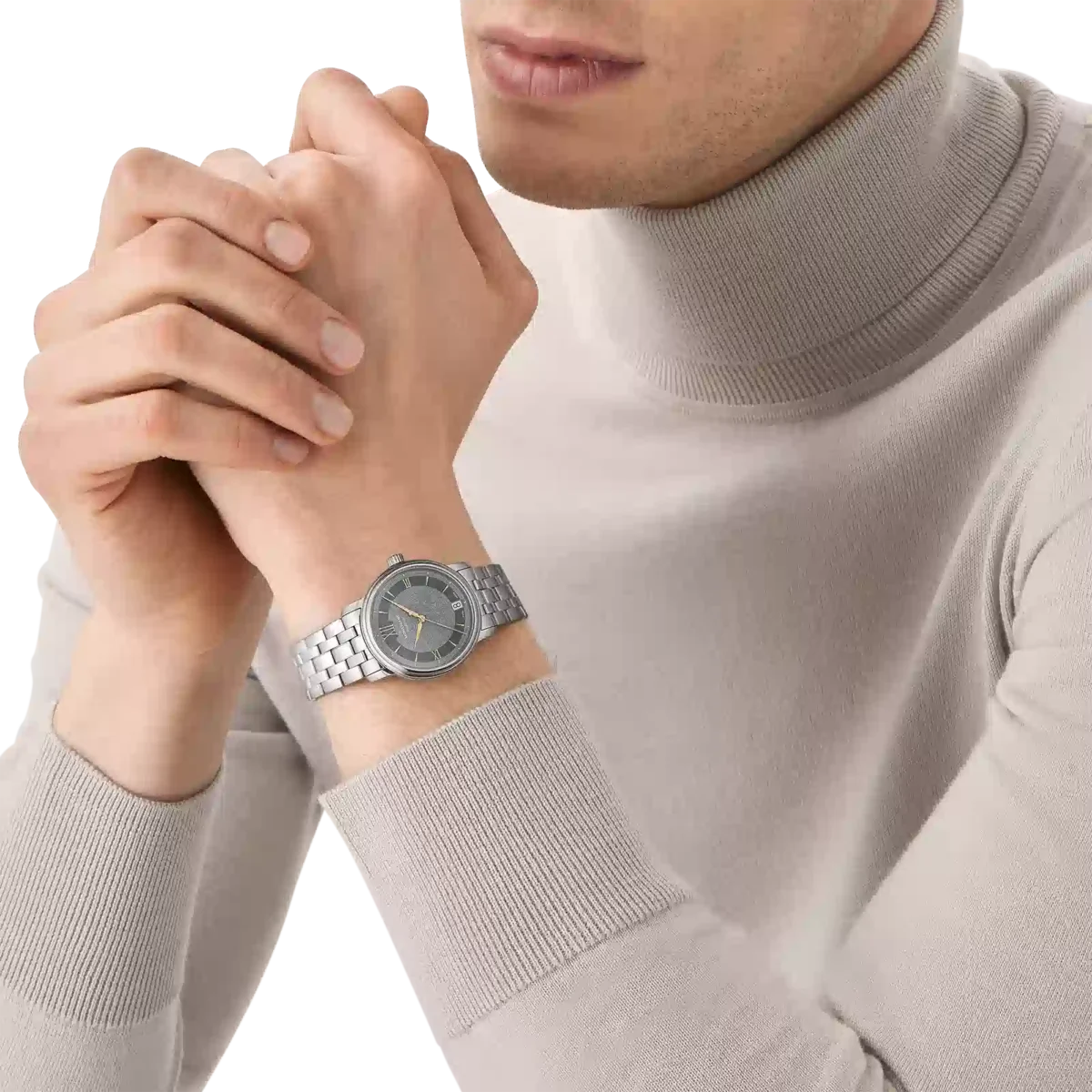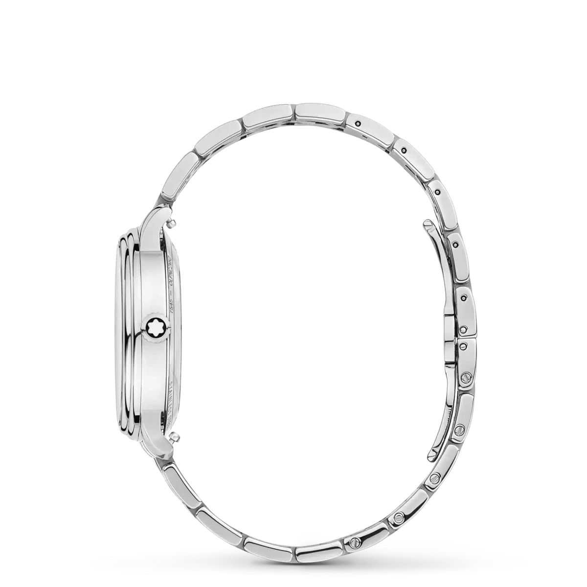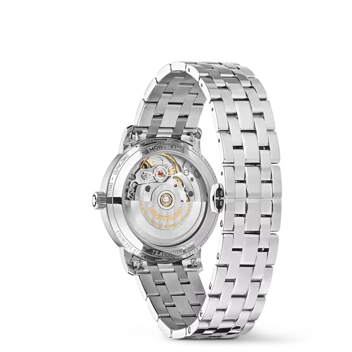 Montblanc Tradition Automatic Date kommer i en 32 mm rustfri stålkasse med lige horn og en dobbeltformet bezel. Uret har en grå urskive, der viser topografien af Mont Blanc med rosaguldfarvede romertal og et fremtrædende romertal “XII”. De sværdformede time- og minutvisere, sekundviseren og kronen med Montblanc-emblemet samt det udskiftelige rustfri stålarmbånd fuldender det moderne, elegante udseende.