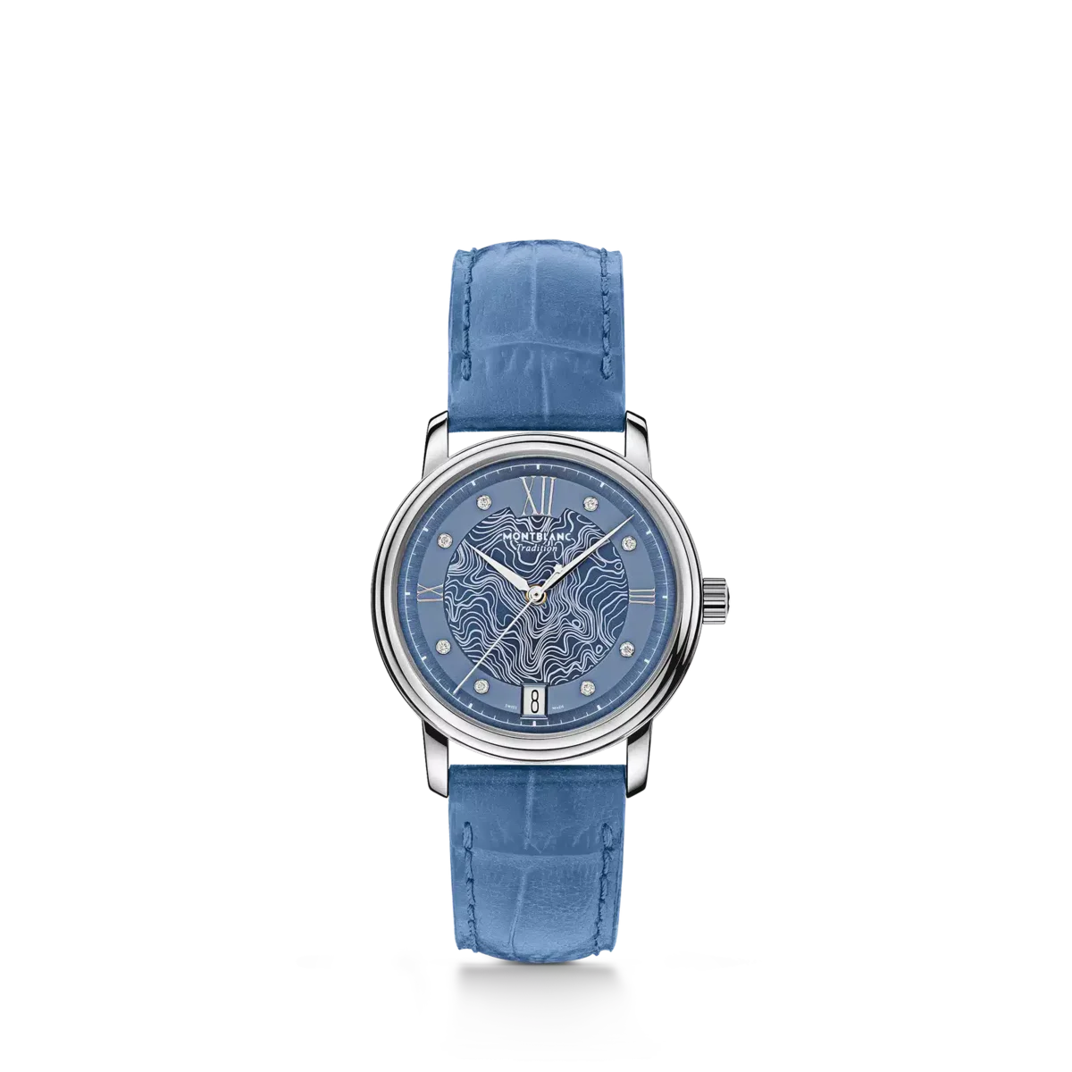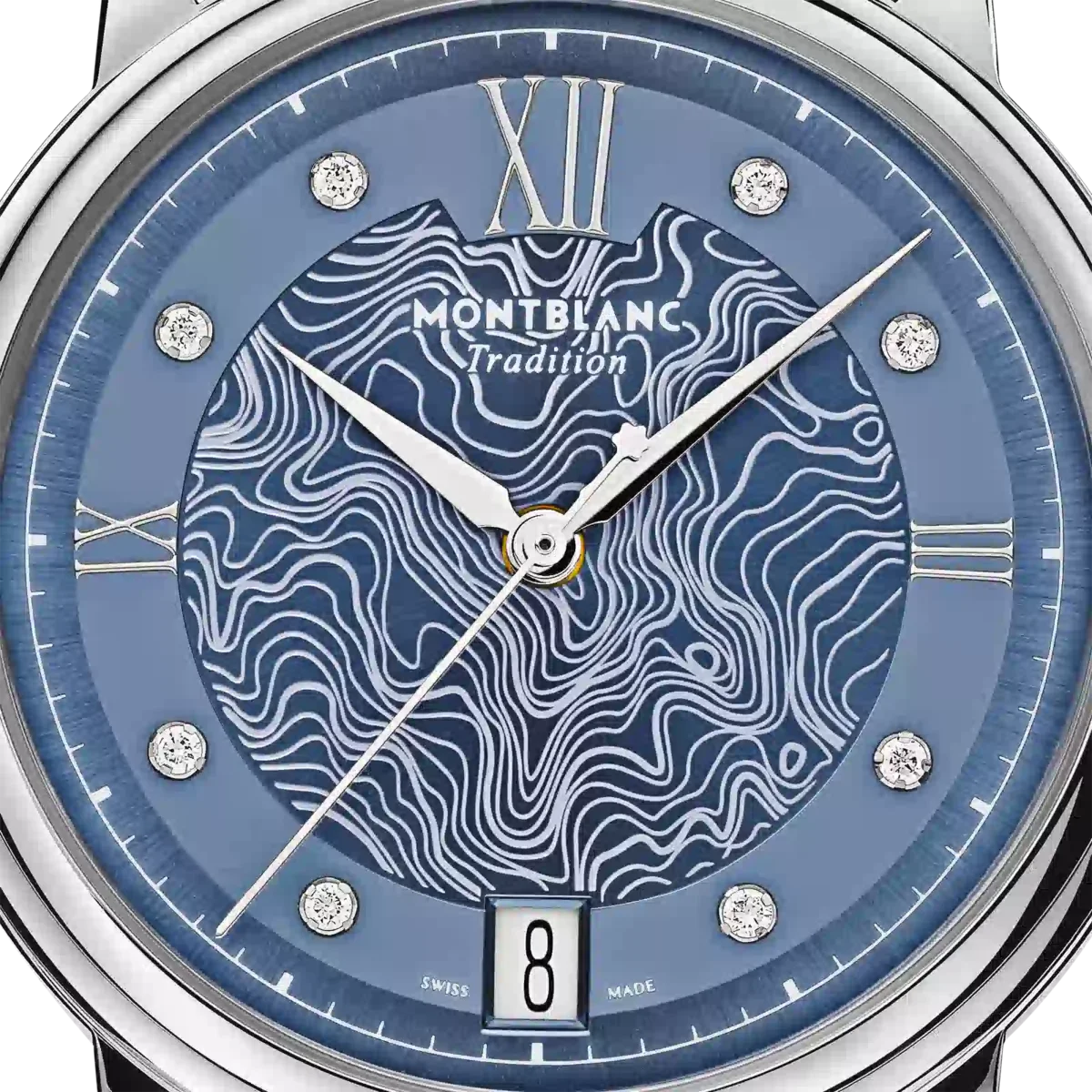 Montblanc Tradition Automatic Date fås i en 32 mm rustfri stålkasse med lige horn og en dobbeltformet ramme. Uret har en blå urskive, der viser topografien af Mont Blanc med diamantindekser, sølvfarvede romertal og et fremtrædende romertal “XII”. De sværdformede time- og minutvisere, sekundviseren og kronen med Montblanc-emblem samt den blå udskiftelige kalveskindrem fuldender det moderne, elegante udseende.