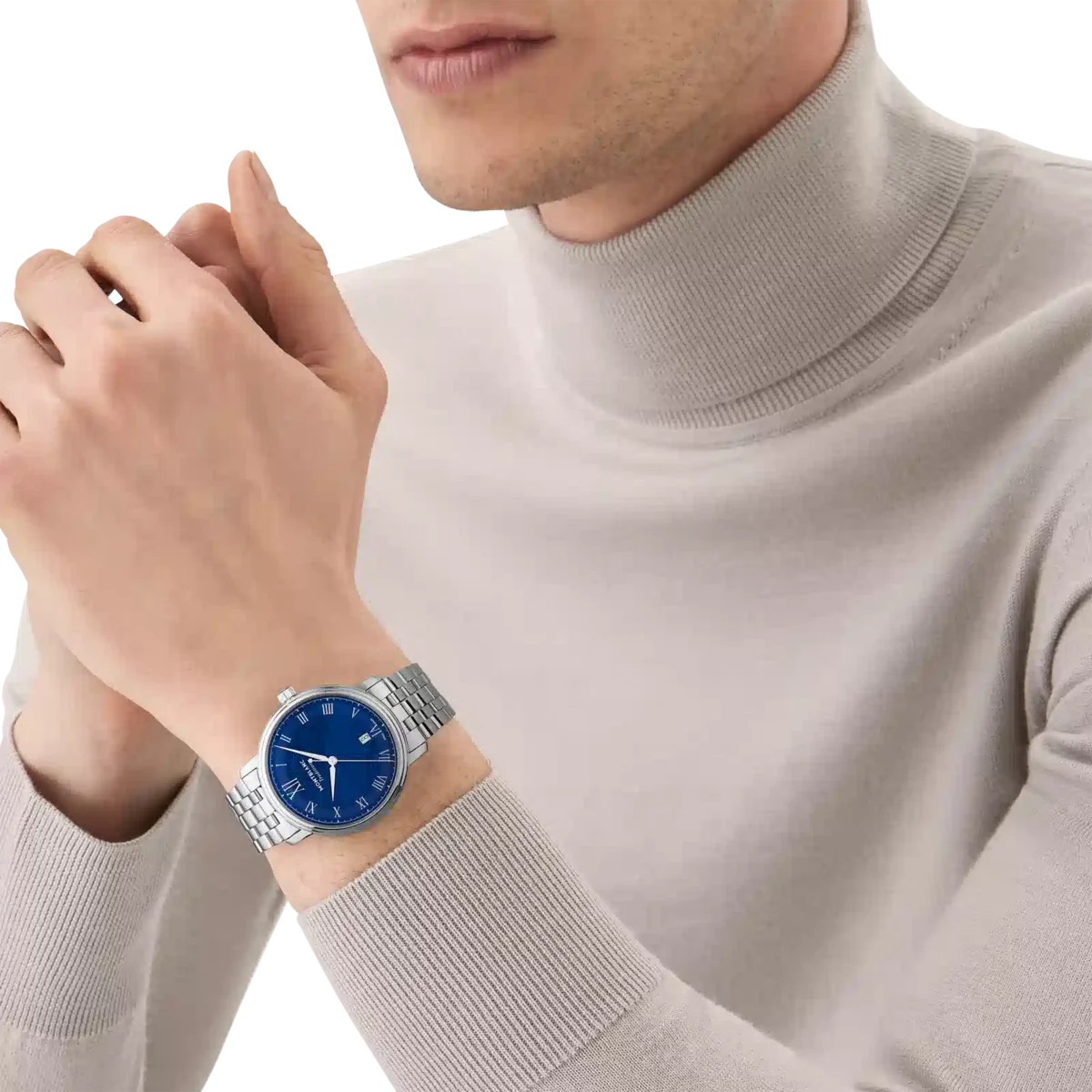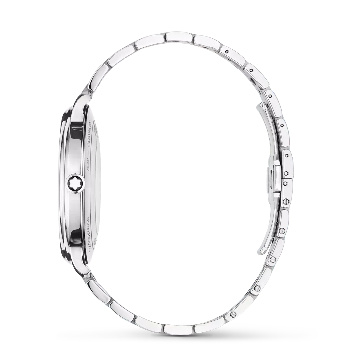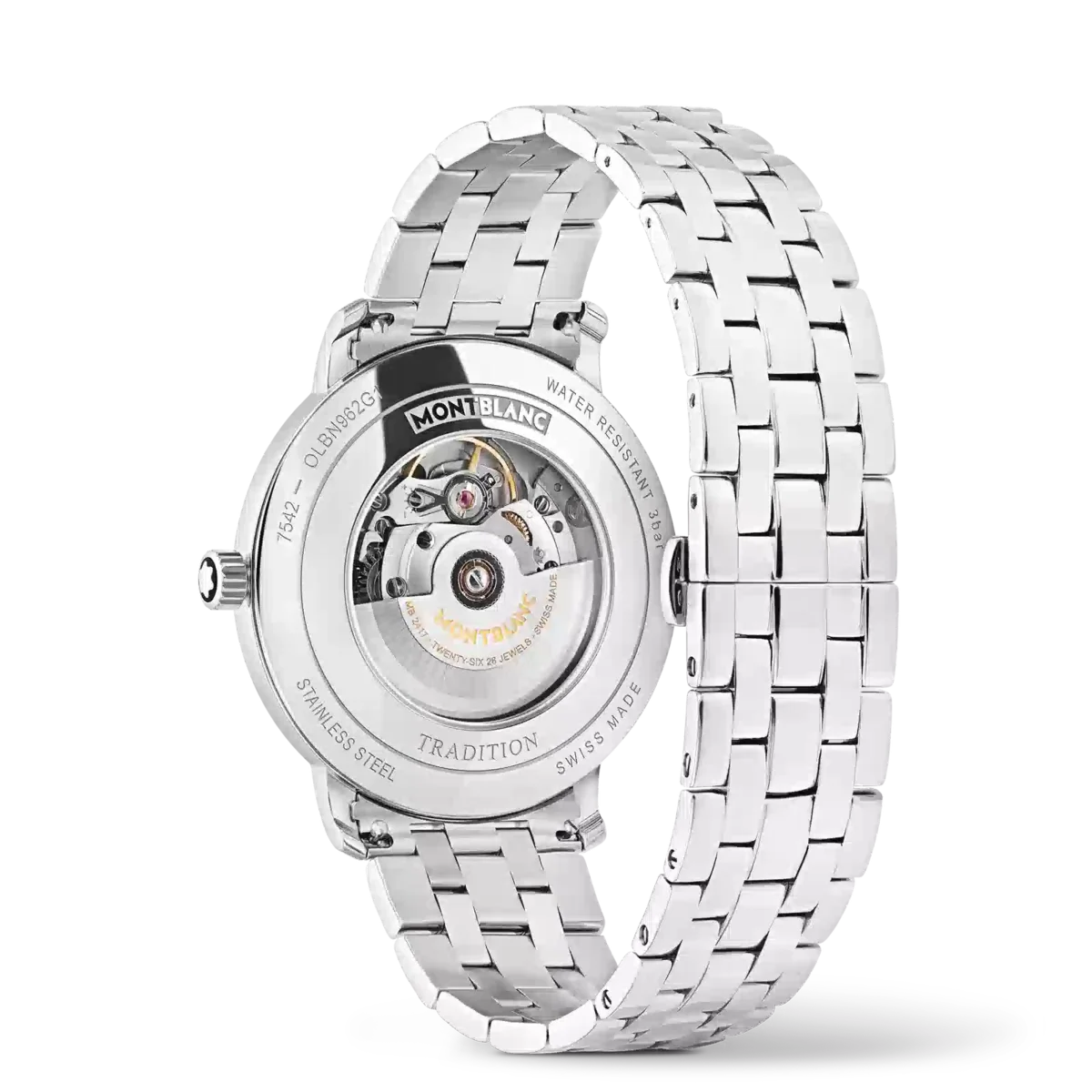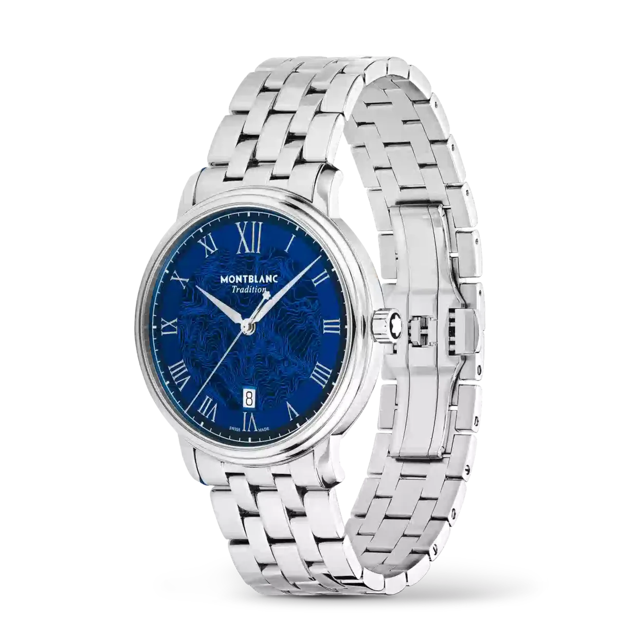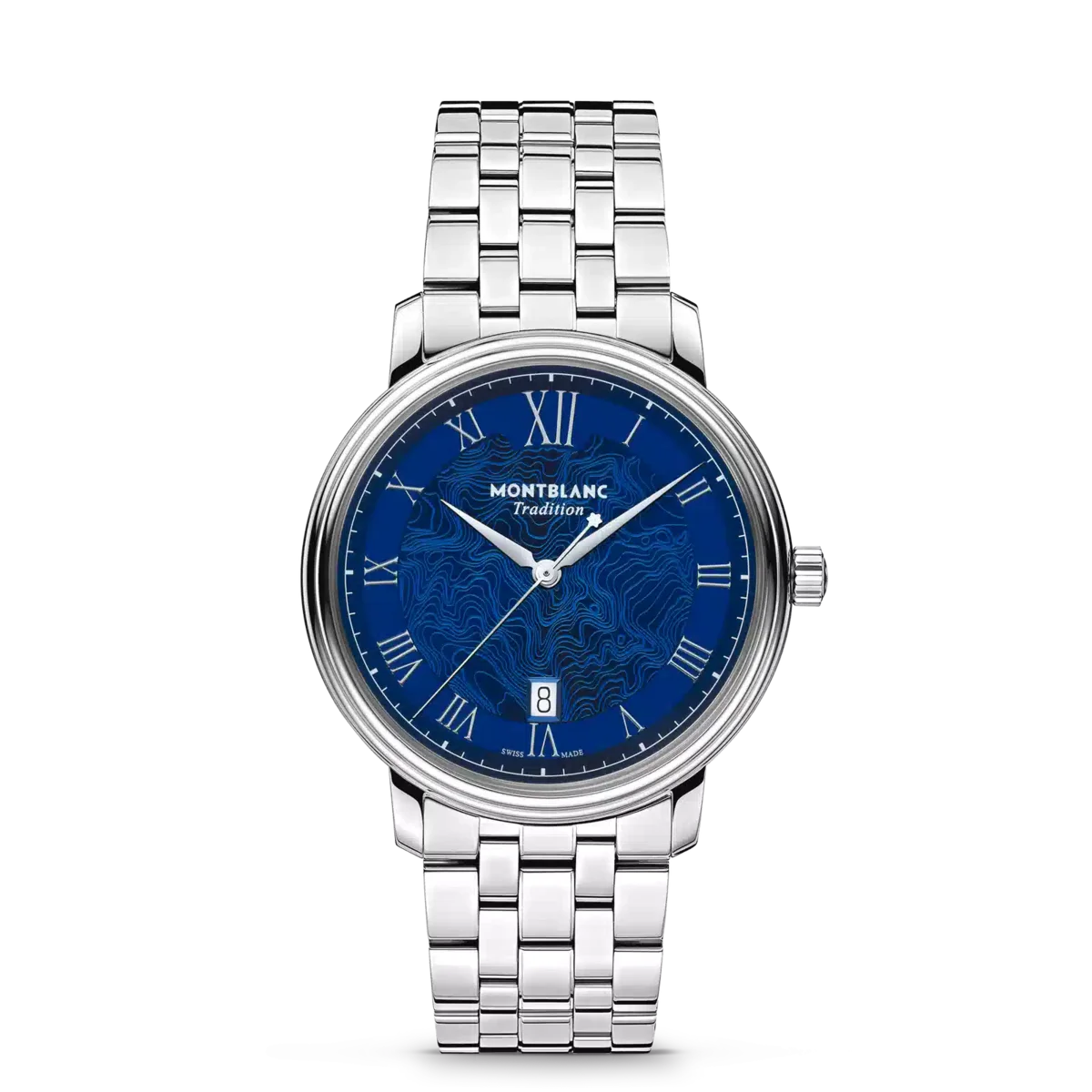 Montblanc Tradition Automatic Date fås i en 40 mm rustfri stålkasse med lige horn og en dobbeltformet bezel. Uret har en blå urskive, der viser topografien af Mont Blanc med sølvfarvede romertal og et fremtrædende romertal “XII”. De sværdformede time- og minutvisere, sekundviseren og kronen med Montblanc-emblemet samt det udskiftelige rustfri stålarmbånd fuldender det moderne, elegante udseende.