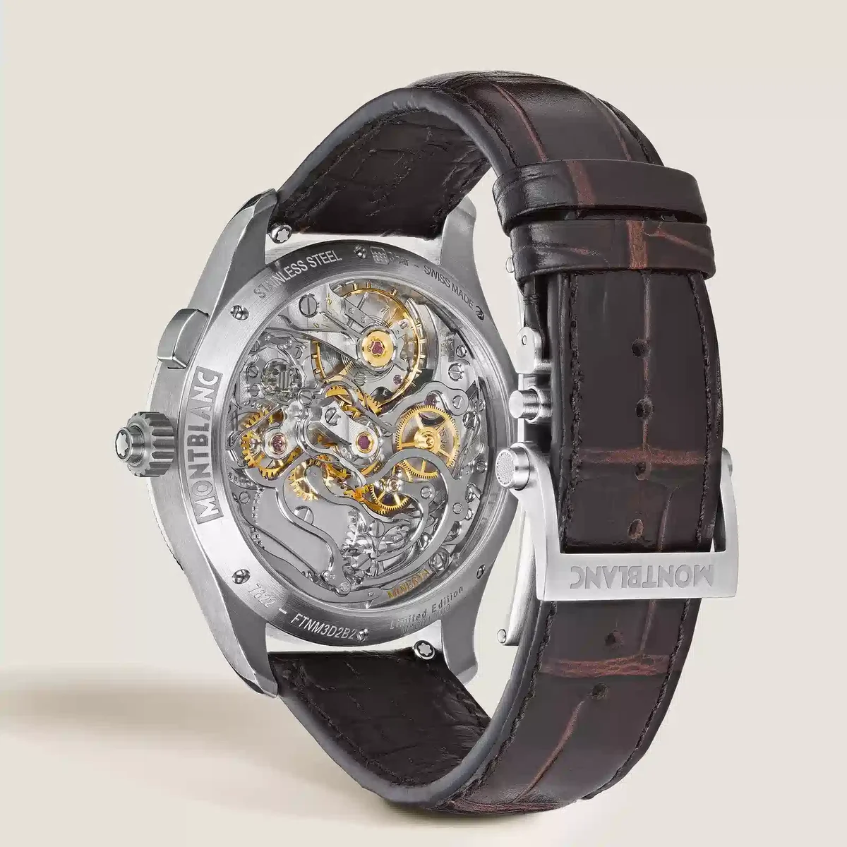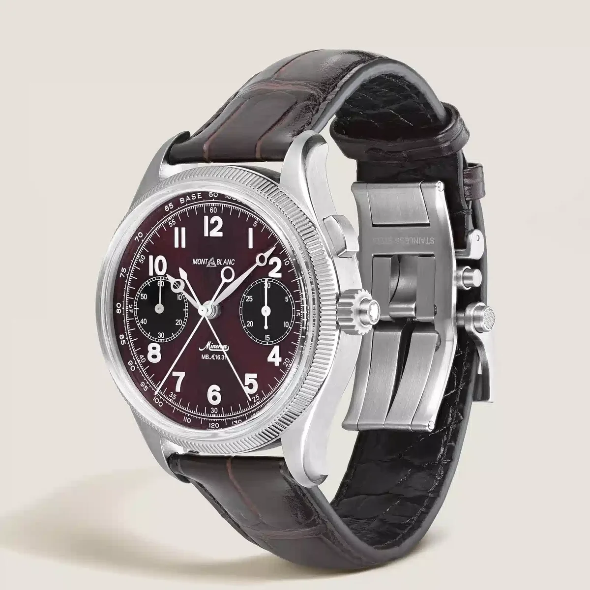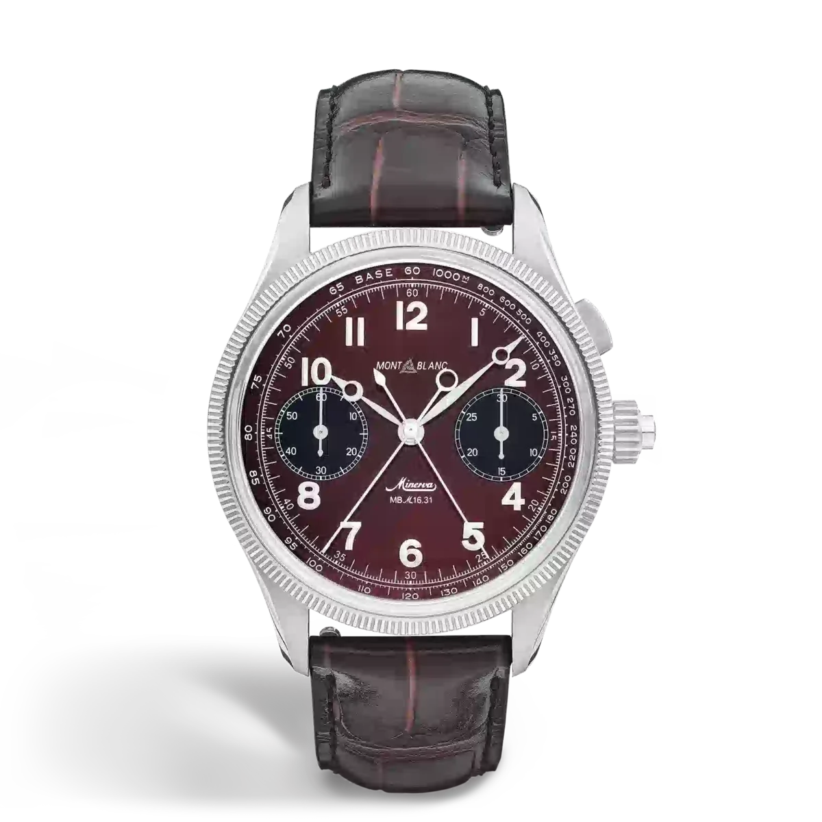 Montblanc 1858 Split Second Chronograph Limited Edition er inspireret af en tidlig 42 mm militær monopusher split second chronograph fra 1930’erne. Denne nye model har et 44 mm rustfrit stålkabinet med en fast riflet bezel i hvidguld 750/1000 (18 karat). Urskiven er i en mørk burgunderfarve med solstråle-dekoration, sorte chronograph-tællere og hvide selvlysende arabertal, der giver et elegant look. Urskiven er let at aflæse og har et vintage-look, der forstærkes af vintage-formede time-, minut- og sekundvisere, en central split-second-viser og en 30-minutters chronograph-tæller. Ligesom på det originale ur løber en tachymeterskala (base 1000) rundt om urskiven. Bagkassen afslører det håndlavede, manuelt optrækkelige, monopusher, split-sekunds chronografkaliber MB M16.31, der giver brugeren mulighed for at måle mellemliggende tider uden at afbryde den igangværende måling af en længere forløbet tid. Uret er udstyret med en mørk burgunderfarvet udskiftelig kalveskindrem med alligatorprint og en tredobbelt foldelås i rustfrit stål med finjusteringssystem.