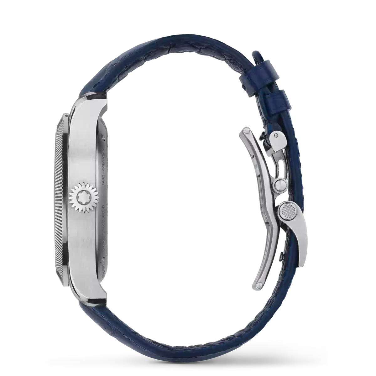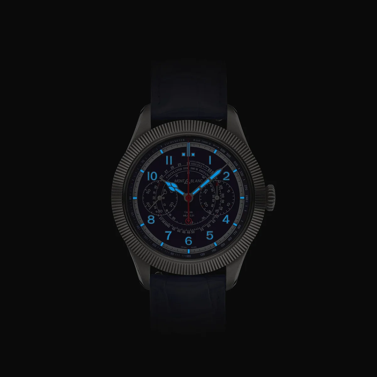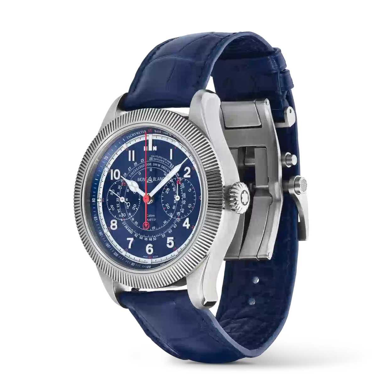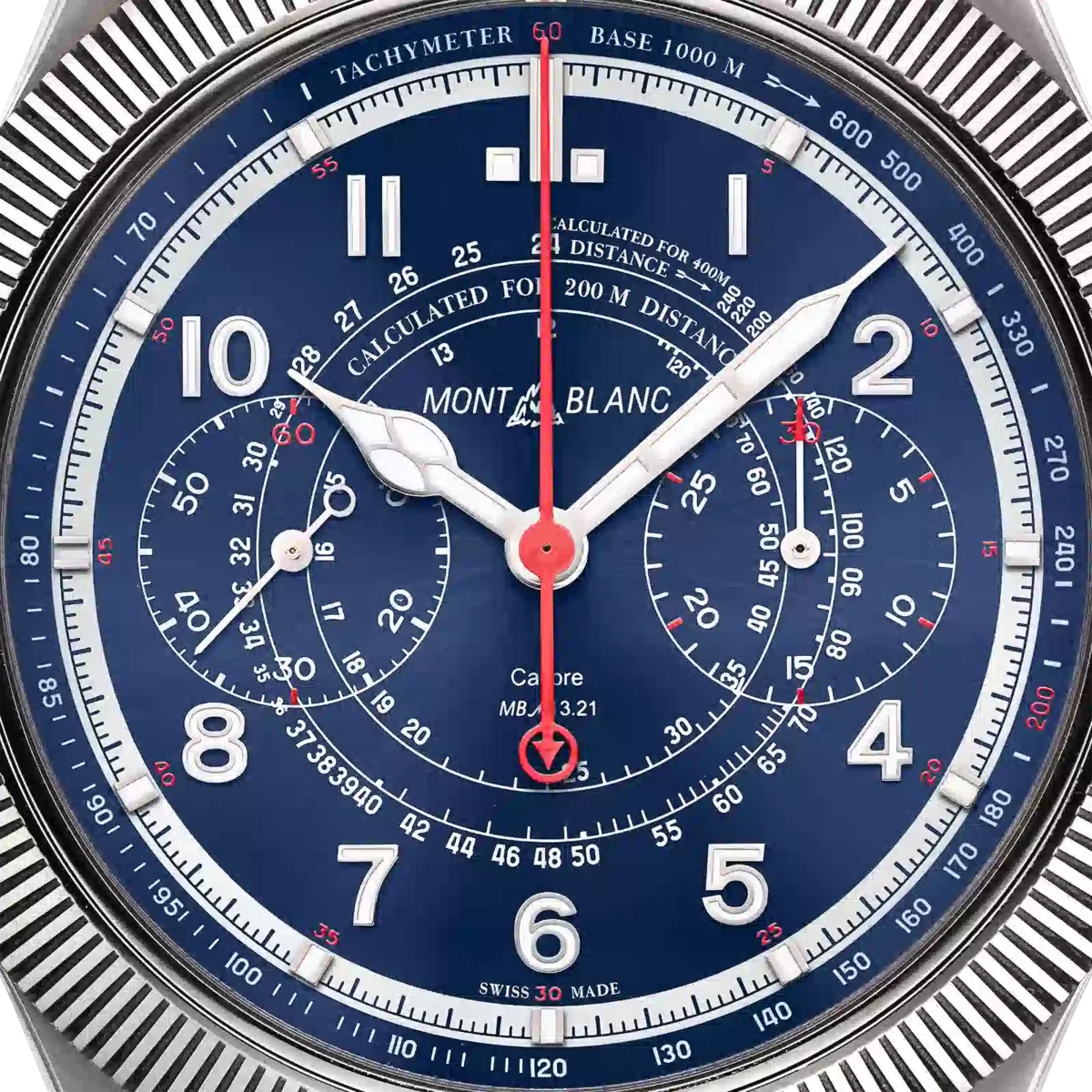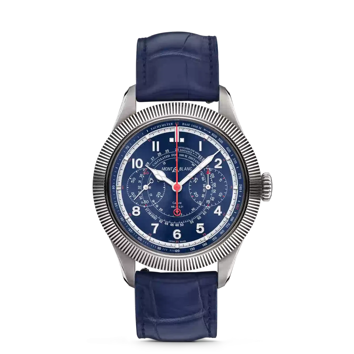 Montblanc 1858 Unveiled Timekeeper Minerva Limited Edition introducerer en helt ny kronograf-funktion. I stedet for at bruge traditionelle trykknapper aktiveres kronografen via den riflede bezel. Et enkelt klik på den riflede bezel i hvidguld 750/1000 (18 karat) starter kronografen. Et andet klik stopper den, og et tredje klik nulstiller den, hvilket forvandler kronografen, som vi kender den. Uret kommer i en 42,5 mm rustfri stålkasse og er udstyret med en blå urskive og en blå udskiftelig alligatorlæderrem. Det drives af det håndlavede, manuelt optrækkelige Caliber MB M13.21 og er begrænset til 100 eksemplarer i anledning af 100-årsdagen for Caliber 13.20, som var forfaderen til dette urværk. Identifikationsnummer MB130987 Lugbredde 21 mm